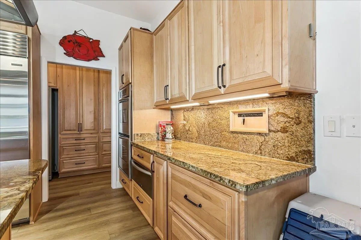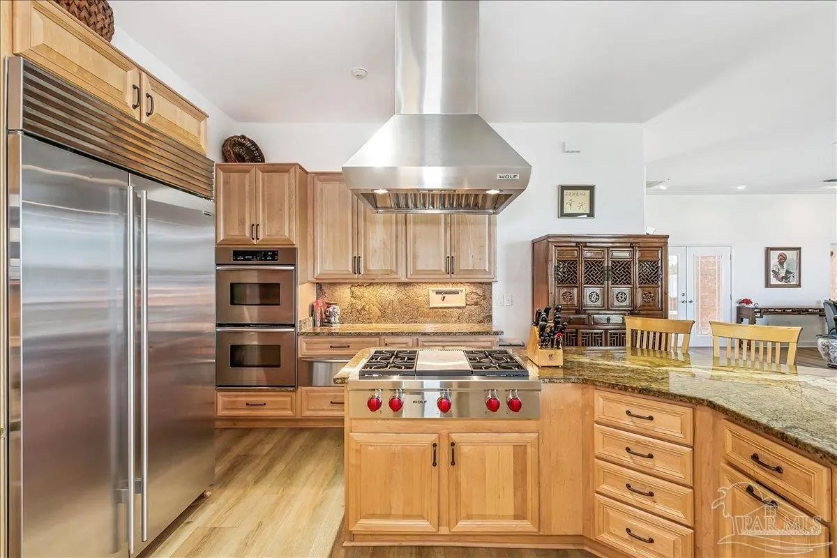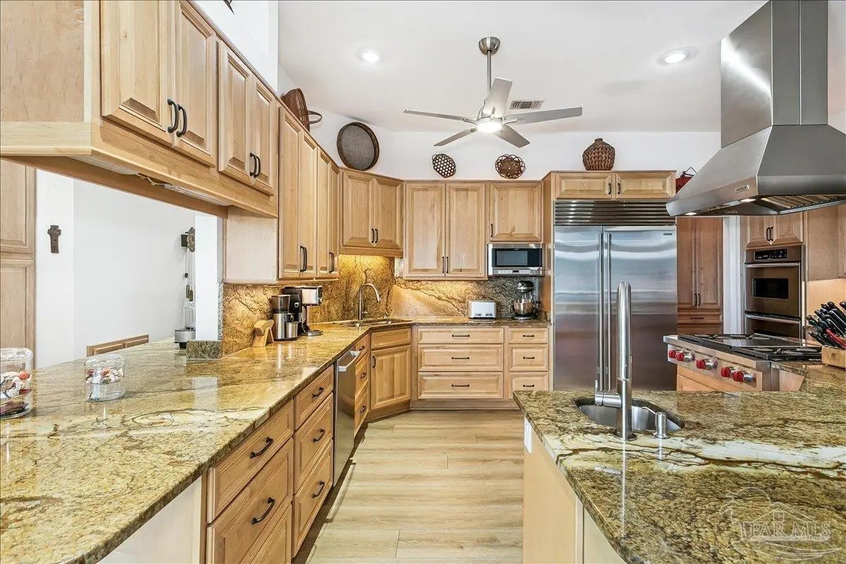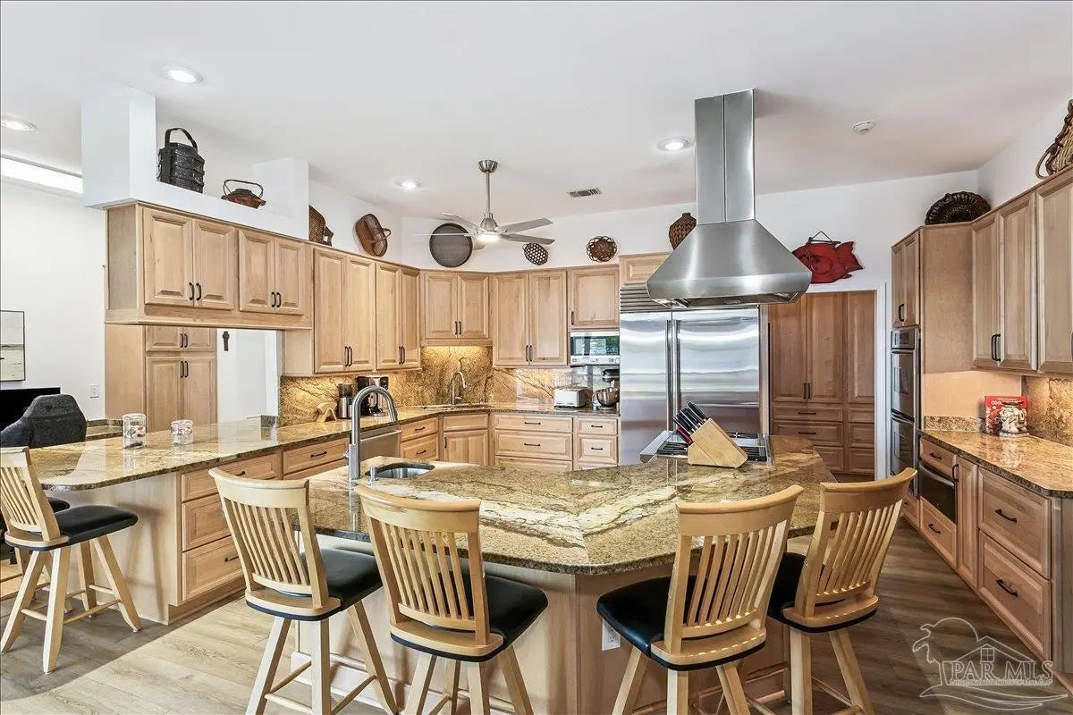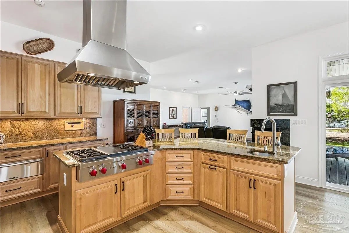 Experience this one-of-a-kind waterfront estate on East Bay, set on 1.3 acres with an impressive 189 feet of shoreline. Exceptional property features a private dock with boat lift, making it perfect for enjoying life on the water. The home offers 4 bedrooms, 2.5 baths, a 3-car garage, plus an additional carport. Step inside to discover soaring 10-foot ceilings and a thoughtfully designed layout. The spacious living room showcases stunning water views and flows seamlessly into the dining area and gourmet kitchen. The chef’s kitchen is truly remarkable, featuring a curved breakfast bar, granite countertops, abundant cabinetry, a Wolf gas cooktop, Sub-Zero refrigerator, and double wall ovens. Just beyond, a long hallway offers extensive floor-to-ceiling storage, pull-out drawers, a full-size commercial freezer, and an additional full-size refrigerator. The waterfront primary suite is a private retreat, complete with a bayed sitting area and dual entrances leading to separate half baths with organized closet systems. Additional highlights include commercial-grade luxury vinyl flooring with cork backing throughout, a guest bath with direct courtyard access, and numerous upgrades across the home. Outdoor living is equally impressive with a 37' x 50' courtyard featuring a hot tub, a covered porch, and an open patio—perfect for entertaining or relaxing while enjoying a lifestyle of boating, fishing & kayaking. This is a rare opportunity to own a truly unique waterfront property on East Bay.