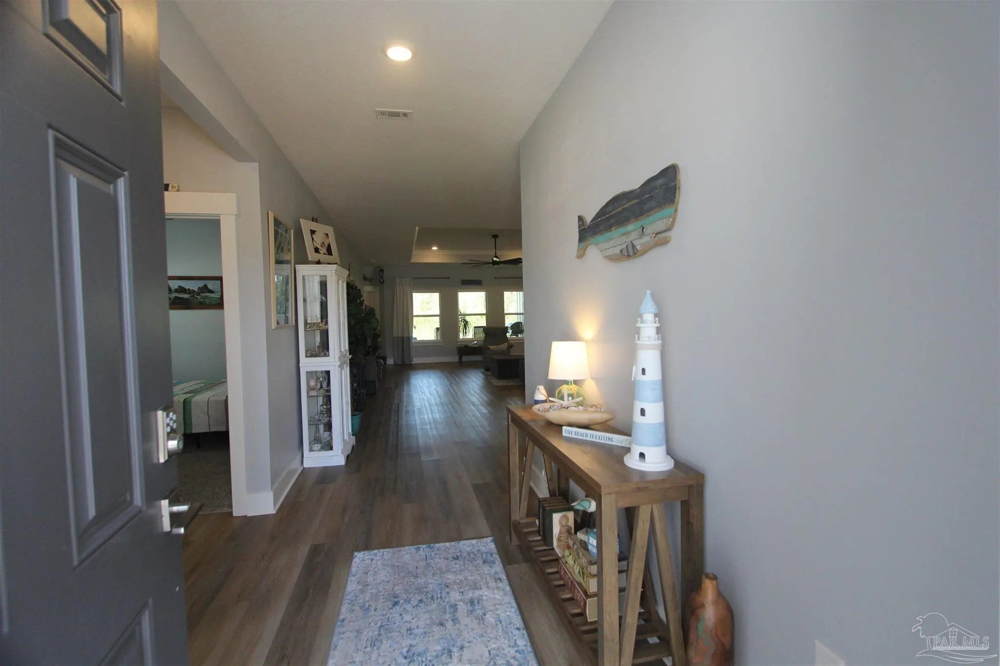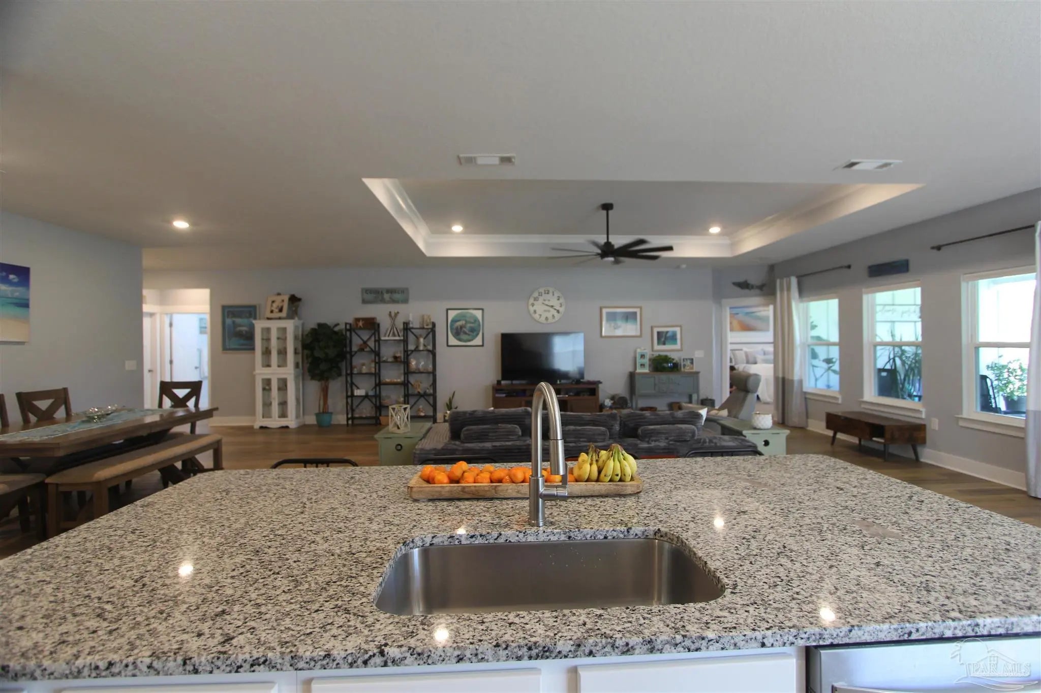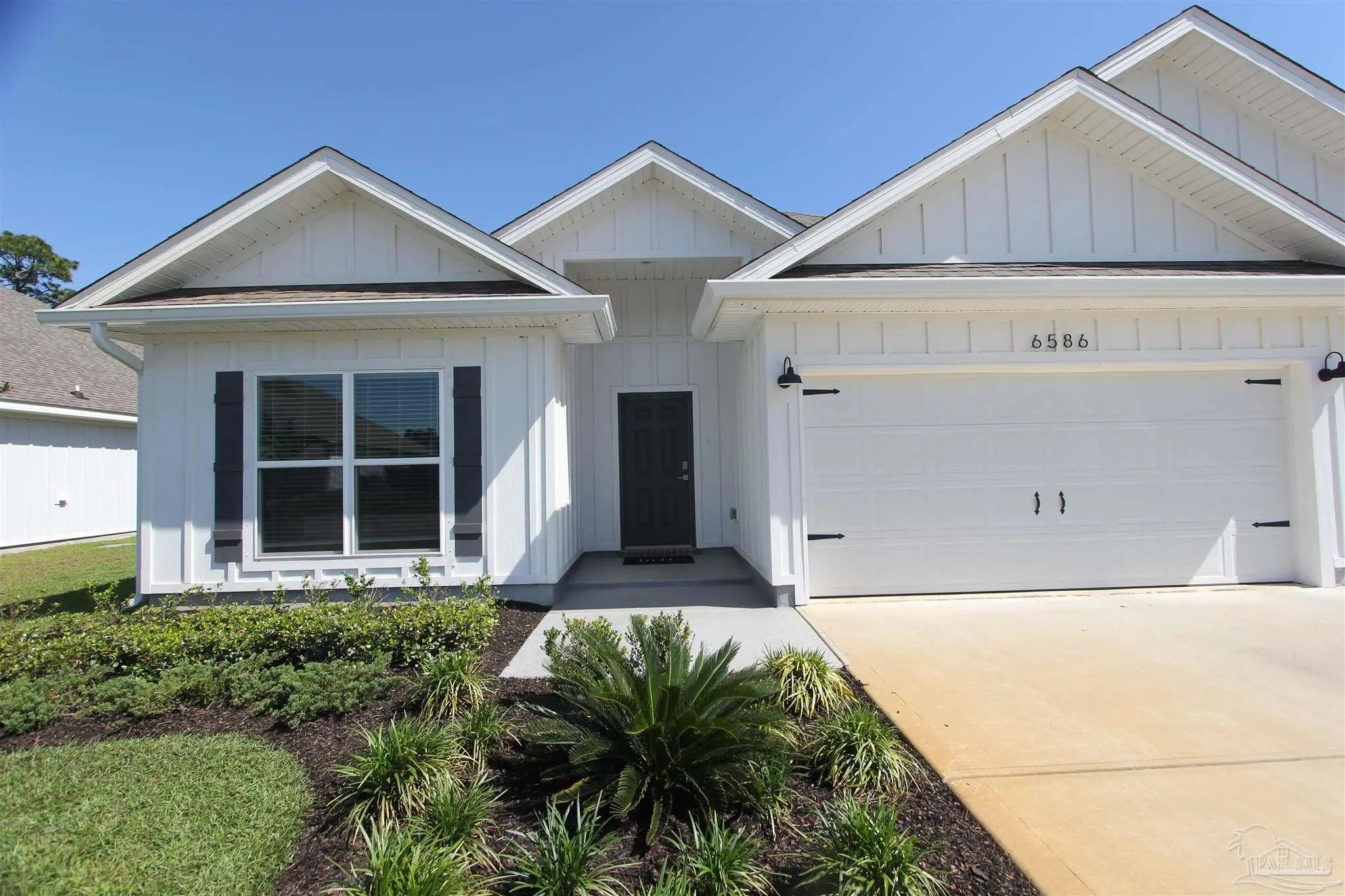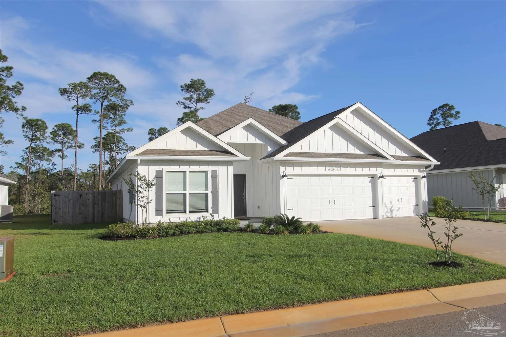 Welcome to this beautiful spacious and well maintained 4 bedroom, 3 bath home with an open coastal floor concept and a large 3 car garage in Forest Bay Estates. A highly sought after community with underground utilities, which offers a gated community pool with a pavilion and gazebo, perfect for gatherings and the weekly events. The open floor plan includes a large breakfast bar island with lots of storage space, living- dining combo, separate breakfast nook and a walk in kitchen pantry. Unique granite counter tops are throughout the home along with stainless steel and energy efficient appliances. Washer, dryer, microwave, string less blinds and curtain rods are included. The primary bedroom has a large walk in closet in the bathroom, a separate shower, double vanity and a garden tub. The home has been freshly painted recently throughout with beautiful neutral colors. Luxury LVP wood look flooring. New backsplash in kitchen. Ceiling fans in living room and primary bedroom are updated with remote control. All bedrooms and the back porch have ceiling fans. Updated lighting in all bath rooms. The property is fenced on the sides and has an unobstructed view into nature from the covered back patio and a landscaped yard with a well for irrigation. The front and back patio are sealed with Terrazzo Granite Satin Exterior anti-skid paint. For your peace of mind there is a termite bond and there are hurricane protection devices. It is conveniently located between the well known beaches of Navarre and Pensacola with access to their long piers for fishing. Public boat ramps are available at the East Bay and Santa Rosa Sound for for kayaking, paddle boarding and other water activities. Enjoy beautiful sunsets. shopping and restaurants nearby. Pensacola Navy installations, Hurlburt, Eglin and Duke are within reach.