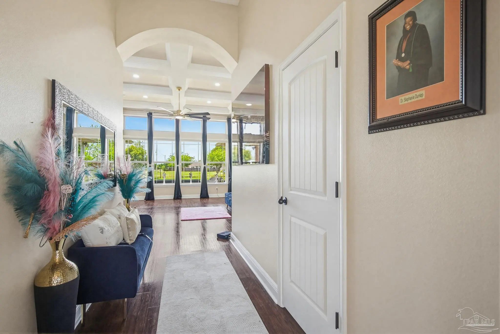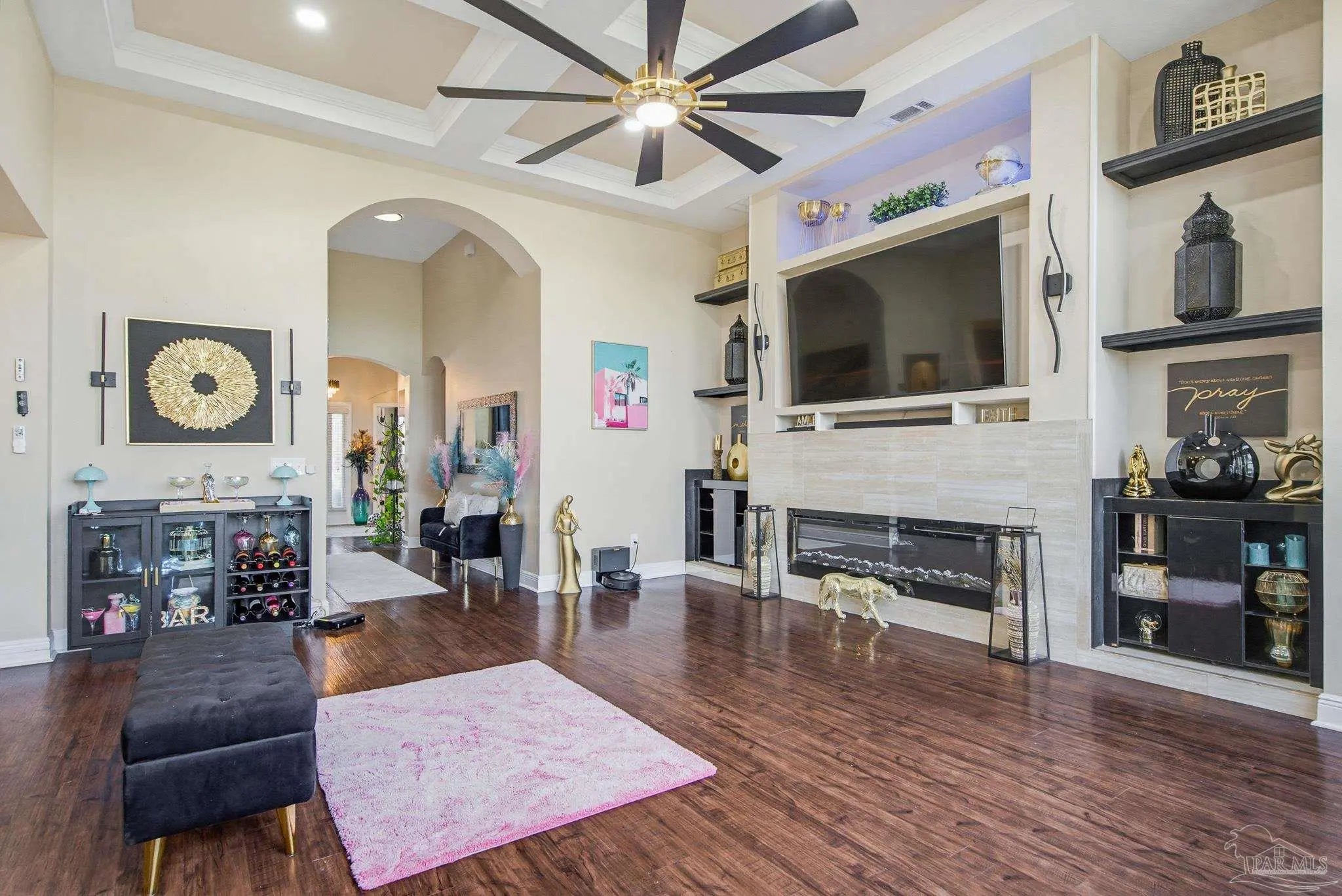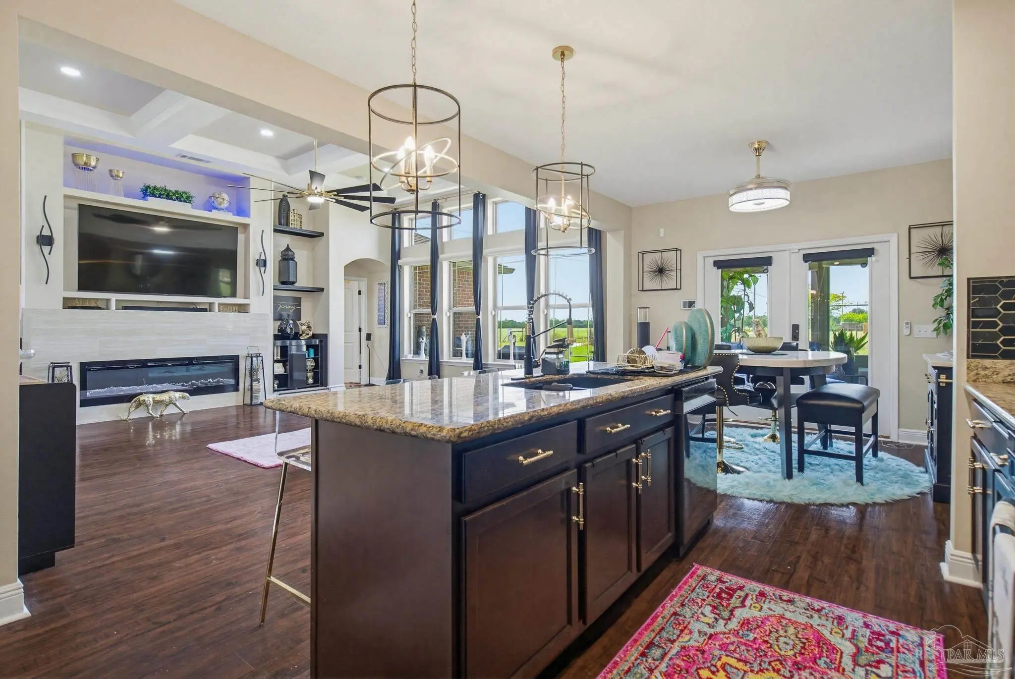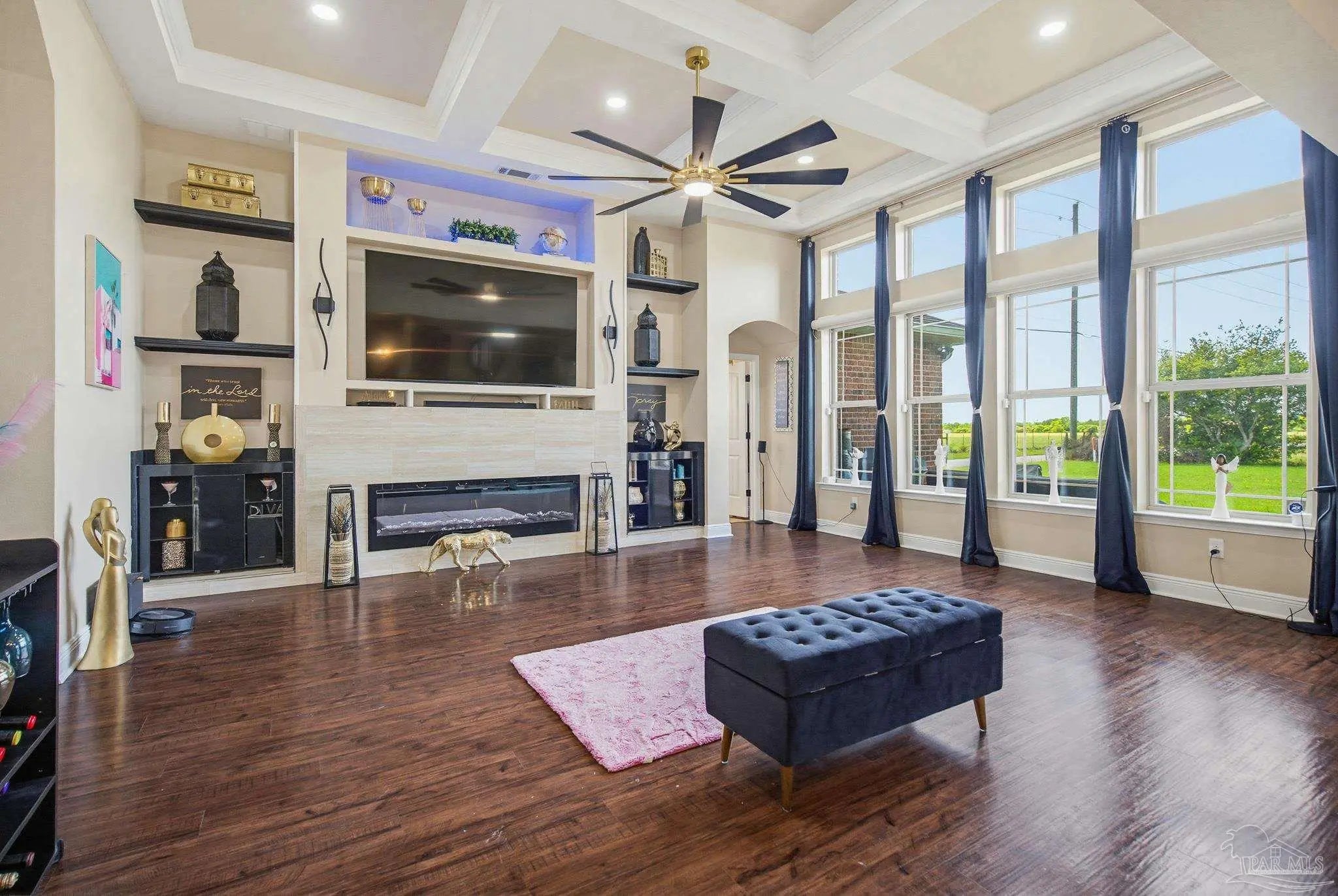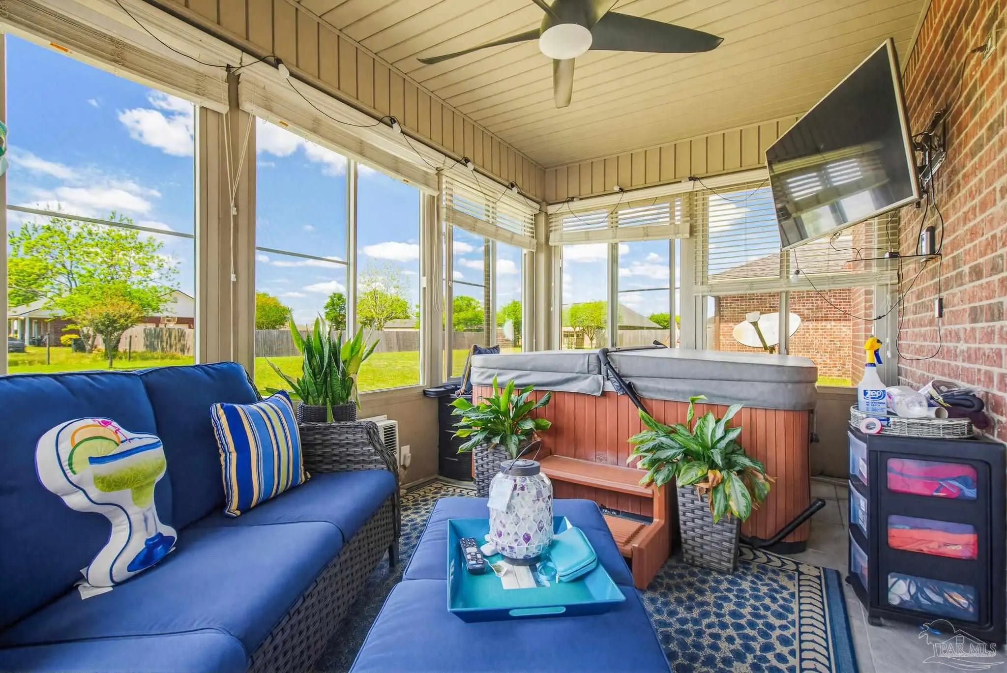 This stunning 5-bedroom, 3-bathroom home is filled with natural light and thoughtfully designed living spaces that truly inspire. The expansive great room showcases soaring cathedral ceilings, oversized windows, and rich brown flooring that creates a warm, inviting atmosphere, a custom wall unit and electric blinds. The updated chef’s kitchen features granite countertops, stainless steel appliances, and a seamless flow into the main living area—perfect for both everyday living and entertaining. Step outside to the Sunroom with the hot tub spa in the corner for those evenings when you just need to soak and relax. The spacious primary suite is a true retreat, complete with large windows, a luxurious walk-in closet with custom shelving, and a spa-like ensuite bathroom featuring dual granite vanities, a two-head spa shower. There is also a cozy sitting room adjacent to the main bedroom that can act as a retreat for reading or a home office. Additional highlights include a flexible formal dining or living space, ideal for growing families or remote work needs. This is truly a smart home with motion lights in every closet and SMART features through. There is an electric car charger in the over sized garage too. You need to see this beautiful home to truly appreciate it. Conveniently located near Navy Federal and I-10, this home offers quick access to all that Pensacola has to offer—just 20–25 minutes to shopping, downtown dining, parks, and the area’s world-famous white sand beaches.