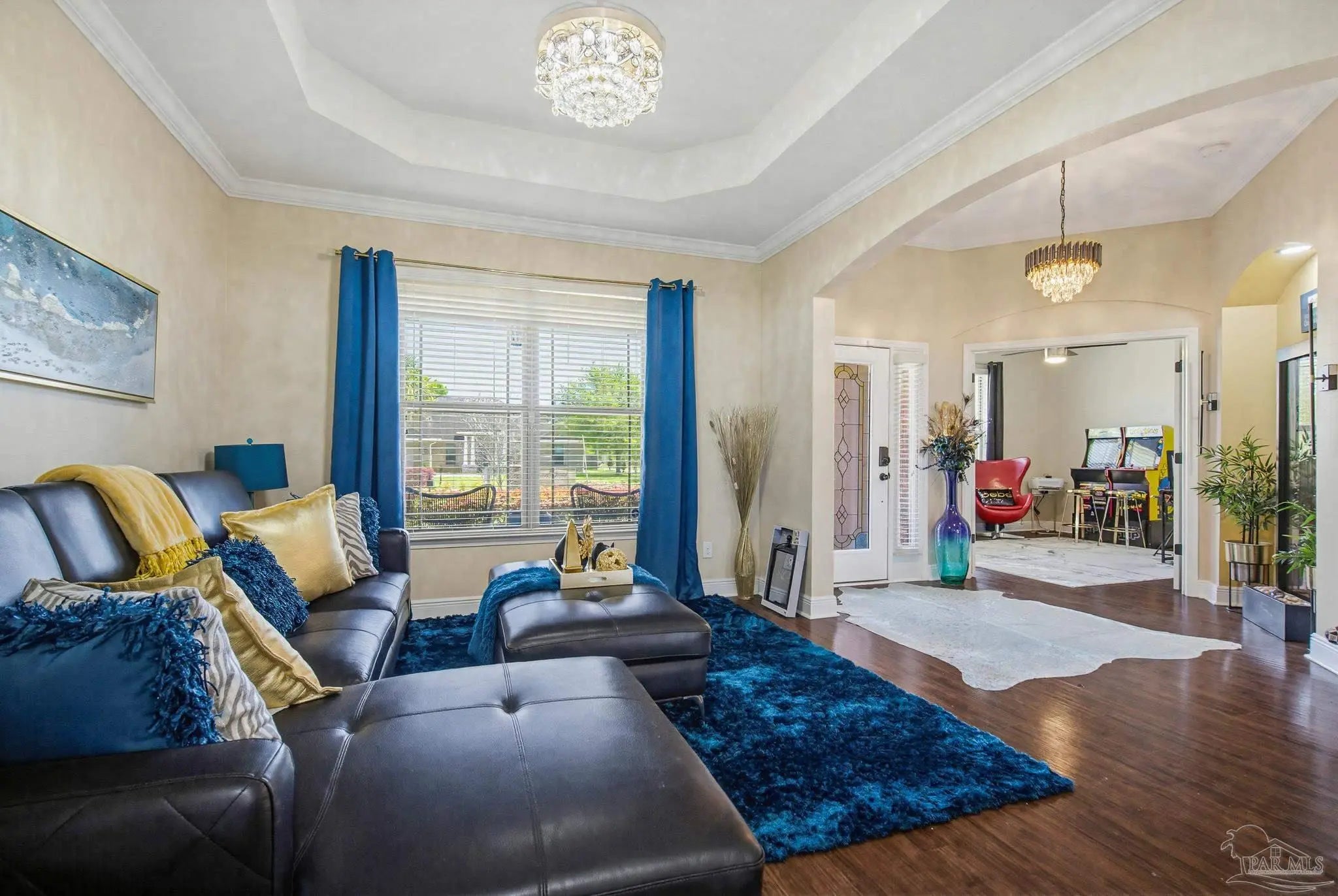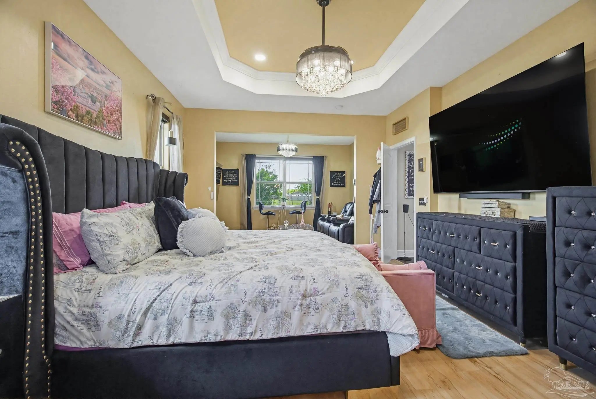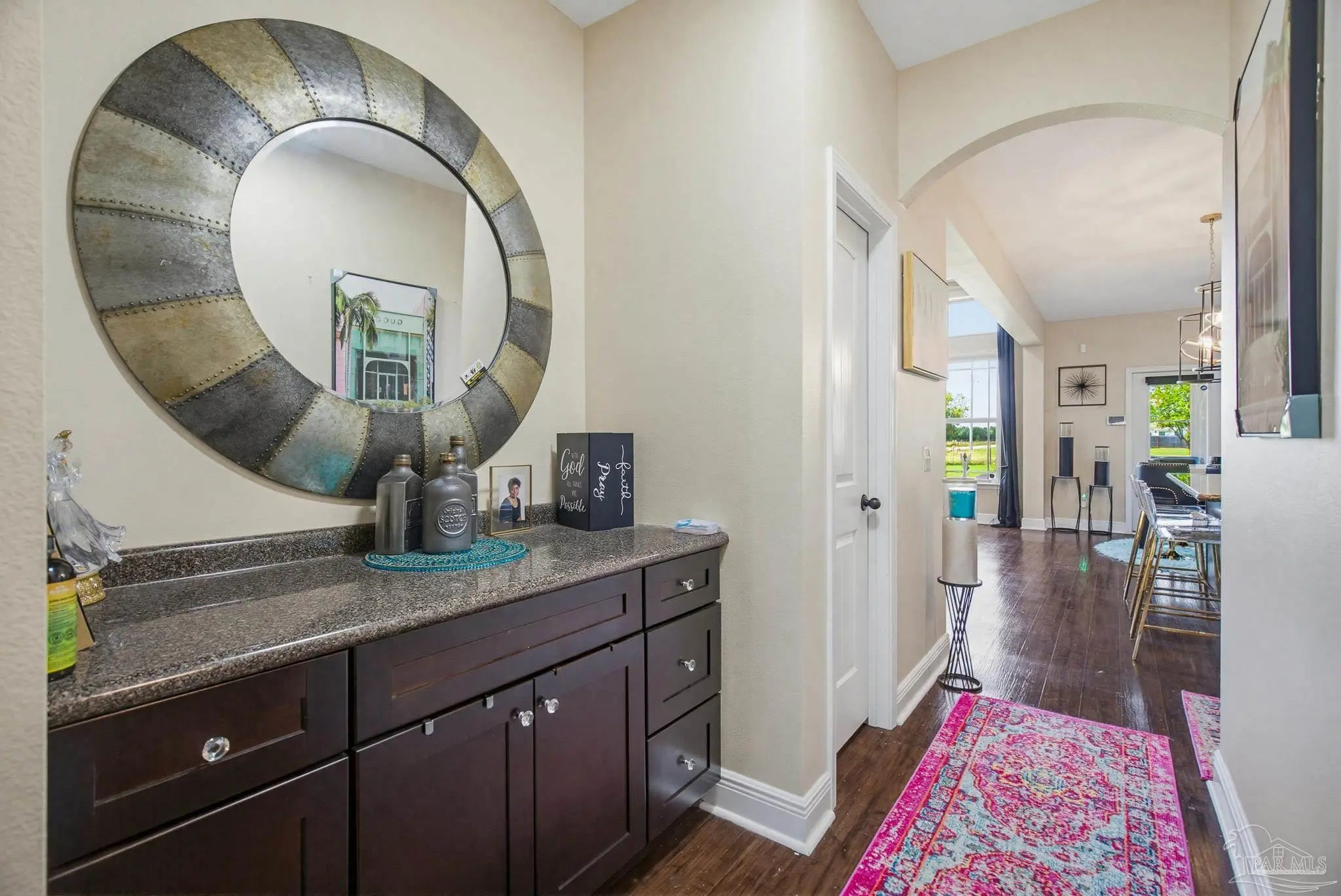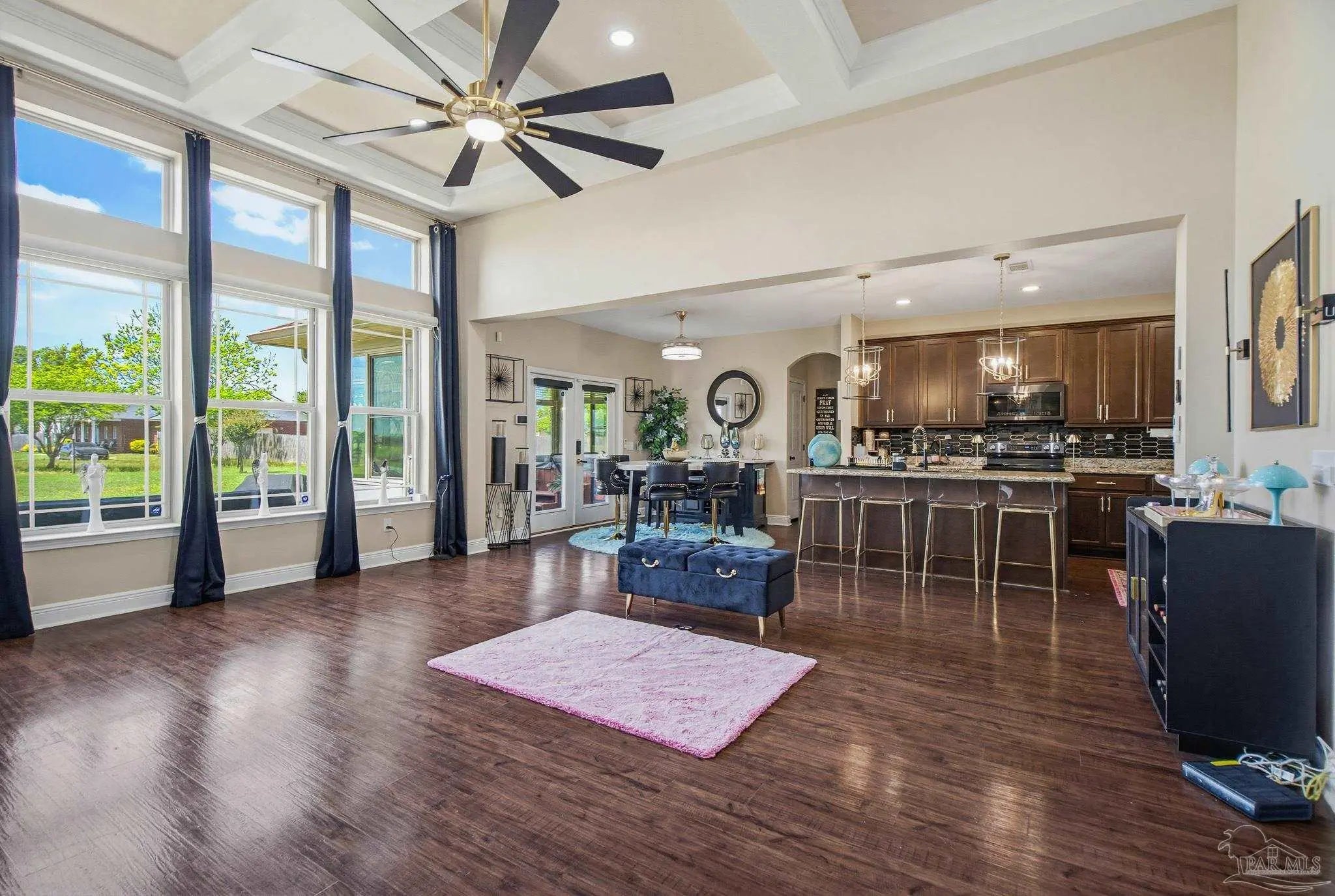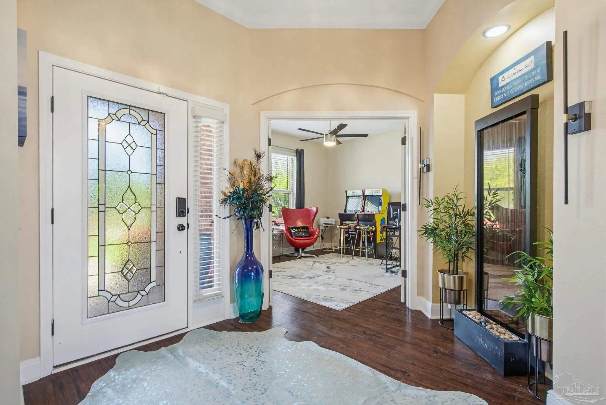 This stunning 5-bedroom, 3-bathroom home is filled with natural light and thoughtfully designed living spaces that truly inspire. The expansive great room showcases soaring cathedral ceilings, oversized windows, and rich brown flooring that creates a warm, inviting atmosphere, a custom wall unit and electric blinds. The updated chef’s kitchen features granite countertops, stainless steel appliances, and a seamless flow into the main living area—perfect for both everyday living and entertaining. Step outside to the Sunroom with the hot tub spa in the corner for those evenings when you just need to soak and relax. The spacious primary suite is a true retreat, complete with large windows, a luxurious walk-in closet with custom shelving, and a spa-like ensuite bathroom featuring dual granite vanities, a two-head spa shower. There is also a cozy sitting room adjacent to the main bedroom that can act as a retreat for reading or a home office. Additional highlights include a flexible formal dining or living space, ideal for growing families or remote work needs. This is truly a smart home with motion lights in every closet and SMART features through. There is an electric car charger in the over sized garage too. You need to see this beautiful home to truly appreciate it. Conveniently located near Navy Federal and I-10, this home offers quick access to all that Pensacola has to offer—just 20–25 minutes to shopping, downtown dining, parks, and the area’s world-famous white sand beaches.