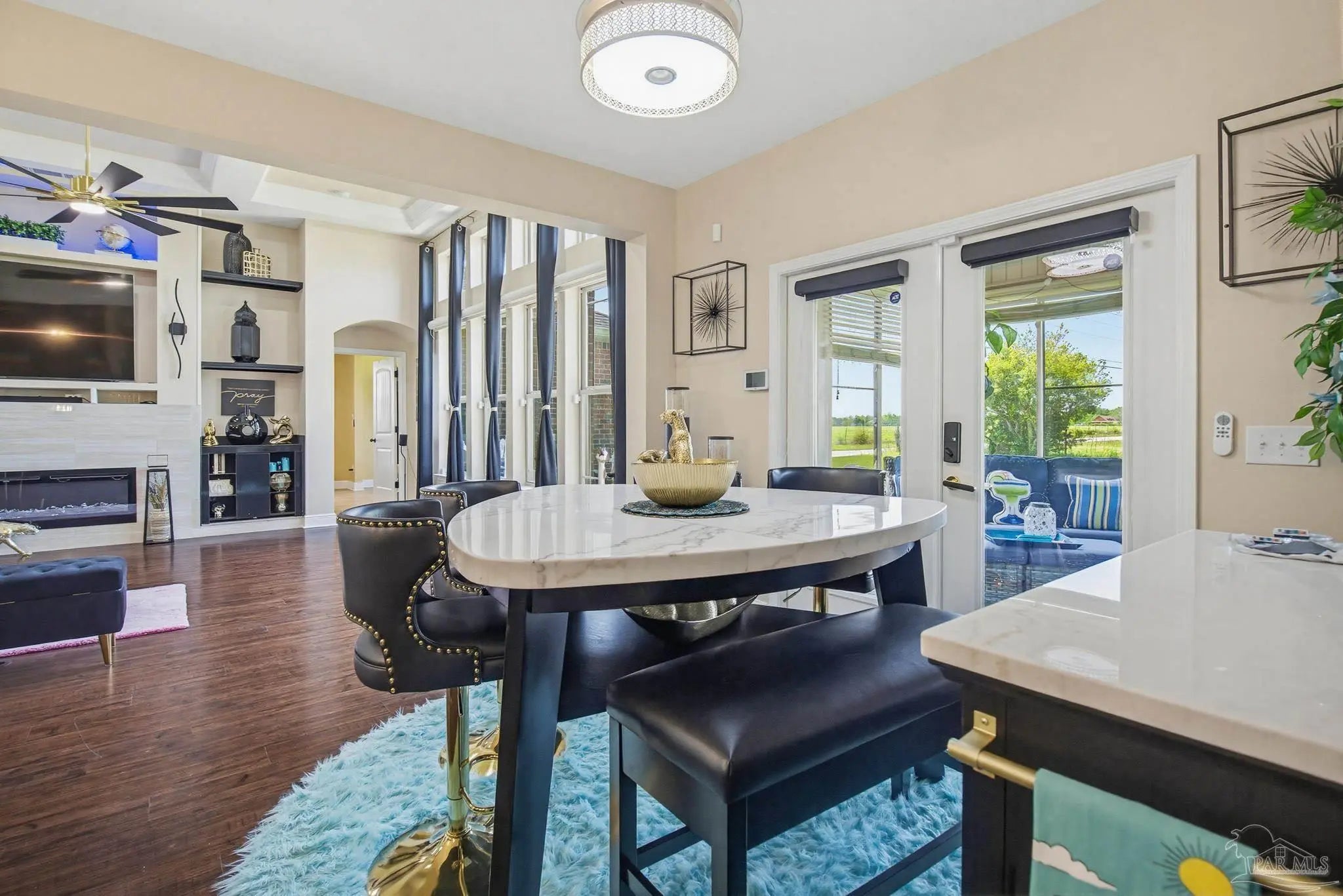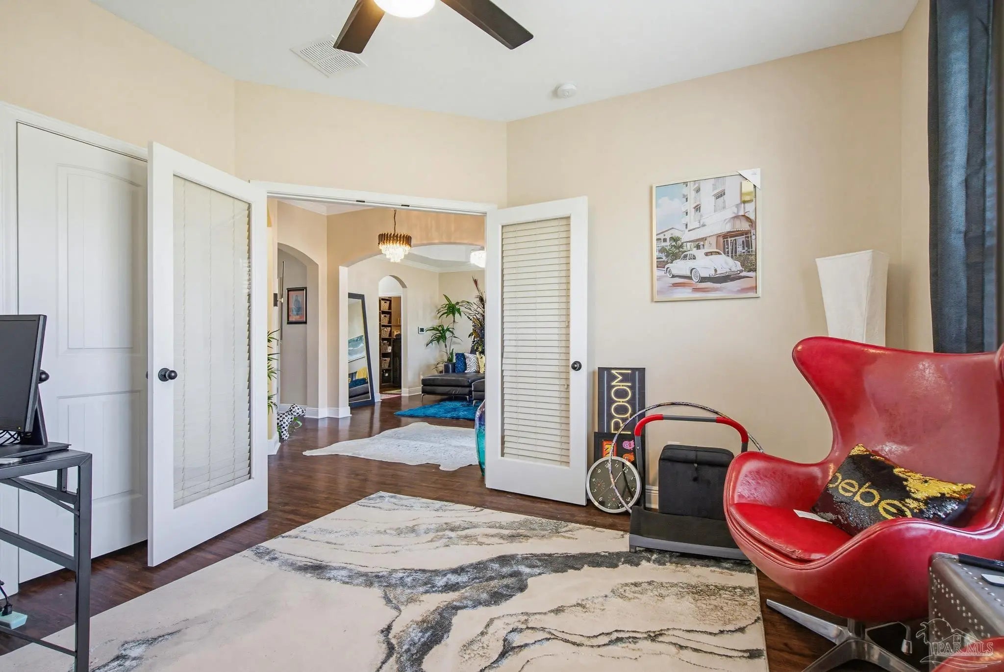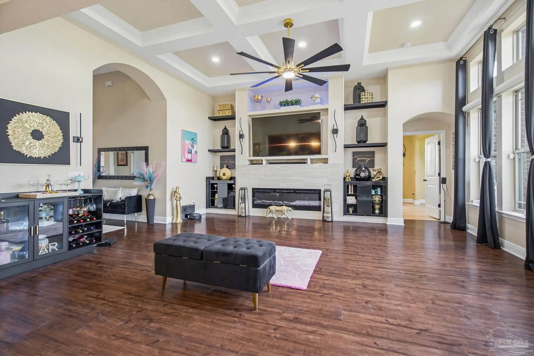 - Bookcases, Ceiling Fan(s), High Ceilings, Recessed Lighting, Office/Study, Sun Room