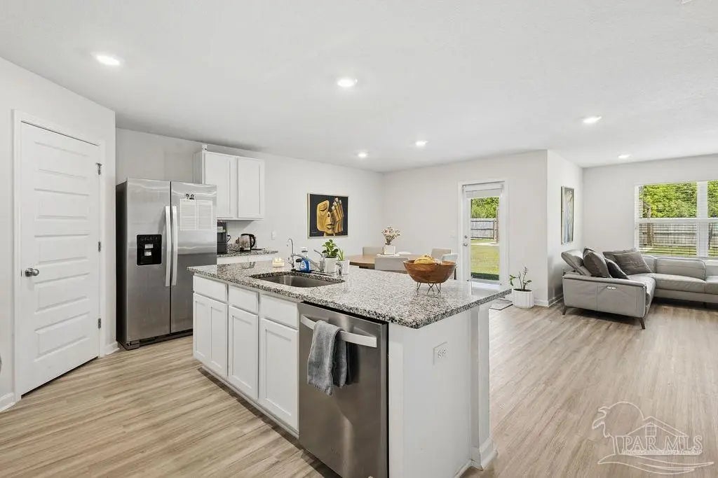 Located in the desirable Saddlebrook Estates community in Chumuckla, this 2023-built home sits on a spacious 1-acre corner lot, offering the perfect blend of newer construction and functional country living. This 4-bedroom, 2-bath home features 1,787 square feet with a well-designed layout and a 2-car garage. Inside, you’ll find LVP flooring throughout, creating a seamless, low-maintenance flow across the entire home. Step outside and the property really shines—fully fenced with a covered concrete sitting area, plus an additional circular concrete firepit space designed for gathering, hosting, and enjoying the setting. Gutters are already in place, and a concrete pad off the cul-de-sac area adds even more versatility for parking, storage, or future use. Serviced by Chumuckla Water and EREC utilities, and positioned in one of the area’s most sought-after locations, this property checks the boxes for buyers looking for space, functionality, and a newer home without the wait.