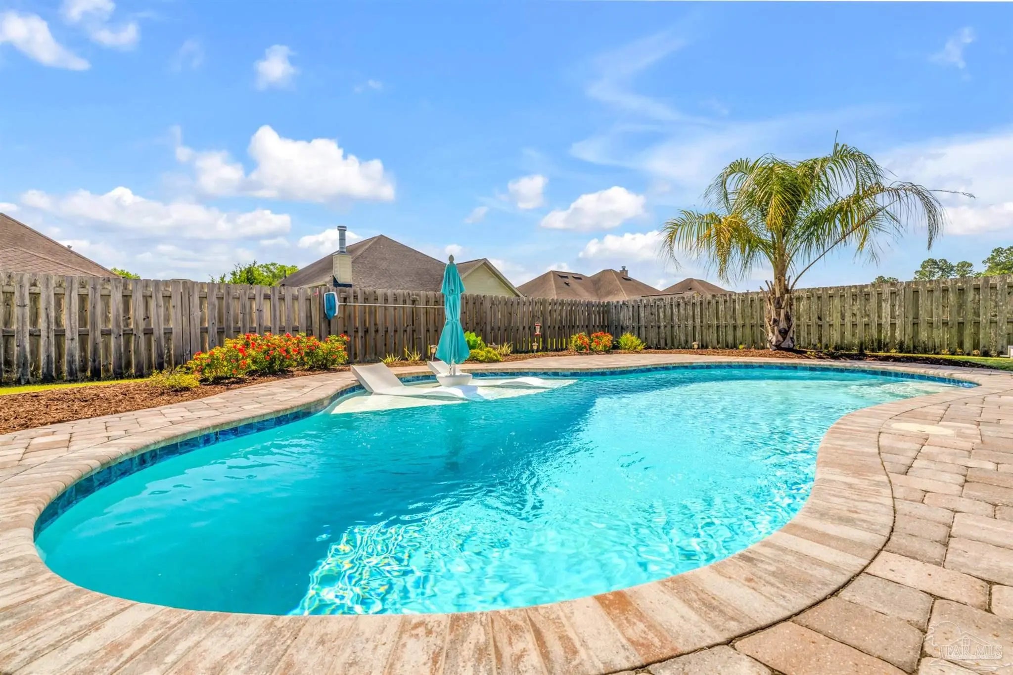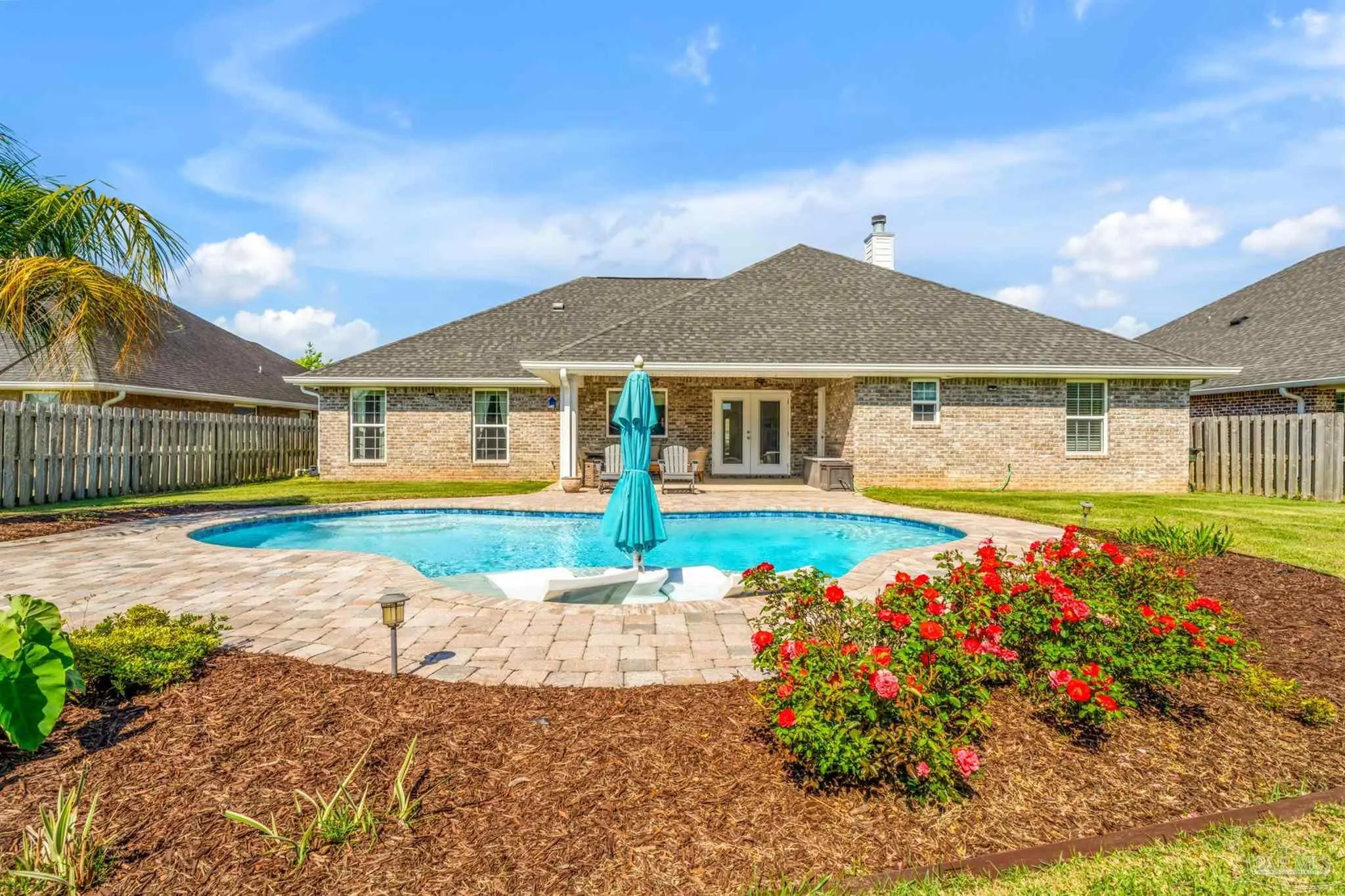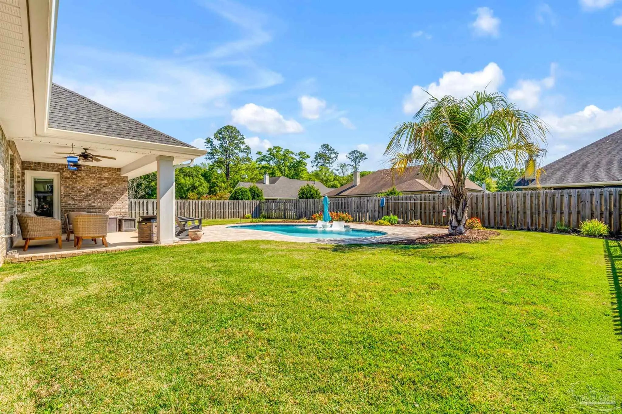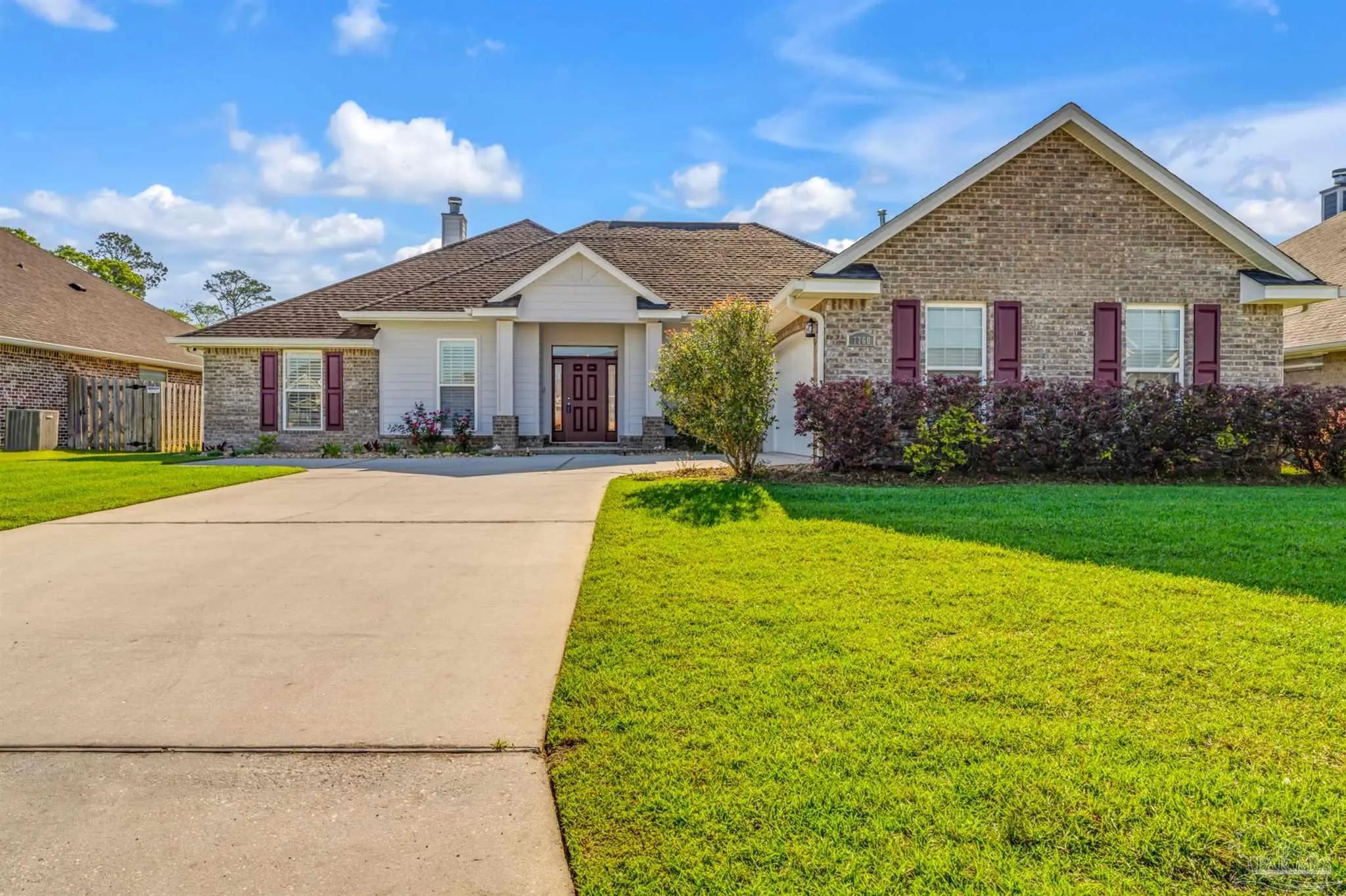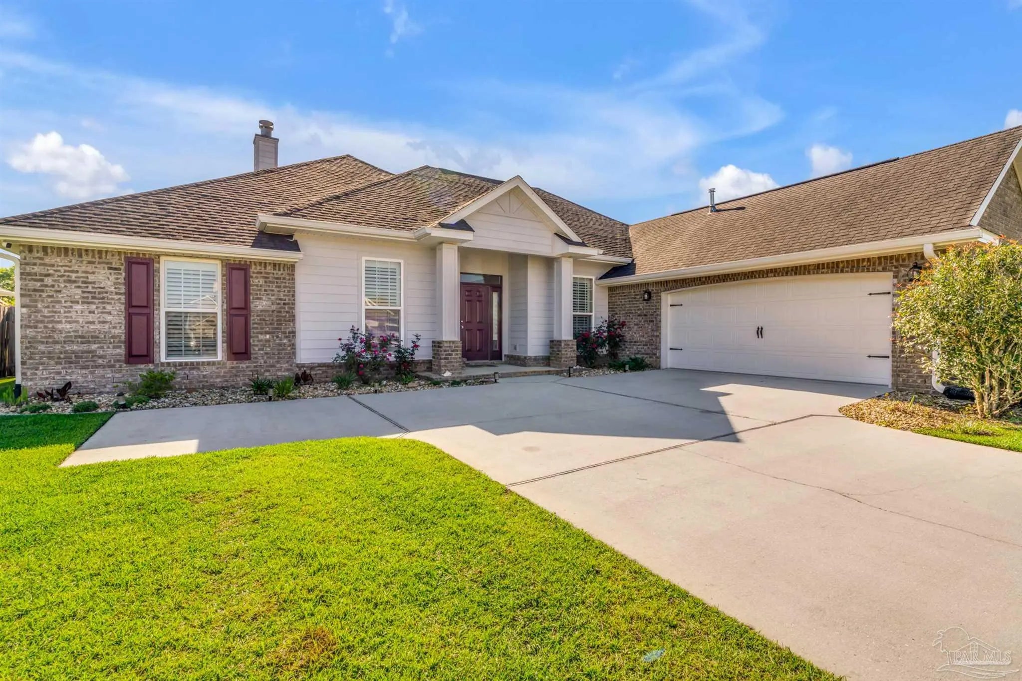 GATED COMMUNITY! Step into the 2016 model home that defined luxury for the area. This stunning brick masterpiece features the highly sought-after 2402 Blueridge floorplan, celebrated for its seamless flow and architectural character. The heart of the home is a gourmet kitchen highlighted by a dramatic brick archway that leads into a spacious living room centered around a cozy fireplace. The arched doorways lead you through the house. The expansive master suite serves as a true retreat, boasting elegant tray ceilings and a spa-like bath complete with a double vanity, garden tub, separate shower, and a massive walk-in closet. Designed with versatility in mind, the floorplan includes a private second bedroom perfect for an in-law suite, while the third and fourth bedrooms are tucked away in their own wing for maximum privacy. Outside, your personal oasis awaits. The lushly landscaped backyard features a covered porch and a sparkling Gunite pool cradled by premium pavers, featuring a shallow reef ledge specifically designed for your favorite pool loungers—the ultimate way to cool off during Florida summers. HVAC is only 1 year old. Perfectly situated just minutes from Navy Federal, Publix, and local dining, this home is move-in ready with a quick closing timeline available. Experience firsthand why this remains one of the most popular layouts in the region.