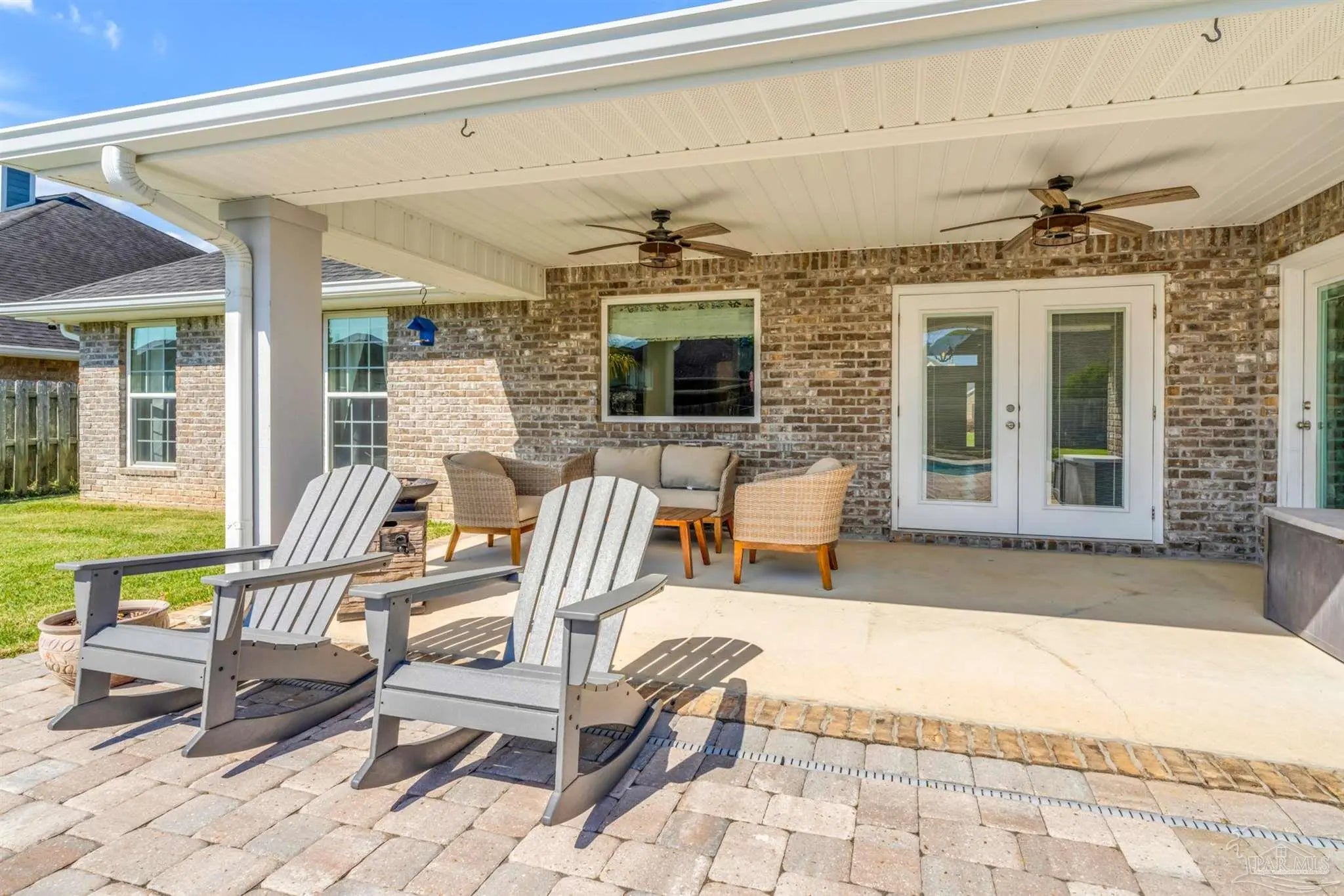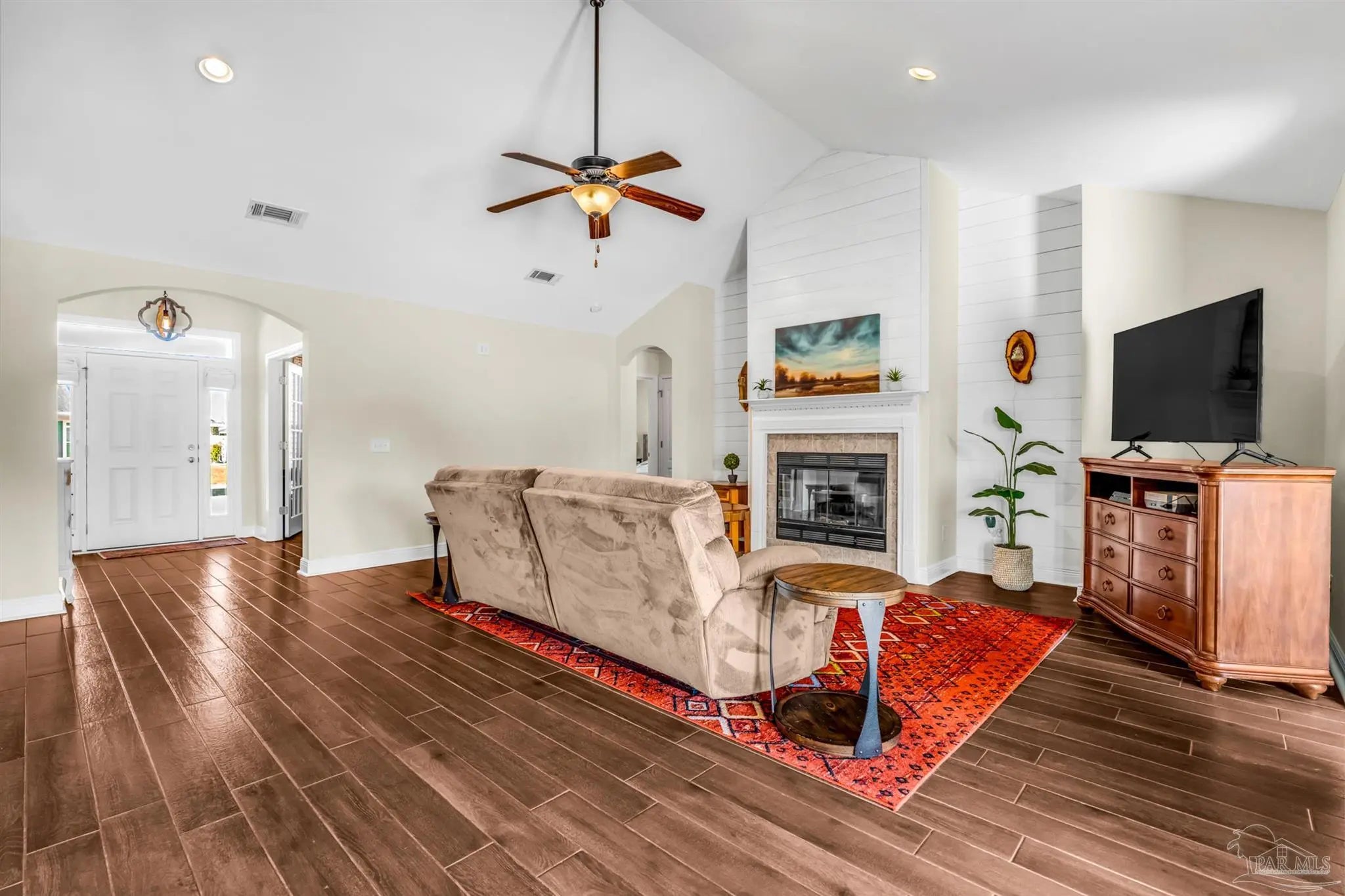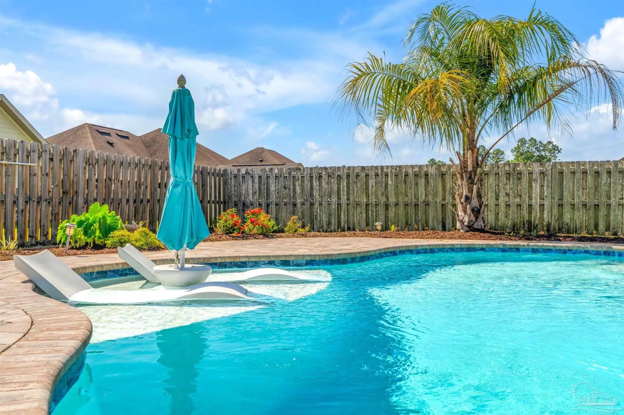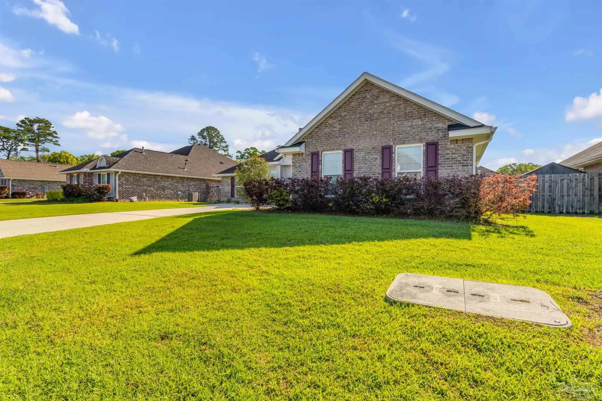 GATED COMMUNITY! Step into the 2016 model home that defined luxury for the area. This stunning brick masterpiece features the highly sought-after 2402 Blueridge floorplan, celebrated for its seamless flow and architectural character. The heart of the home is a gourmet kitchen highlighted by a dramatic brick archway that leads into a spacious living room centered around a cozy fireplace. The arched doorways lead you through the house. The expansive master suite serves as a true retreat, boasting elegant tray ceilings and a spa-like bath complete with a double vanity, garden tub, separate shower, and a massive walk-in closet. Designed with versatility in mind, the floorplan includes a private second bedroom perfect for an in-law suite, while the third and fourth bedrooms are tucked away in their own wing for maximum privacy. Outside, your personal oasis awaits. The lushly landscaped backyard features a covered porch and a sparkling Gunite pool cradled by premium pavers, featuring a shallow reef ledge specifically designed for your favorite pool loungers—the ultimate way to cool off during Florida summers. HVAC is only 1 year old. Perfectly situated just minutes from Navy Federal, Publix, and local dining, this home is move-in ready with a quick closing timeline available. Experience firsthand why this remains one of the most popular layouts in the region.