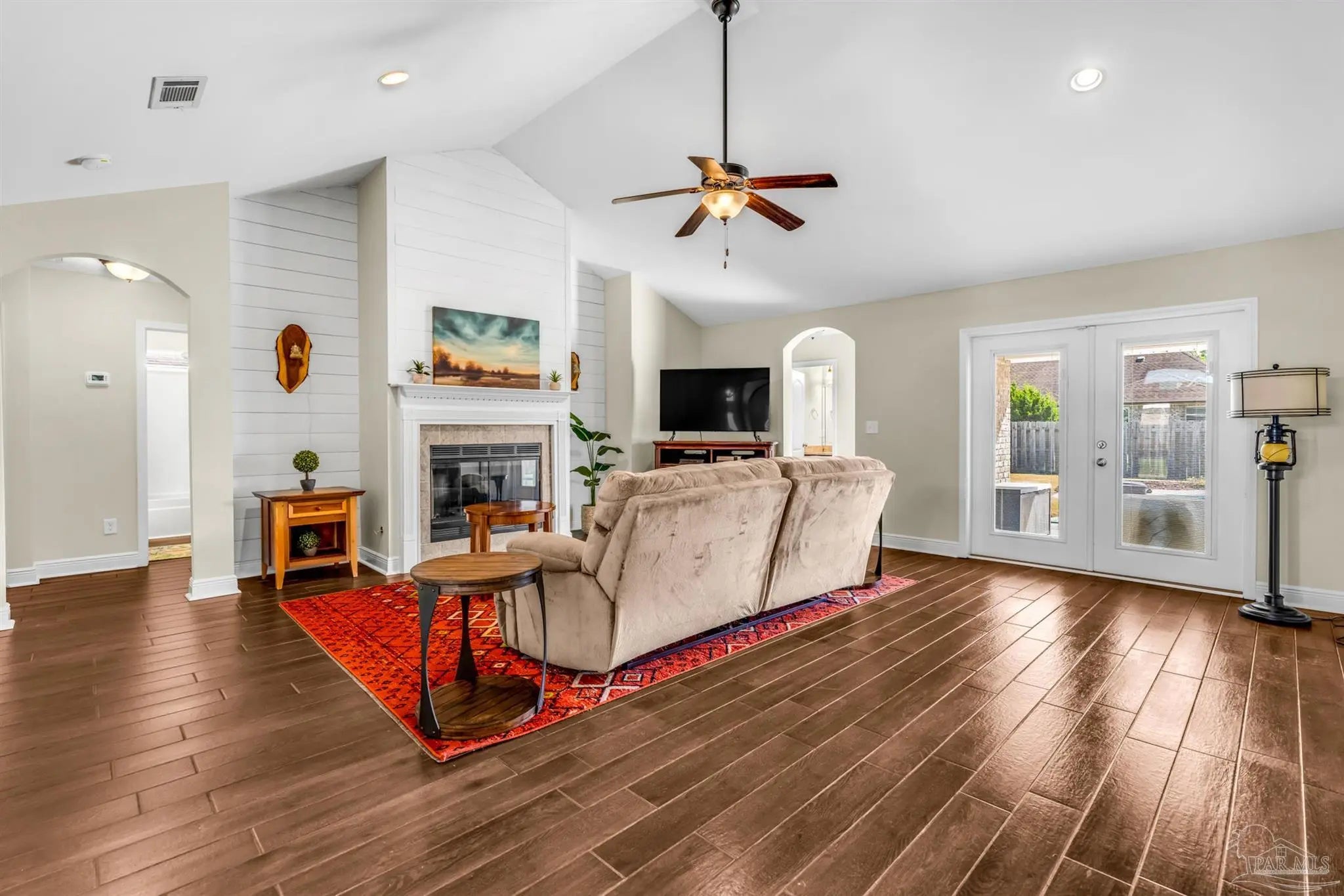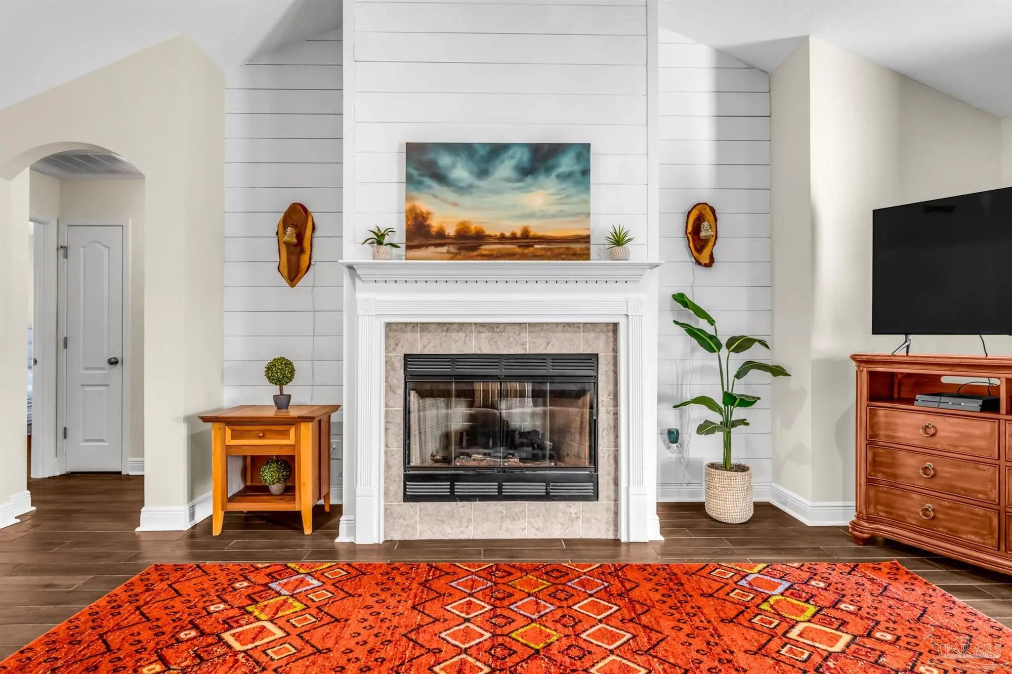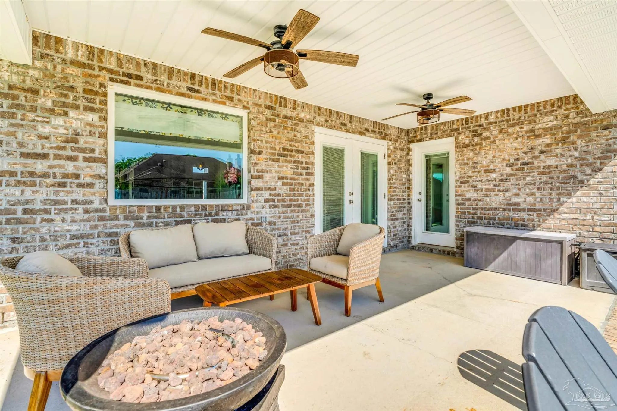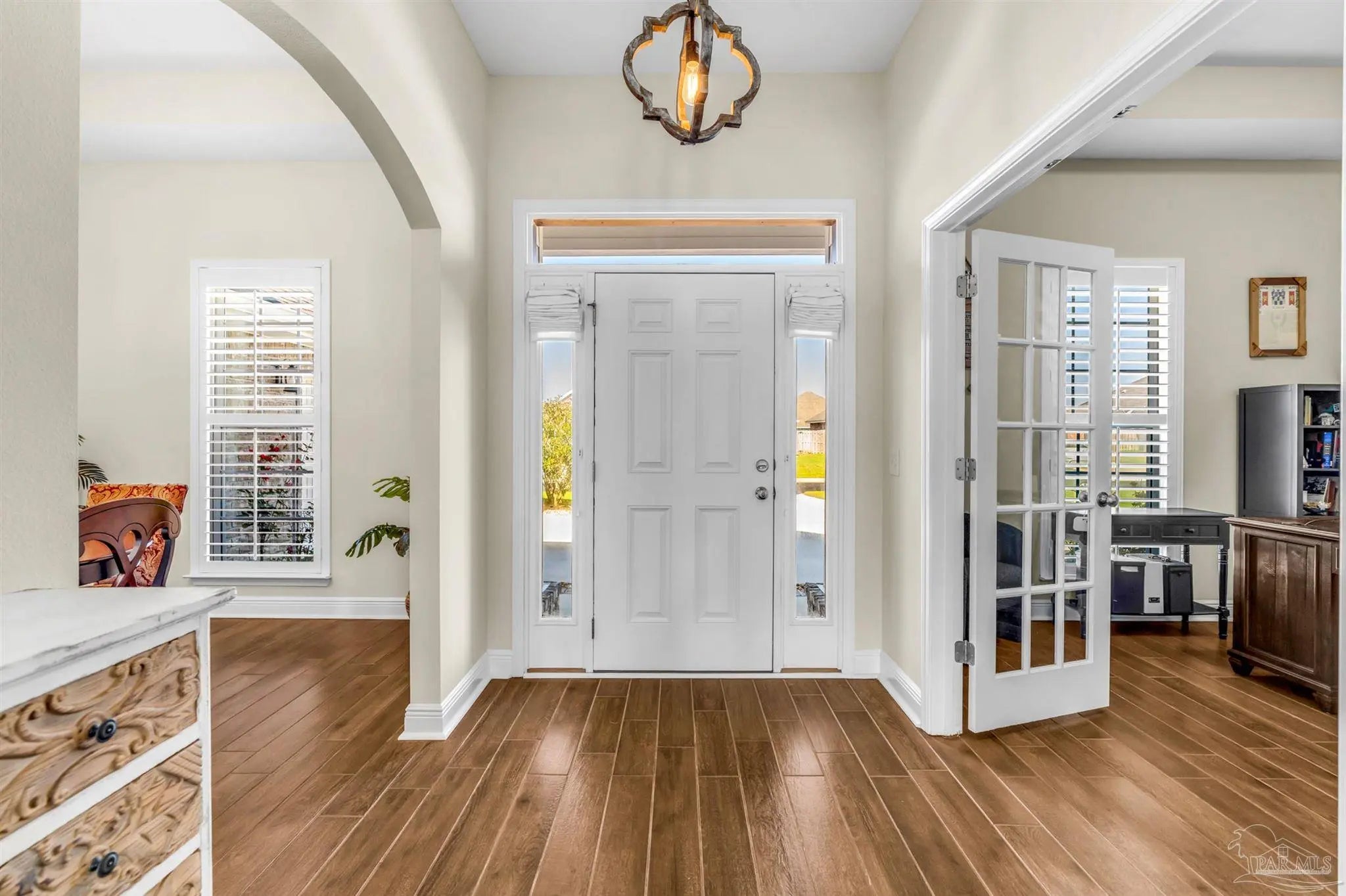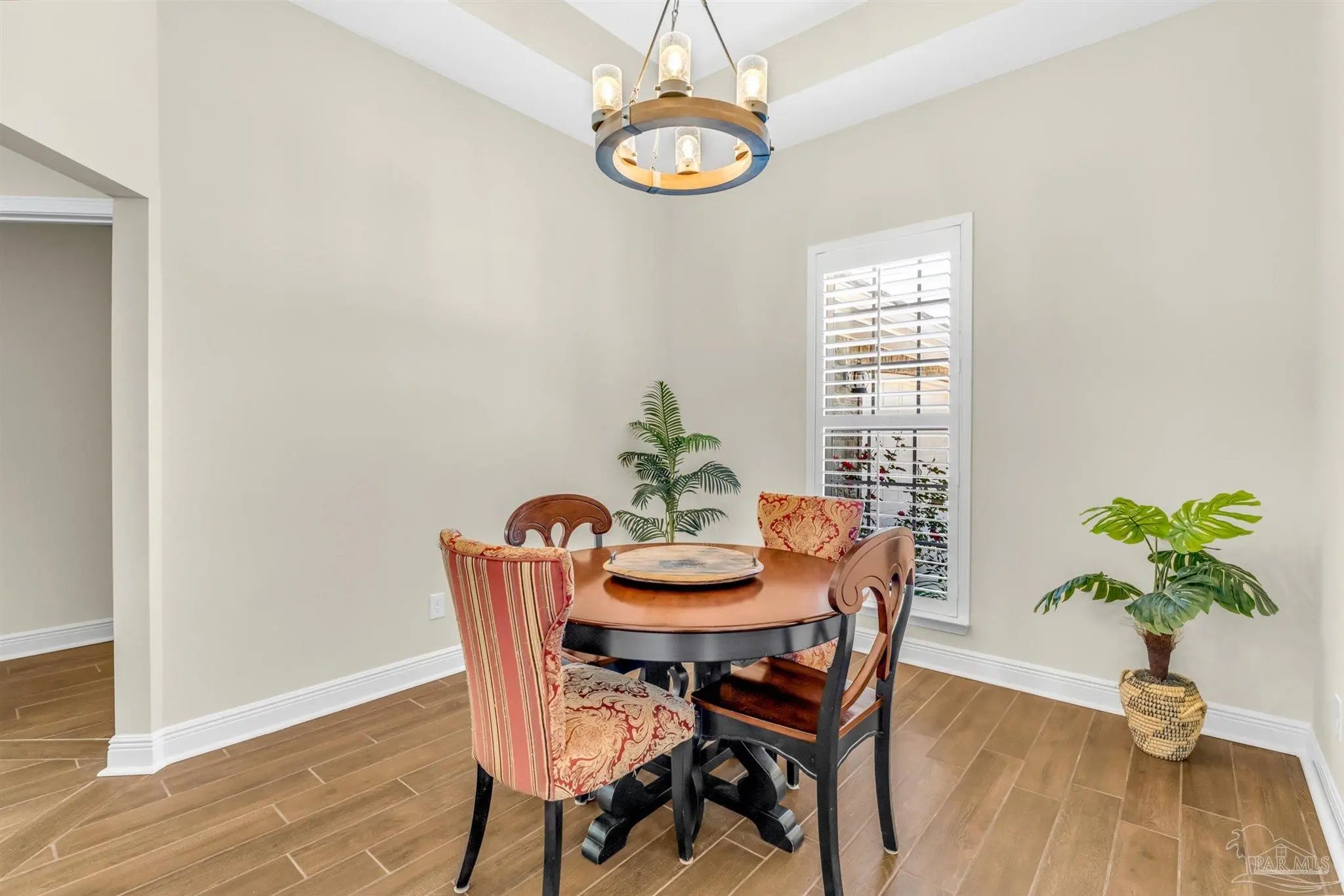 GATED COMMUNITY! Step into the 2016 model home that defined luxury for the area. This stunning brick masterpiece features the highly sought-after 2402 Blueridge floorplan, celebrated for its seamless flow and architectural character. The heart of the home is a gourmet kitchen highlighted by a dramatic brick archway that leads into a spacious living room centered around a cozy fireplace. The arched doorways lead you through the house. The expansive master suite serves as a true retreat, boasting elegant tray ceilings and a spa-like bath complete with a double vanity, garden tub, separate shower, and a massive walk-in closet. Designed with versatility in mind, the floorplan includes a private second bedroom perfect for an in-law suite, while the third and fourth bedrooms are tucked away in their own wing for maximum privacy. Outside, your personal oasis awaits. The lushly landscaped backyard features a covered porch and a sparkling Gunite pool cradled by premium pavers, featuring a shallow reef ledge specifically designed for your favorite pool loungers—the ultimate way to cool off during Florida summers. HVAC is only 1 year old. Perfectly situated just minutes from Navy Federal, Publix, and local dining, this home is move-in ready with a quick closing timeline available. Experience firsthand why this remains one of the most popular layouts in the region.