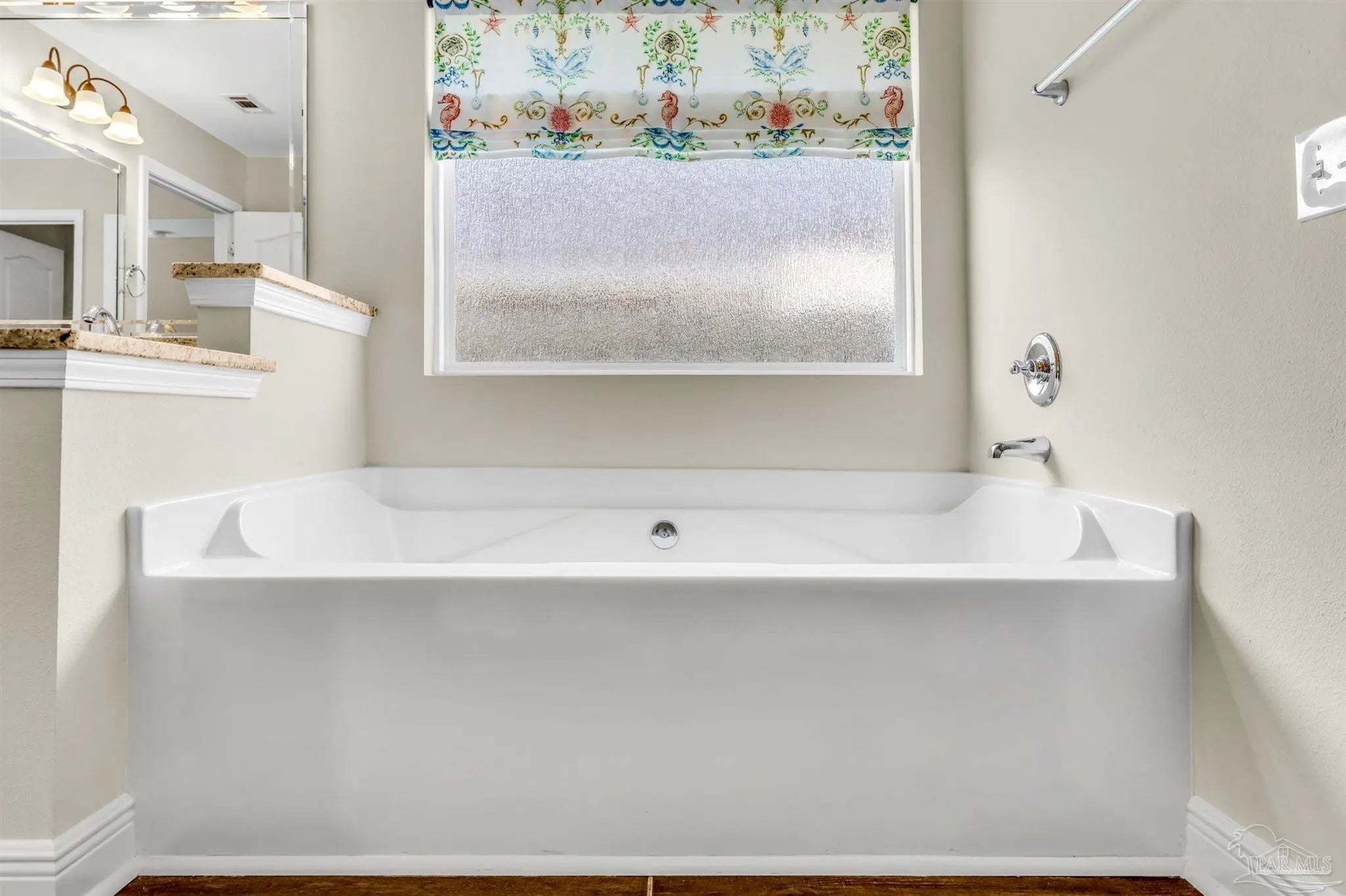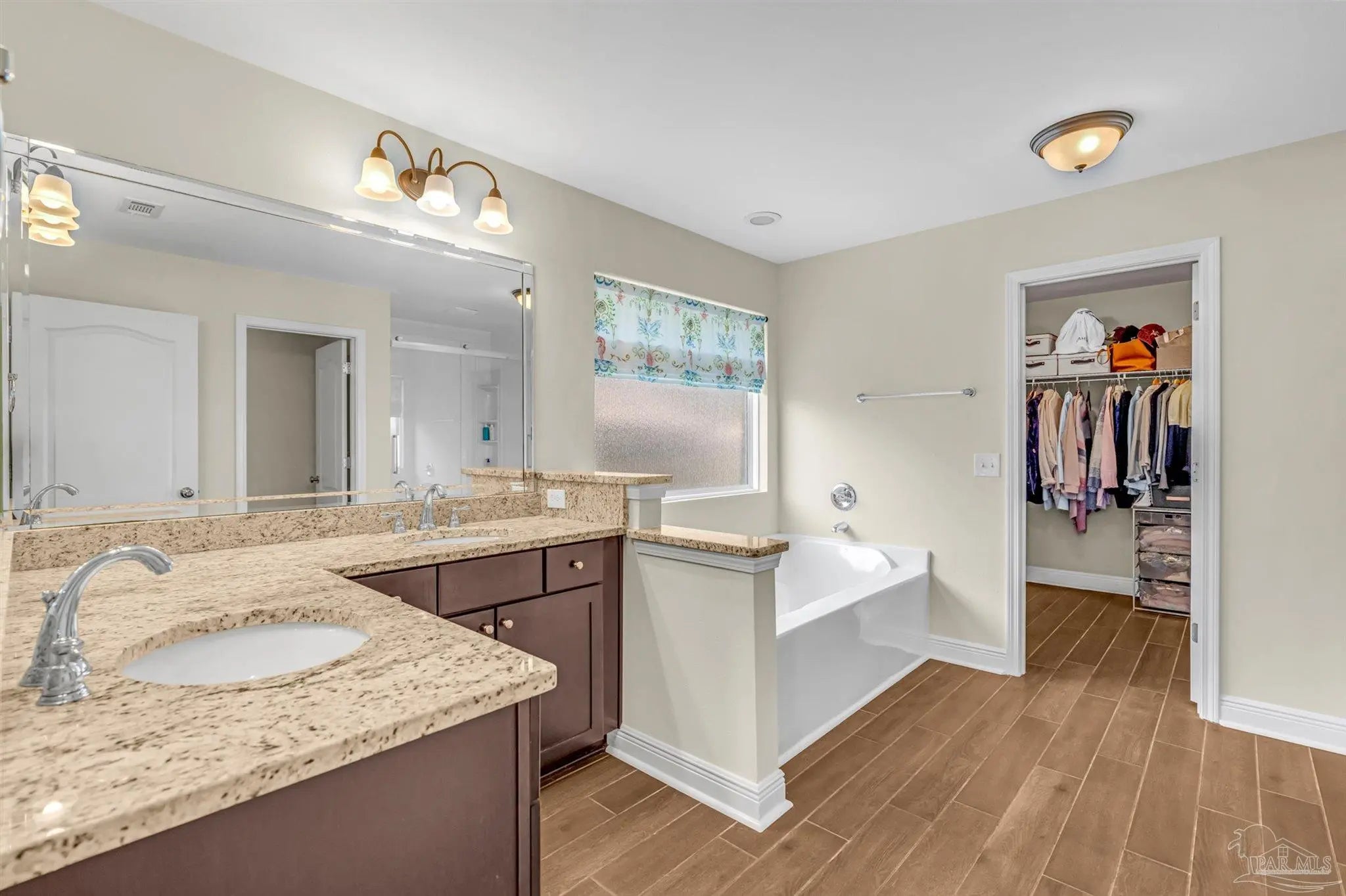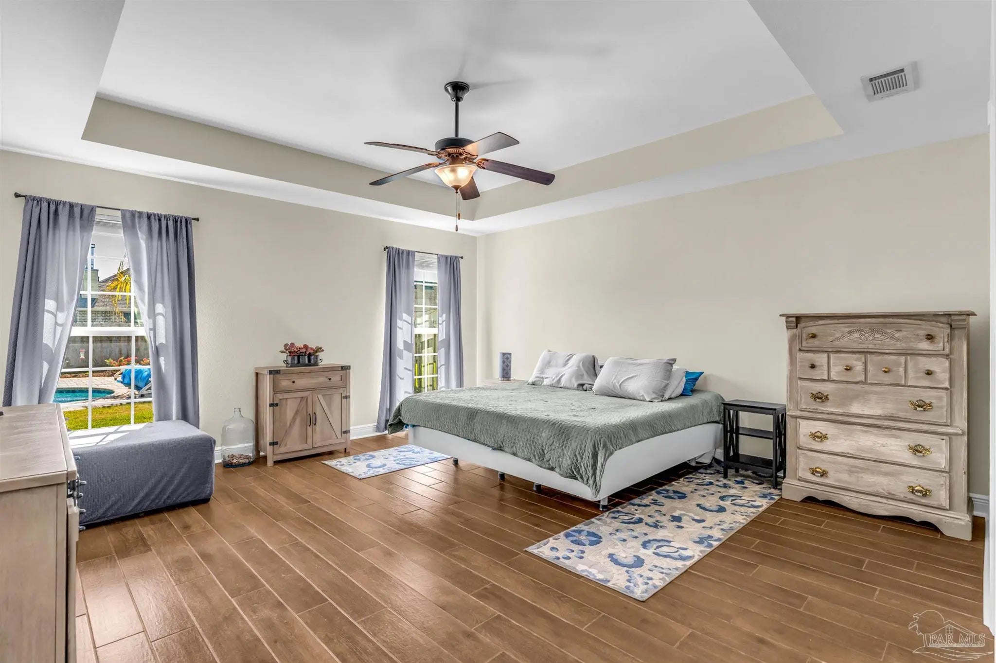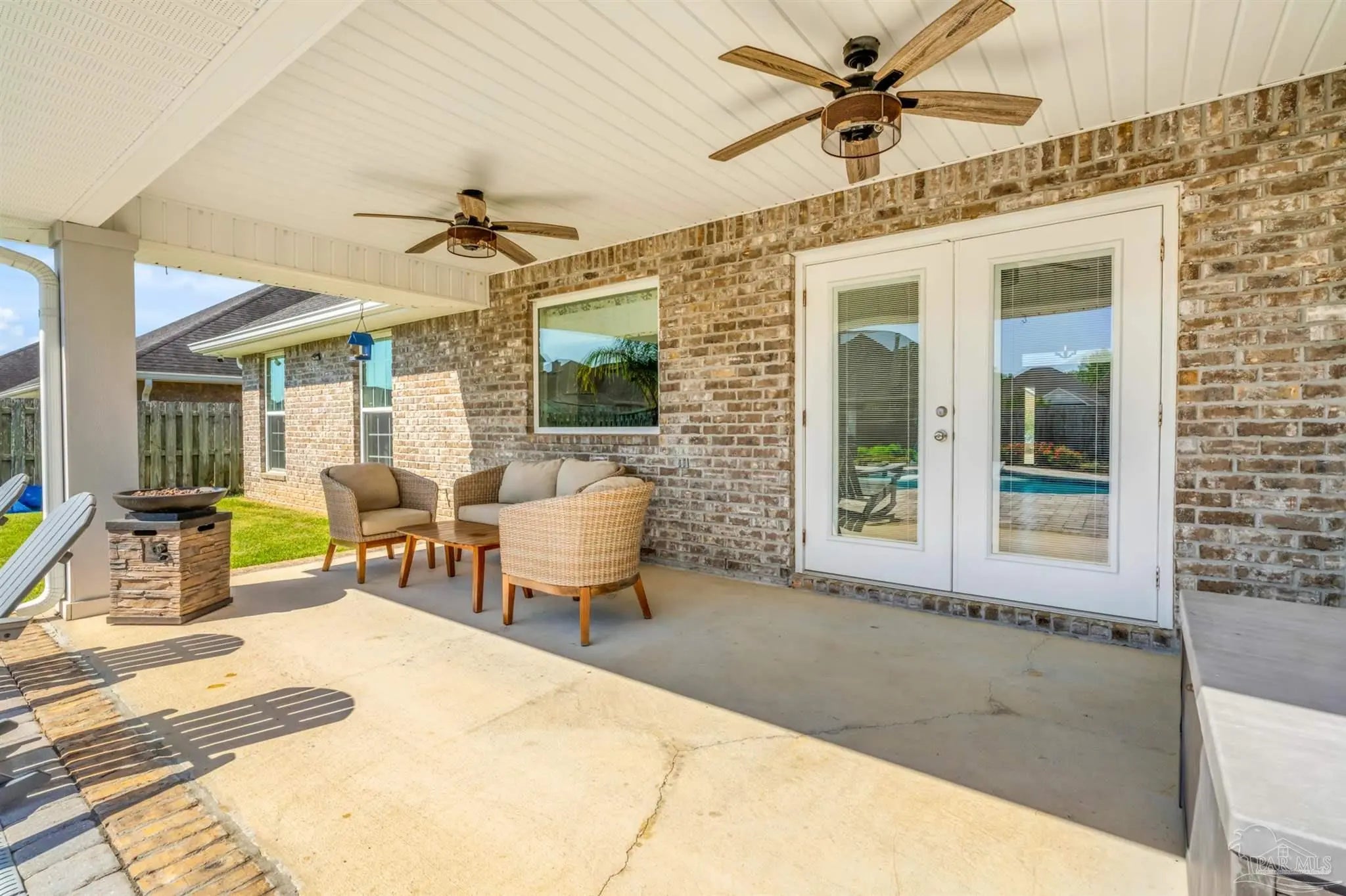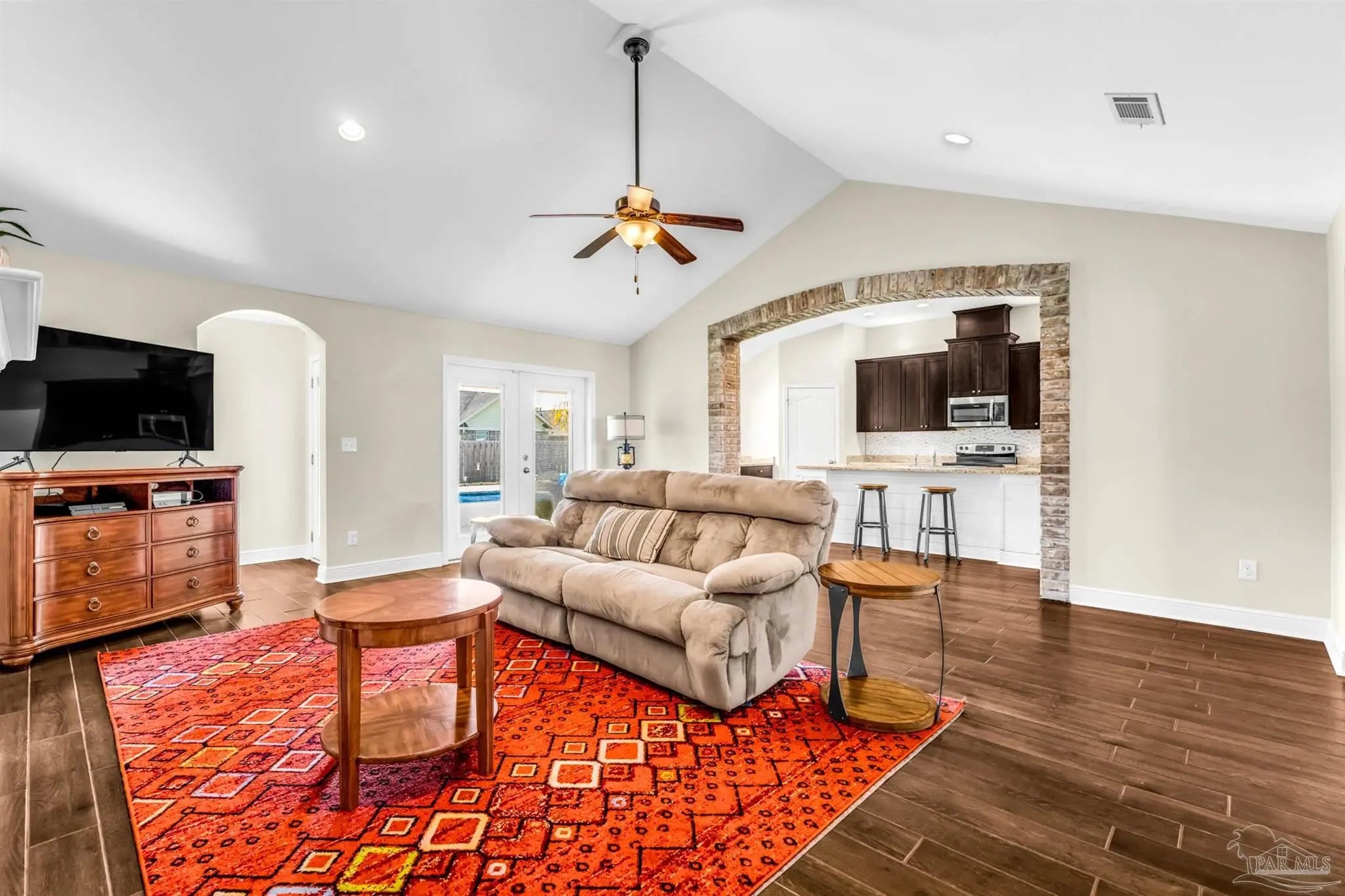 GATED COMMUNITY! Step into the 2016 model home that defined luxury for the area. This stunning brick masterpiece features the highly sought-after 2402 Blueridge floorplan, celebrated for its seamless flow and architectural character. The heart of the home is a gourmet kitchen highlighted by a dramatic brick archway that leads into a spacious living room centered around a cozy fireplace. The arched doorways lead you through the house. The expansive master suite serves as a true retreat, boasting elegant tray ceilings and a spa-like bath complete with a double vanity, garden tub, separate shower, and a massive walk-in closet. Designed with versatility in mind, the floorplan includes a private second bedroom perfect for an in-law suite, while the third and fourth bedrooms are tucked away in their own wing for maximum privacy. Outside, your personal oasis awaits. The lushly landscaped backyard features a covered porch and a sparkling Gunite pool cradled by premium pavers, featuring a shallow reef ledge specifically designed for your favorite pool loungers—the ultimate way to cool off during Florida summers. HVAC is only 1 year old. Perfectly situated just minutes from Navy Federal, Publix, and local dining, this home is move-in ready with a quick closing timeline available. Experience firsthand why this remains one of the most popular layouts in the region.