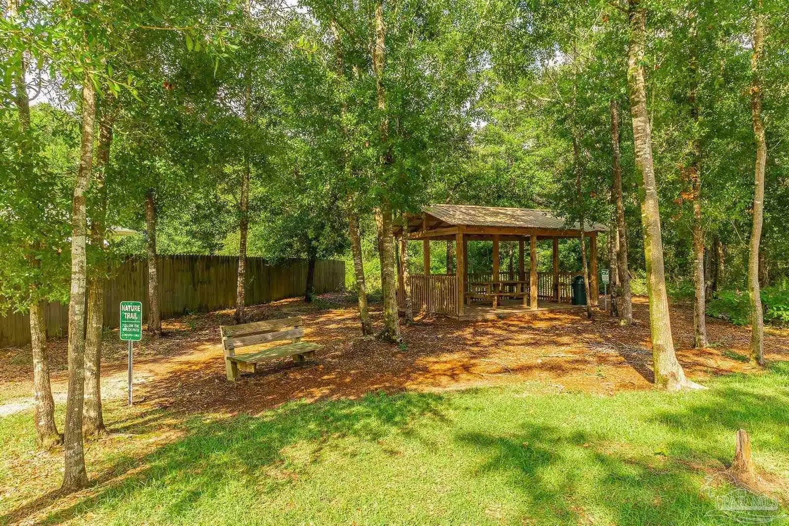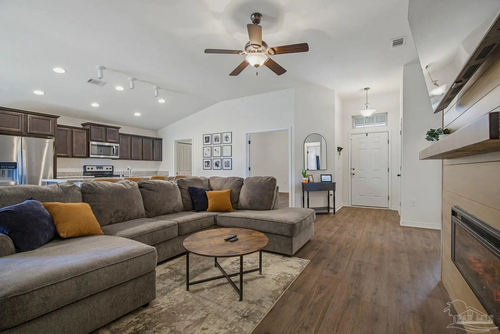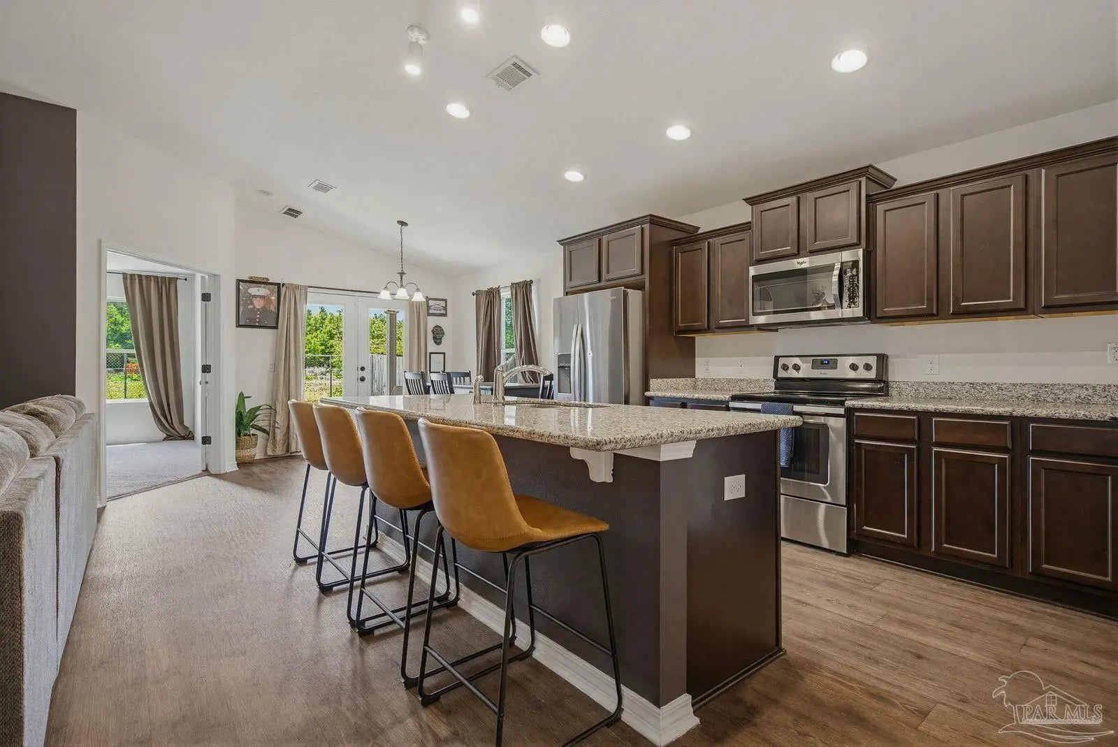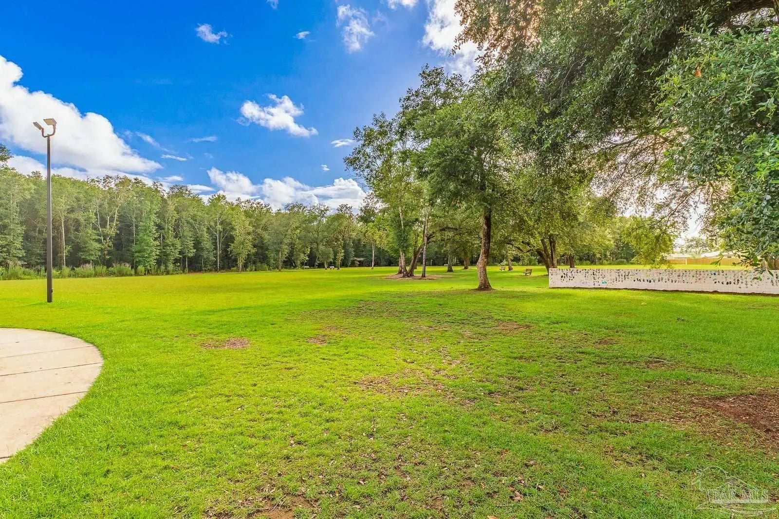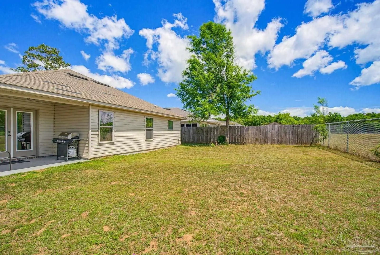 Welcome to this well-maintained 3 br, 2 bath home located in a charming community with a beautifully landscaped, winding entrance, underground utilities, sidewalks, and planned recreational parks. This home features great curb appeal with a courtyard entry and a popular open floor plan perfect for everyday living and entertaining. The foyer opens to a spacious family room with high ceilings and a ceiling fan. The kitchen overlooks the living area and includes granite countertops, a farmhouse-style sink, recessed lighting, premium wood cabinets with crown molding, a walk-through pantry, and Whirlpool stainless steel appliances. Luxury vinyl flooring throughout with carpet in the bedrooms. A versatile bonus room can be used as a dining room, media space, or playroom. The split floor plan offers privacy, with a primary suite that includes a tray ceiling, double vanities, a garden tub, separate shower, and a large walk-in closet. Additional bedrooms are generously sized with a shared hall bath. Enjoy outdoor living on the covered back porch, accessible through double French doors. The home also includes a courtyard-entry double garage with attic access and a spacious laundry room. Located in the desirable Pace School System district, this home offers comfort, style, and convenience in a welcoming neighborhood.
