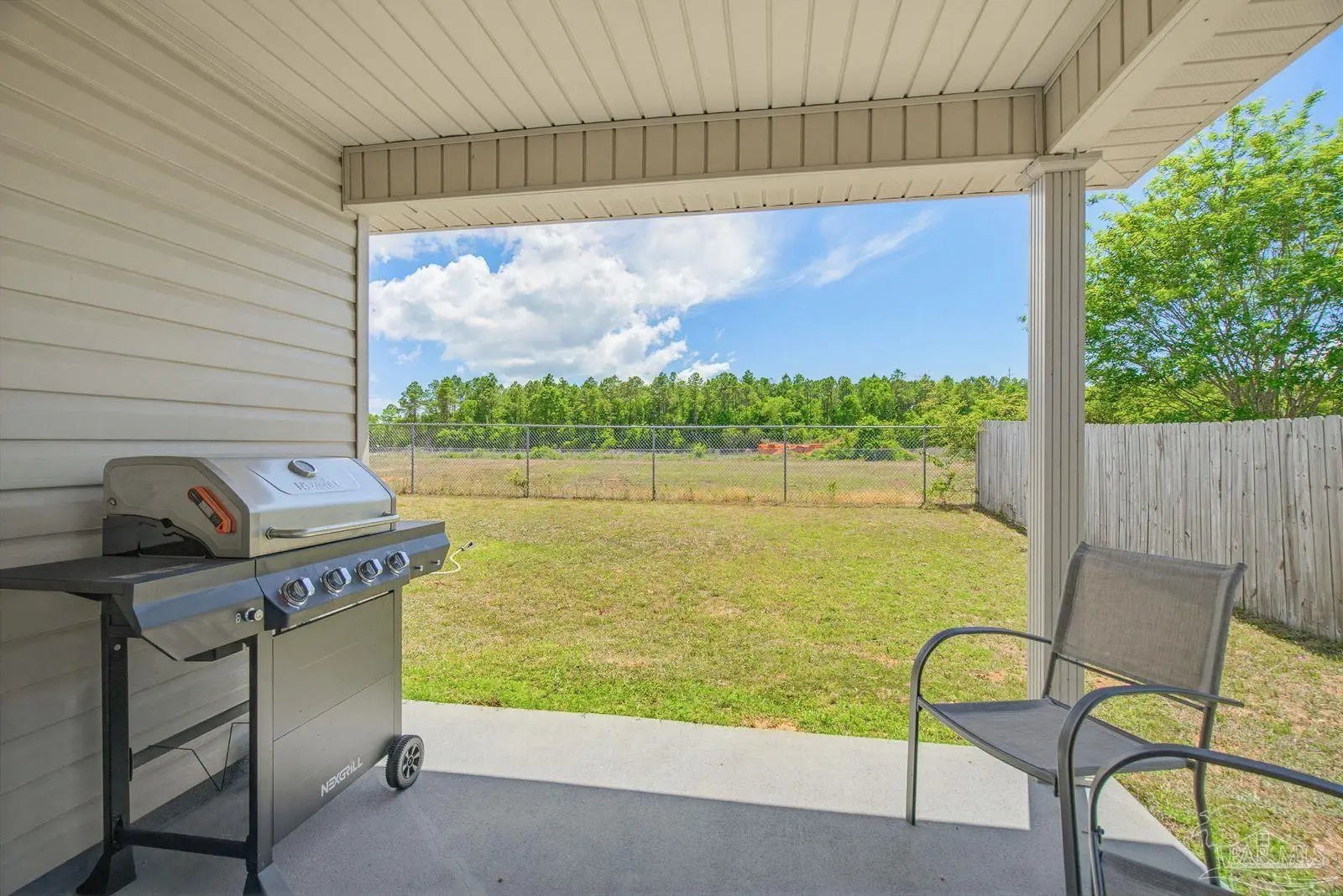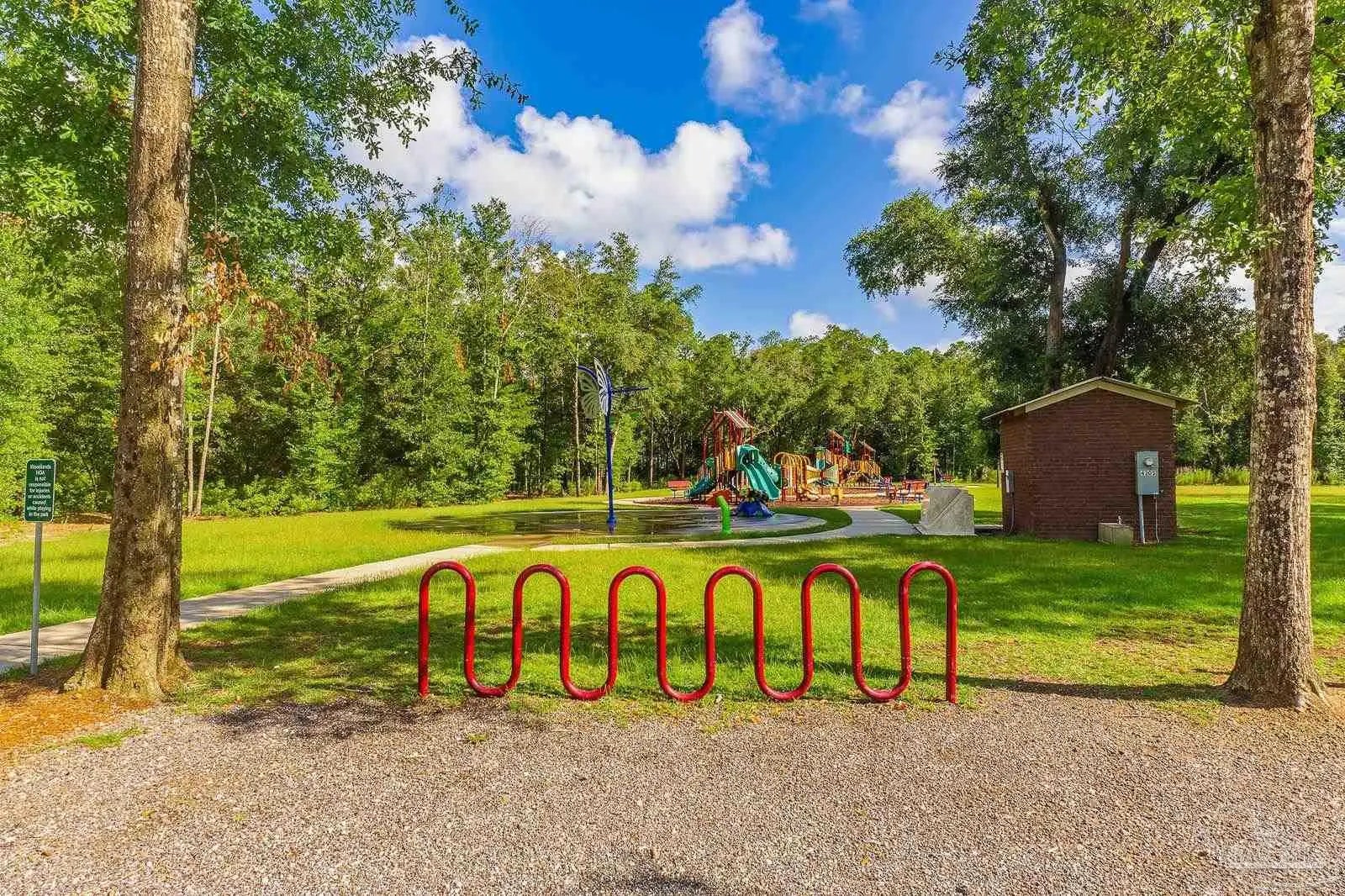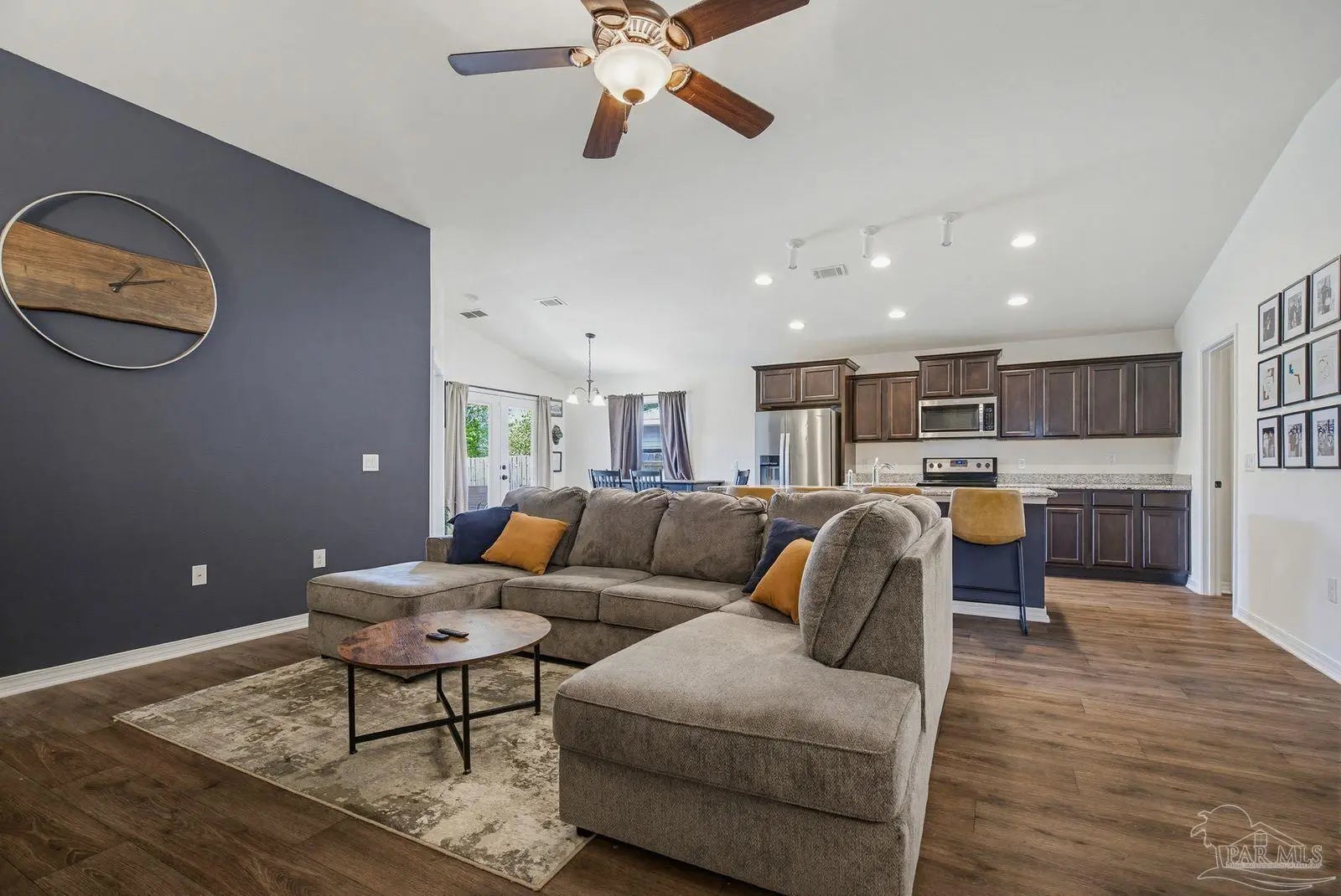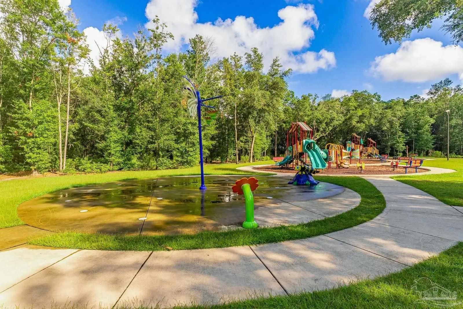 Welcome to this well-maintained 3 br, 2 bath home located in a charming community with a beautifully landscaped, winding entrance, underground utilities, sidewalks, and planned recreational parks. This home features great curb appeal with a courtyard entry and a popular open floor plan perfect for everyday living and entertaining. The foyer opens to a spacious family room with high ceilings and a ceiling fan. The kitchen overlooks the living area and includes granite countertops, a farmhouse-style sink, recessed lighting, premium wood cabinets with crown molding, a walk-through pantry, and Whirlpool stainless steel appliances. Luxury vinyl flooring throughout with carpet in the bedrooms. A versatile bonus room can be used as a dining room, media space, or playroom. The split floor plan offers privacy, with a primary suite that includes a tray ceiling, double vanities, a garden tub, separate shower, and a large walk-in closet. Additional bedrooms are generously sized with a shared hall bath. Enjoy outdoor living on the covered back porch, accessible through double French doors. The home also includes a courtyard-entry double garage with attic access and a spacious laundry room. Located in the desirable Pace School System district, this home offers comfort, style, and convenience in a welcoming neighborhood.