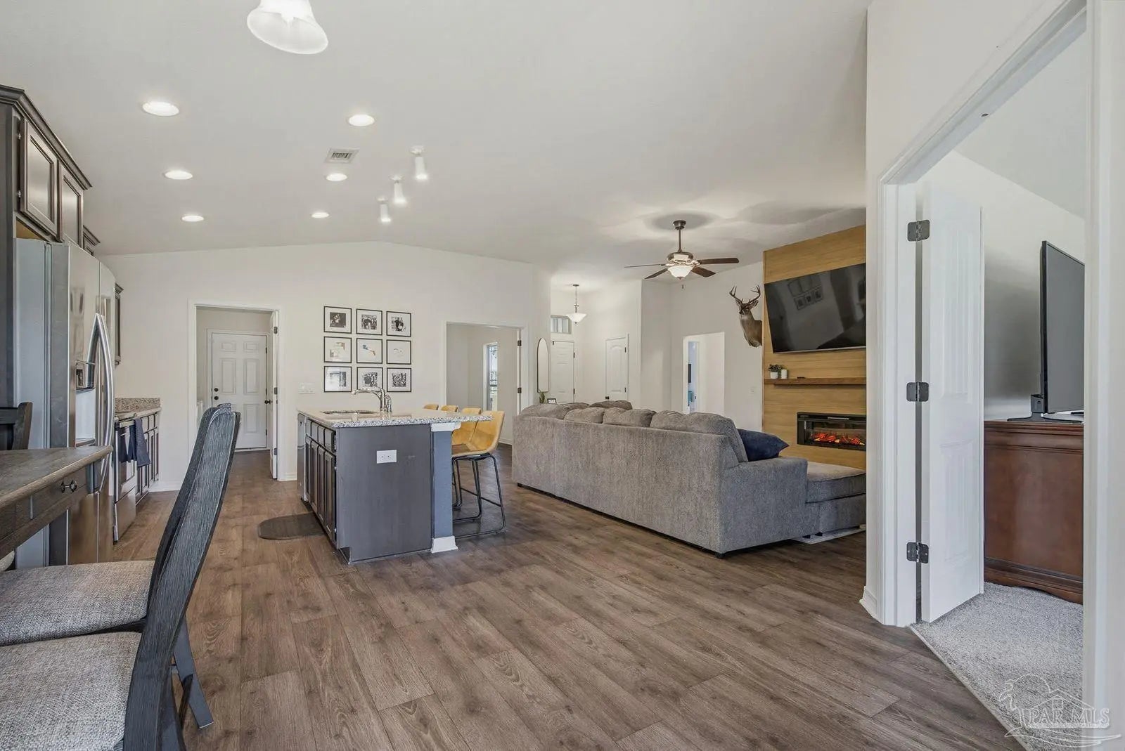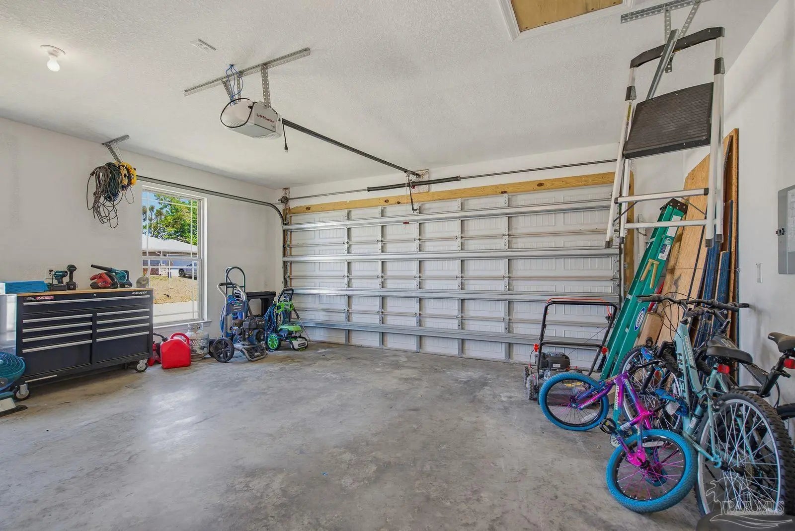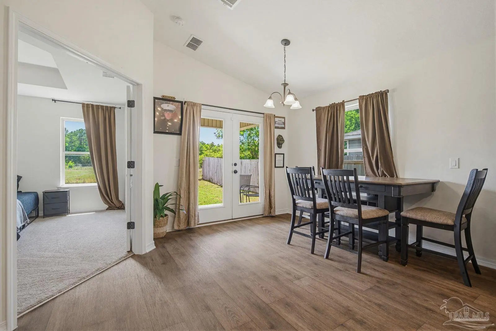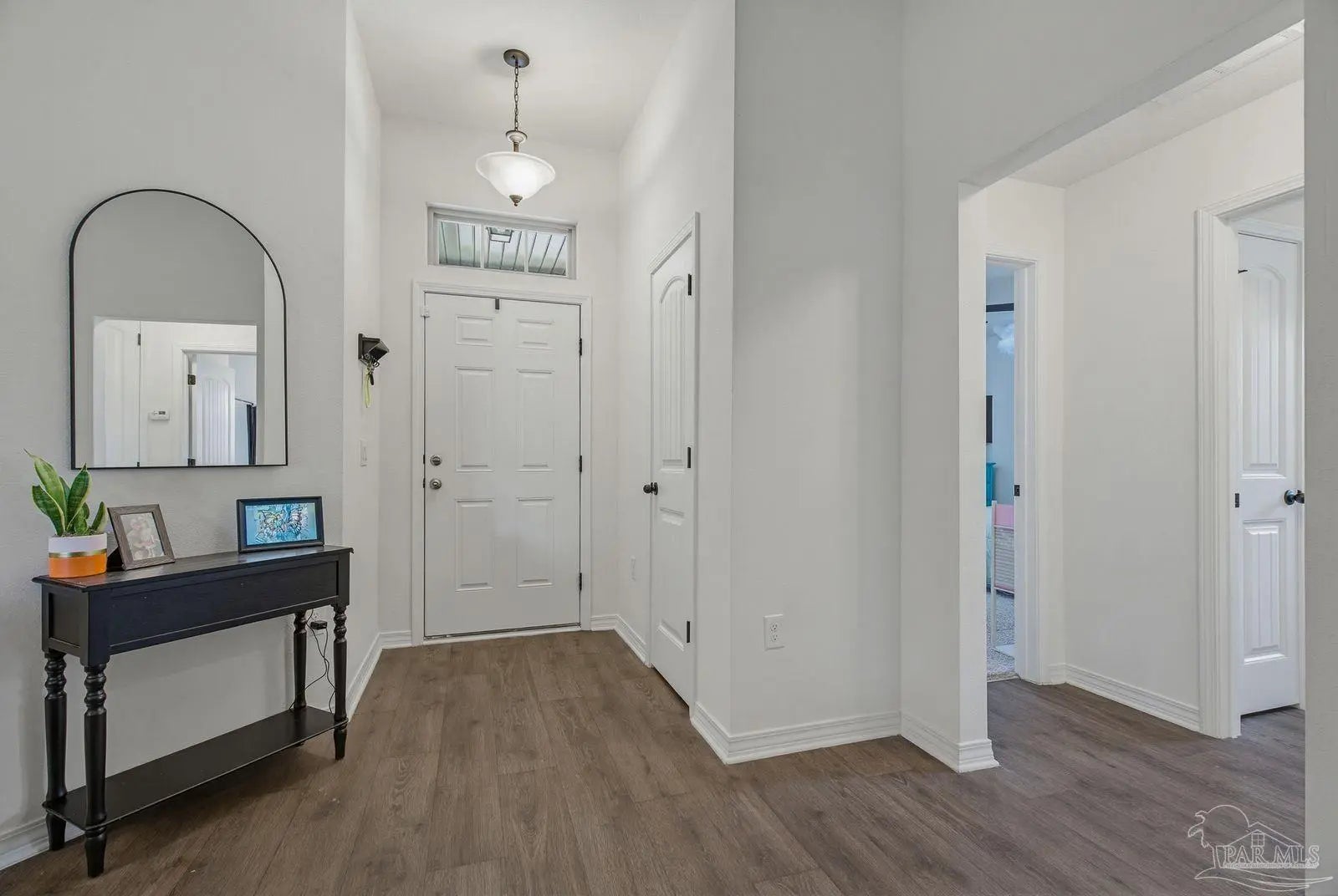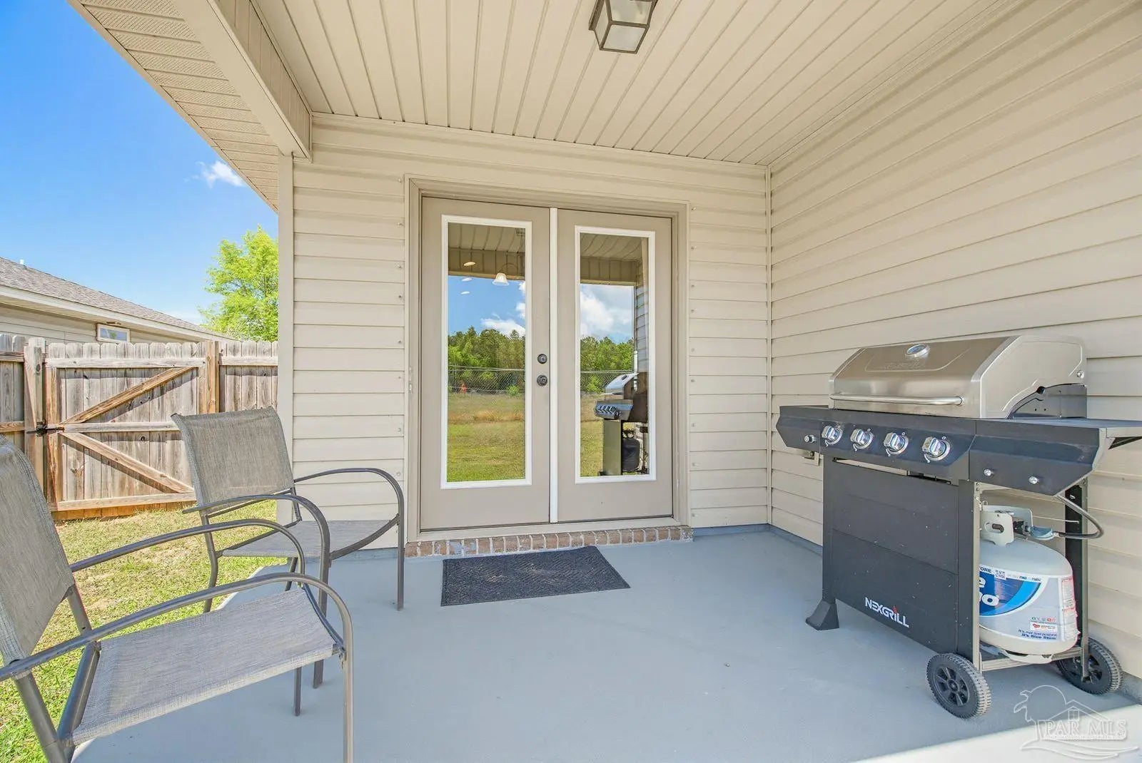 Welcome to this well-maintained 3 br, 2 bath home located in a charming community with a beautifully landscaped, winding entrance, underground utilities, sidewalks, and planned recreational parks. This home features great curb appeal with a courtyard entry and a popular open floor plan perfect for everyday living and entertaining. The foyer opens to a spacious family room with high ceilings and a ceiling fan. The kitchen overlooks the living area and includes granite countertops, a farmhouse-style sink, recessed lighting, premium wood cabinets with crown molding, a walk-through pantry, and Whirlpool stainless steel appliances. Luxury vinyl flooring throughout with carpet in the bedrooms. A versatile bonus room can be used as a dining room, media space, or playroom. The split floor plan offers privacy, with a primary suite that includes a tray ceiling, double vanities, a garden tub, separate shower, and a large walk-in closet. Additional bedrooms are generously sized with a shared hall bath. Enjoy outdoor living on the covered back porch, accessible through double French doors. The home also includes a courtyard-entry double garage with attic access and a spacious laundry room. Located in the desirable Pace School System district, this home offers comfort, style, and convenience in a welcoming neighborhood.
