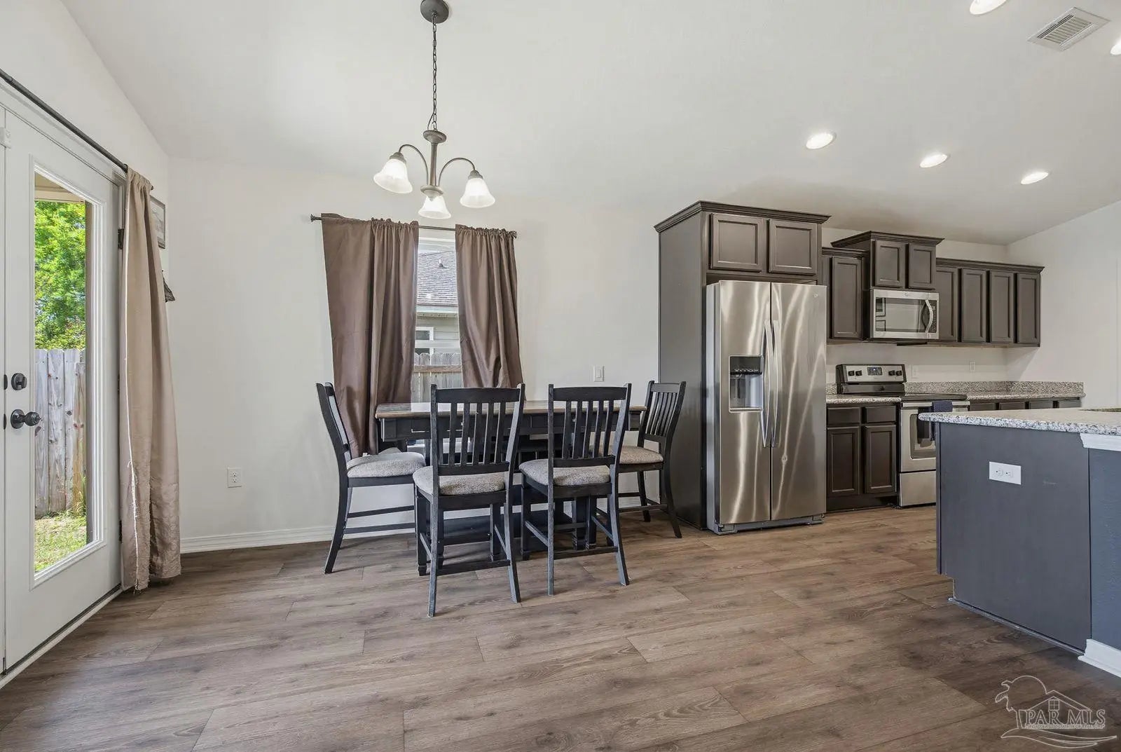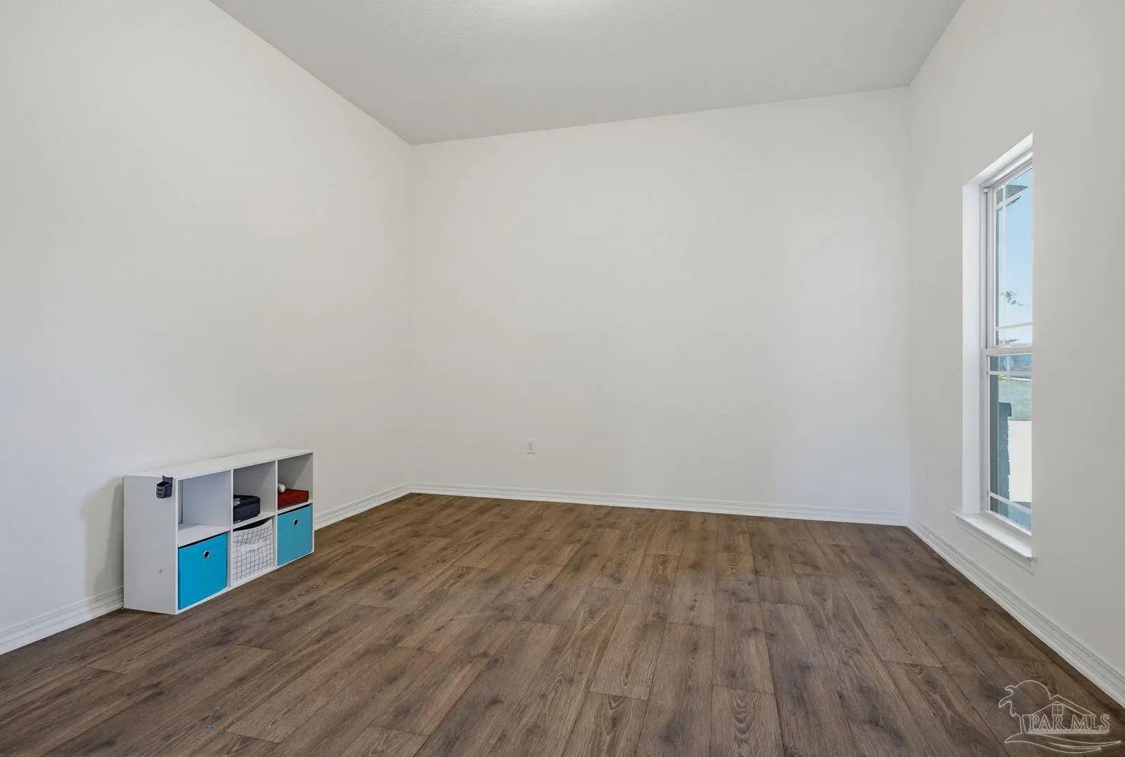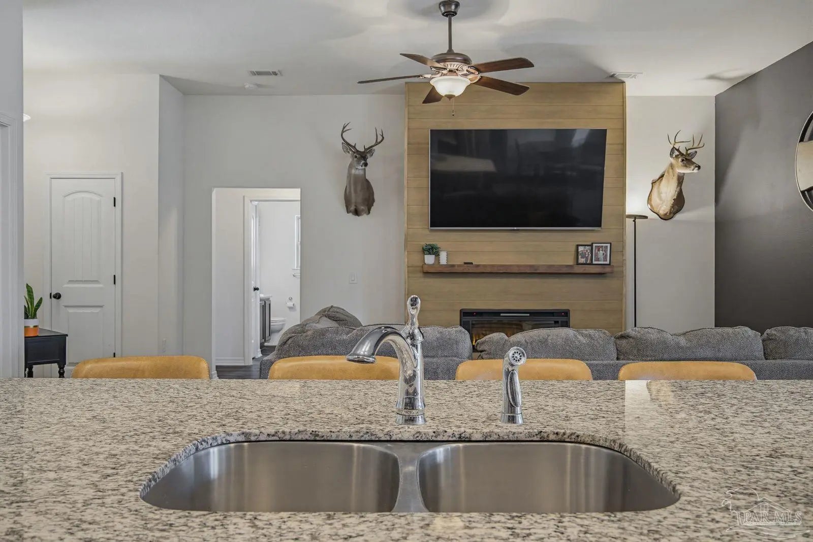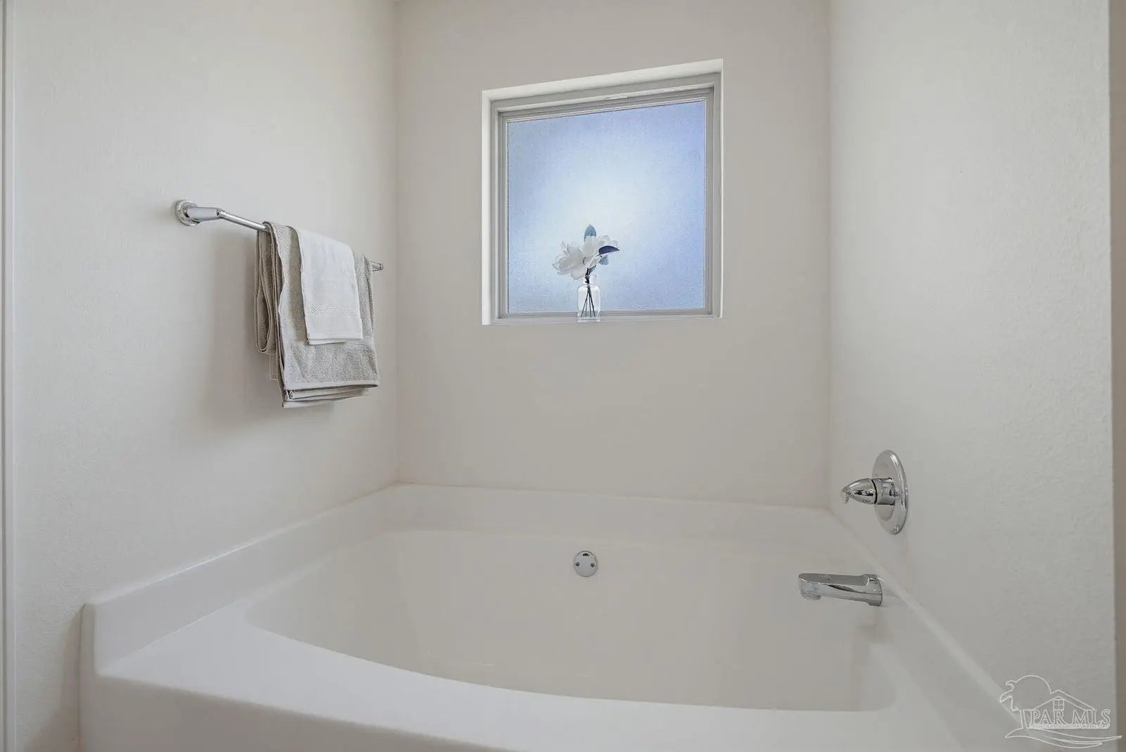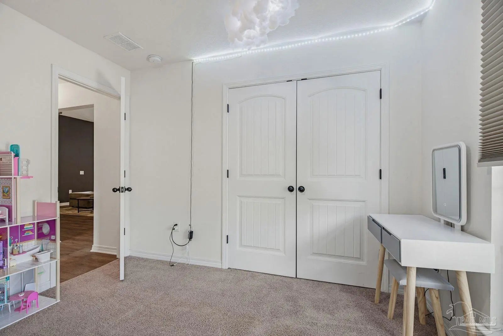 Welcome to this well-maintained 3 br, 2 bath home located in a charming community with a beautifully landscaped, winding entrance, underground utilities, sidewalks, and planned recreational parks. This home features great curb appeal with a courtyard entry and a popular open floor plan perfect for everyday living and entertaining. The foyer opens to a spacious family room with high ceilings and a ceiling fan. The kitchen overlooks the living area and includes granite countertops, a farmhouse-style sink, recessed lighting, premium wood cabinets with crown molding, a walk-through pantry, and Whirlpool stainless steel appliances. Luxury vinyl flooring throughout with carpet in the bedrooms. A versatile bonus room can be used as a dining room, media space, or playroom. The split floor plan offers privacy, with a primary suite that includes a tray ceiling, double vanities, a garden tub, separate shower, and a large walk-in closet. Additional bedrooms are generously sized with a shared hall bath. Enjoy outdoor living on the covered back porch, accessible through double French doors. The home also includes a courtyard-entry double garage with attic access and a spacious laundry room. Located in the desirable Pace School System district, this home offers comfort, style, and convenience in a welcoming neighborhood.