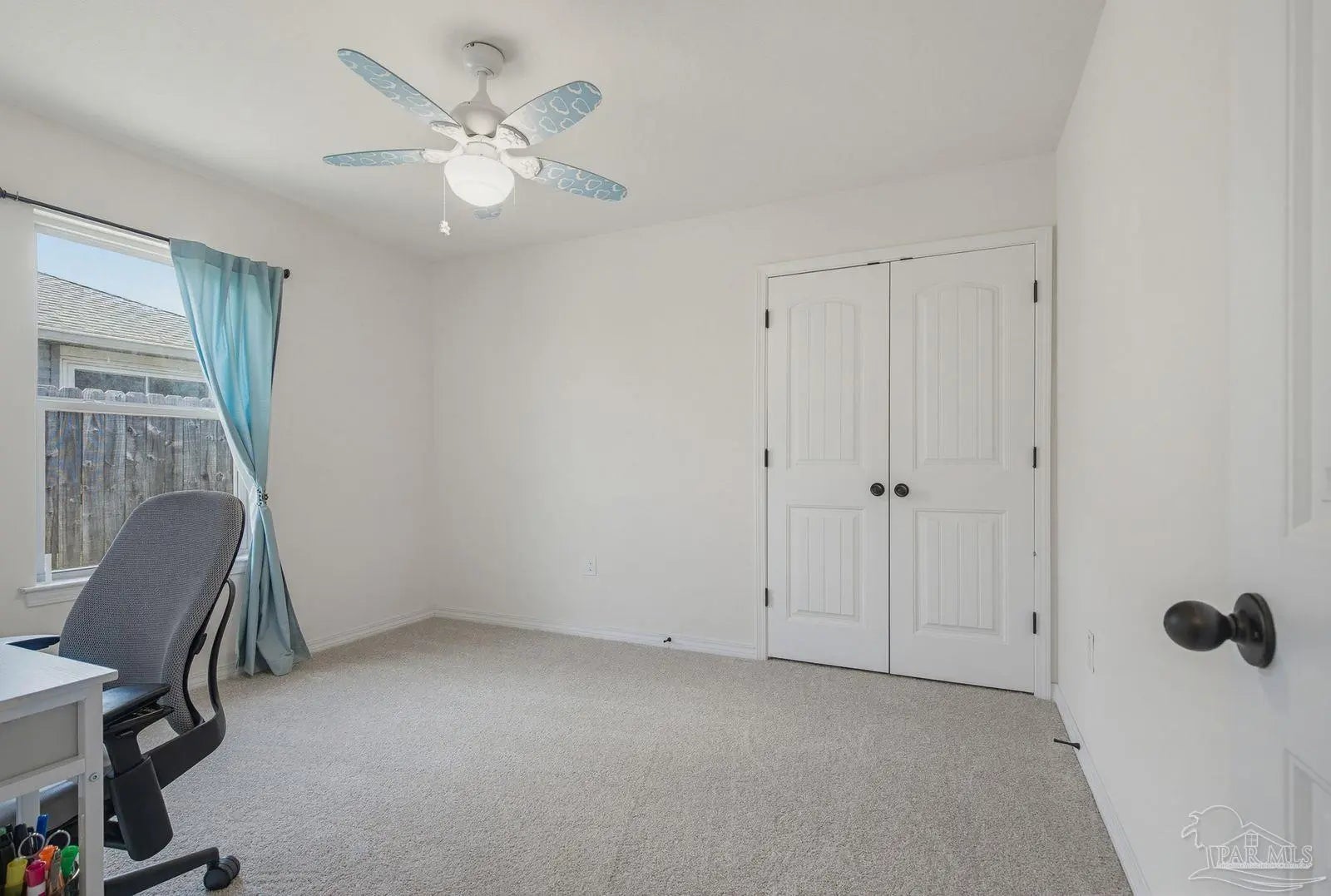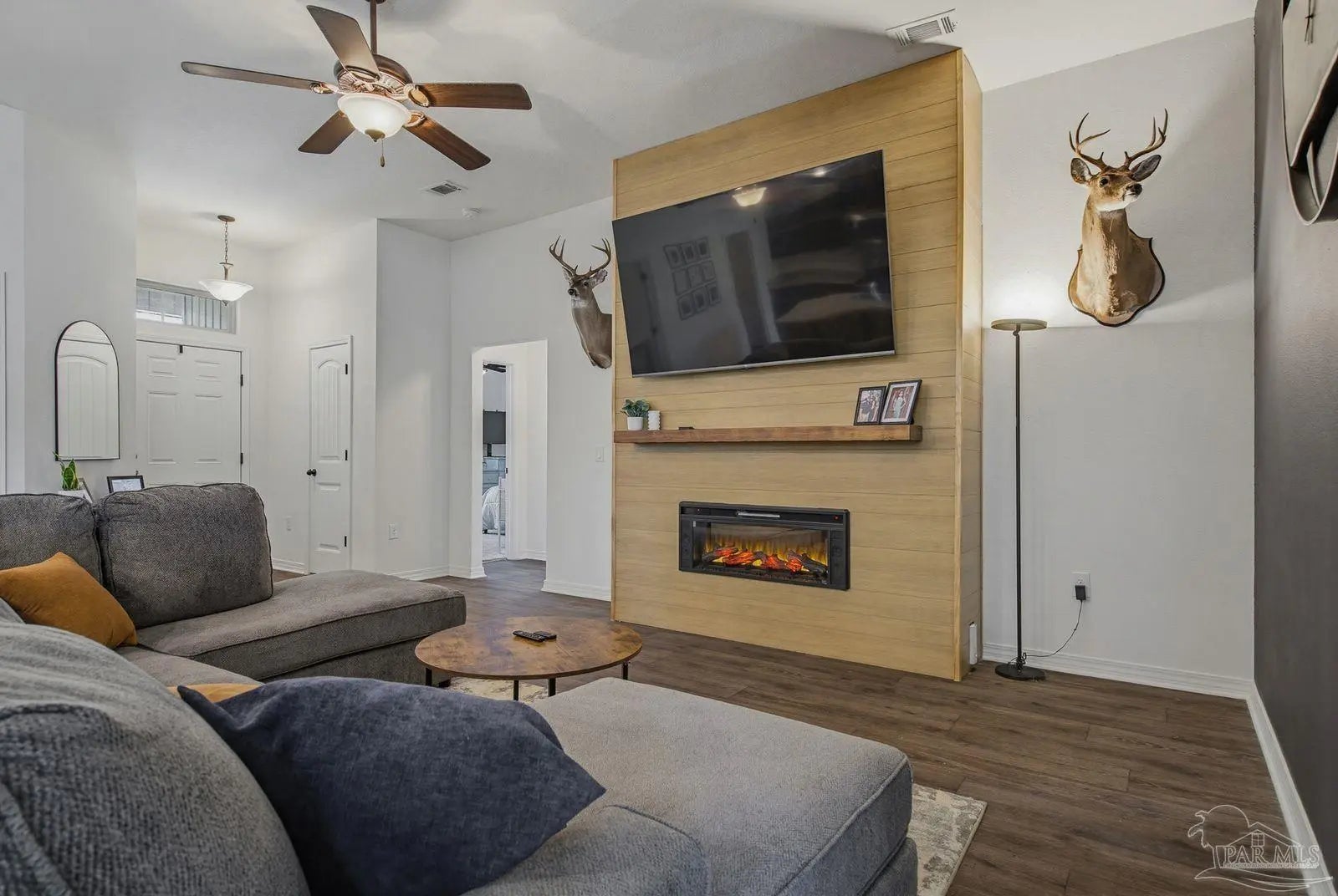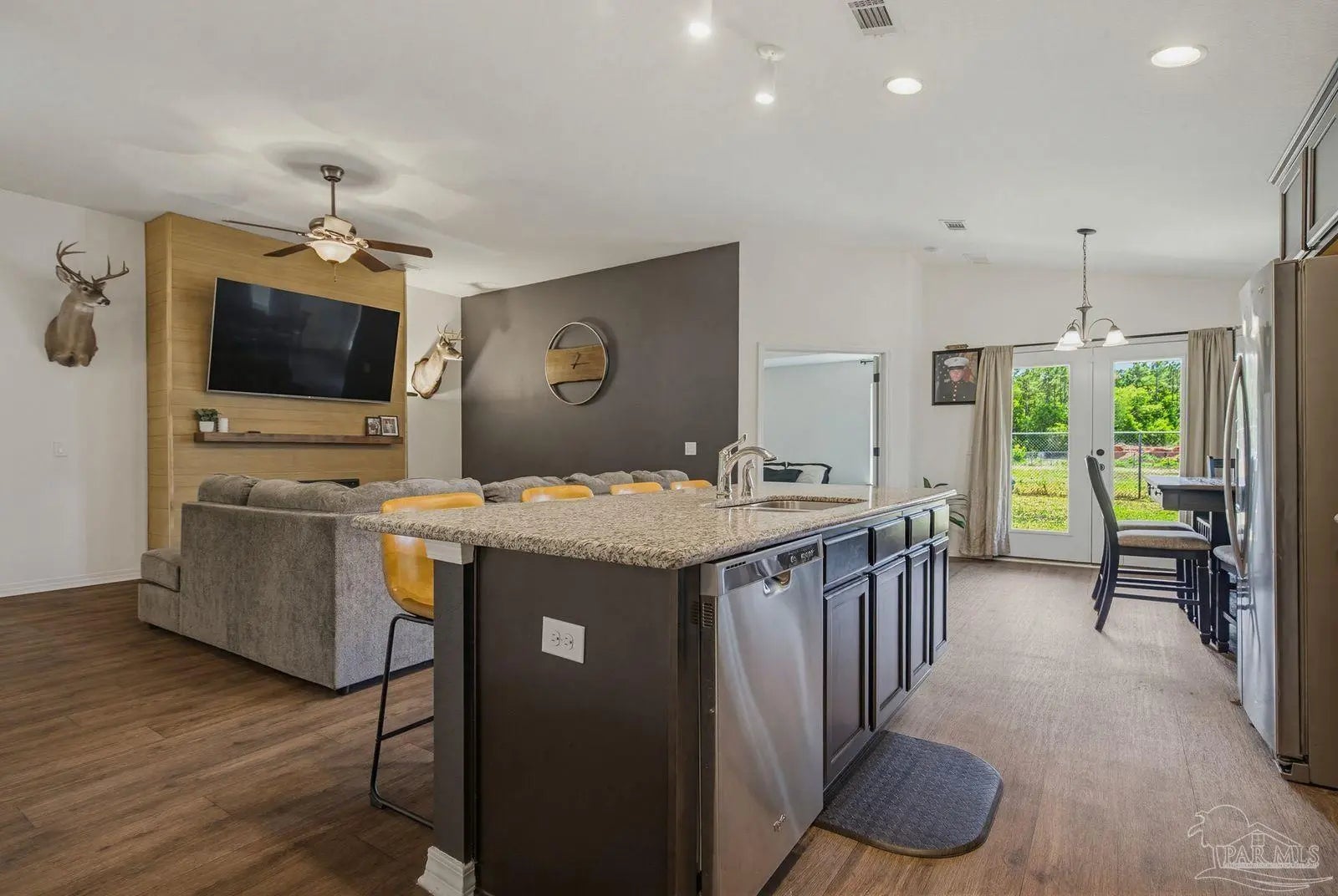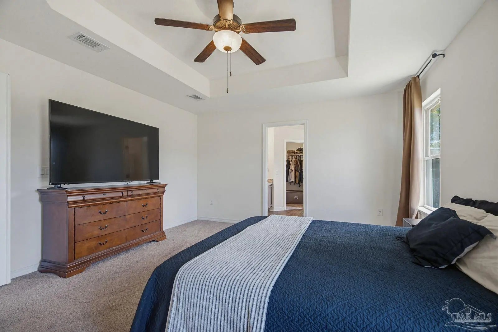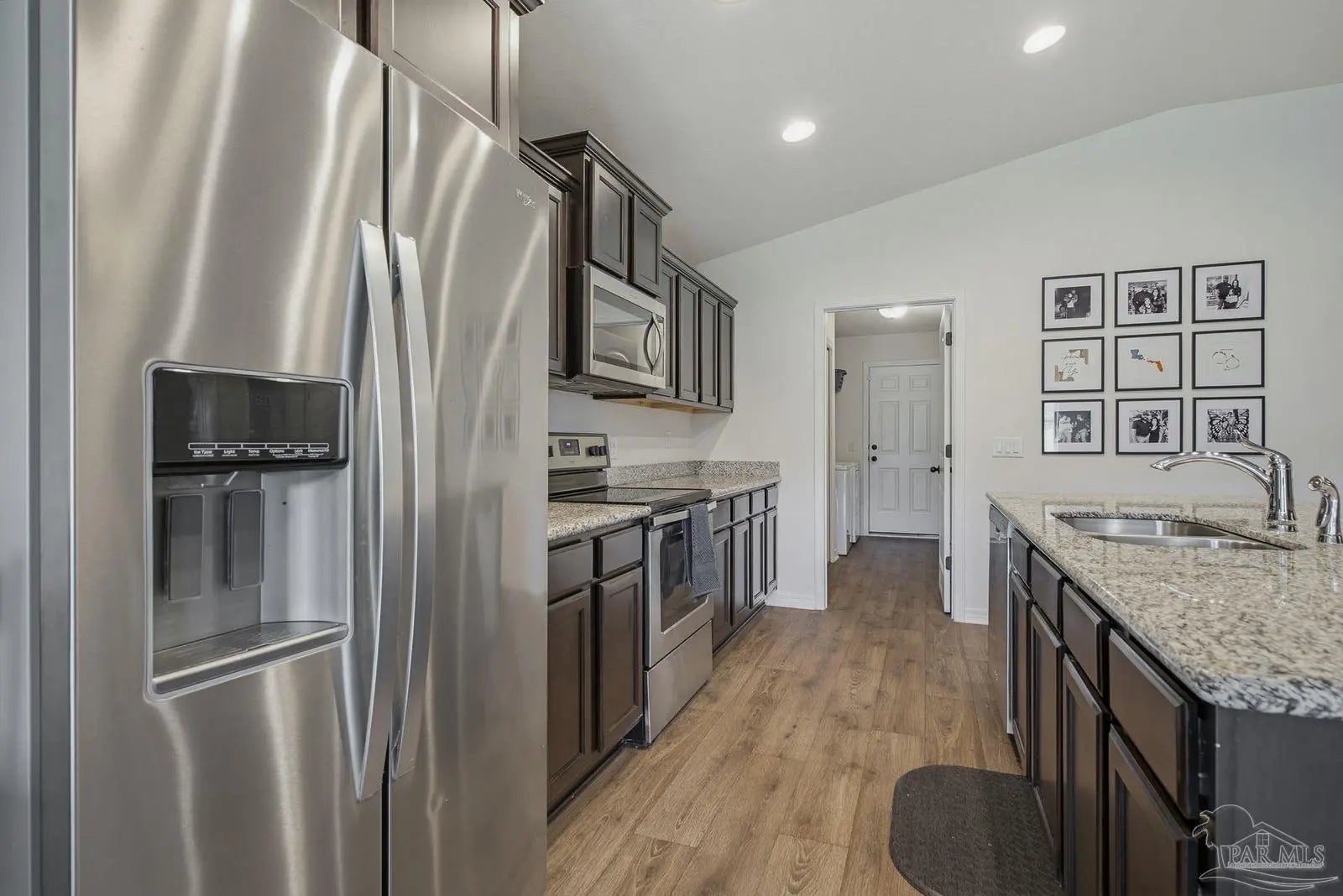 Welcome to this well-maintained 3 br, 2 bath home located in a charming community with a beautifully landscaped, winding entrance, underground utilities, sidewalks, and planned recreational parks. This home features great curb appeal with a courtyard entry and a popular open floor plan perfect for everyday living and entertaining. The foyer opens to a spacious family room with high ceilings and a ceiling fan. The kitchen overlooks the living area and includes granite countertops, a farmhouse-style sink, recessed lighting, premium wood cabinets with crown molding, a walk-through pantry, and Whirlpool stainless steel appliances. Luxury vinyl flooring throughout with carpet in the bedrooms. A versatile bonus room can be used as a dining room, media space, or playroom. The split floor plan offers privacy, with a primary suite that includes a tray ceiling, double vanities, a garden tub, separate shower, and a large walk-in closet. Additional bedrooms are generously sized with a shared hall bath. Enjoy outdoor living on the covered back porch, accessible through double French doors. The home also includes a courtyard-entry double garage with attic access and a spacious laundry room. Located in the desirable Pace School System district, this home offers comfort, style, and convenience in a welcoming neighborhood.