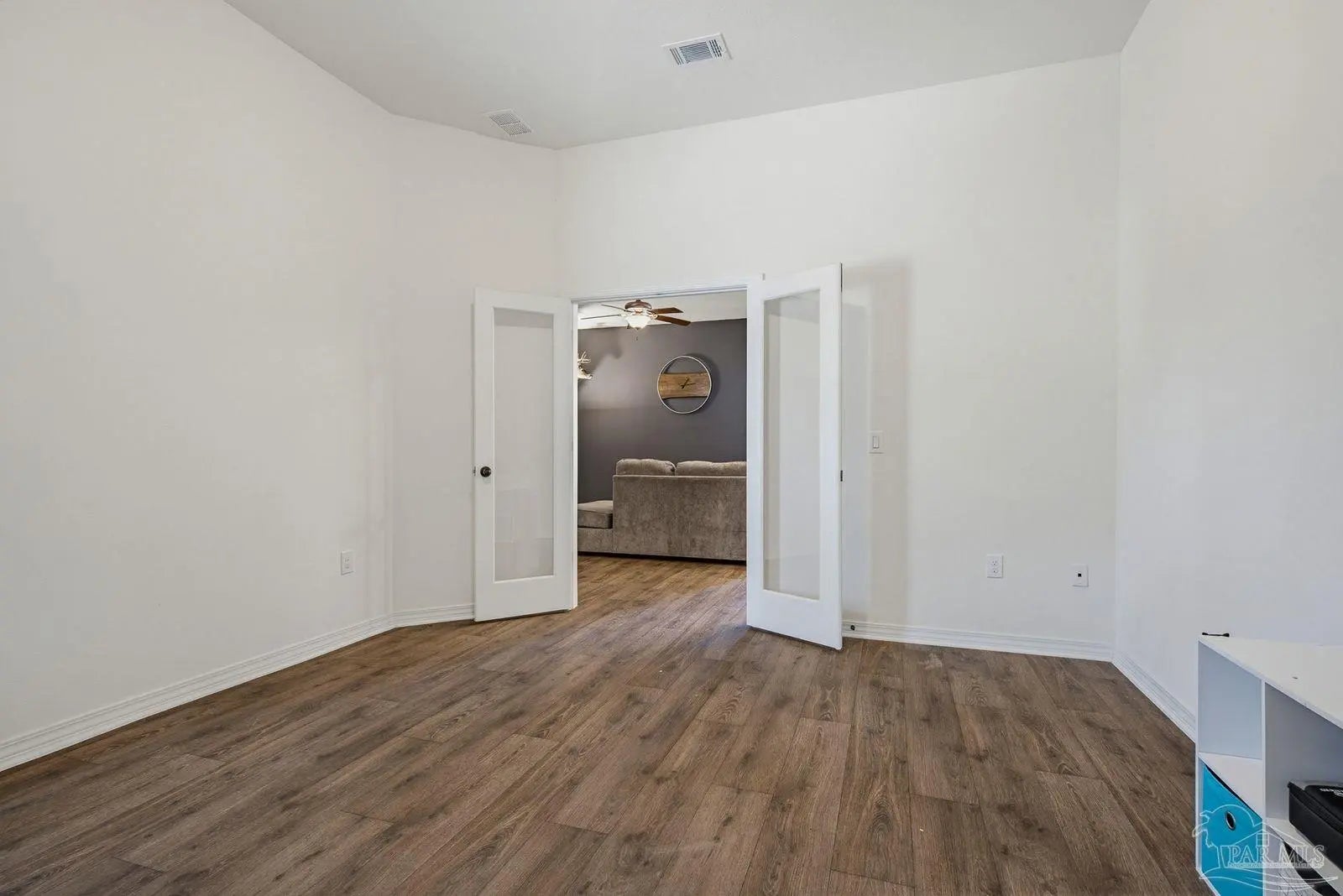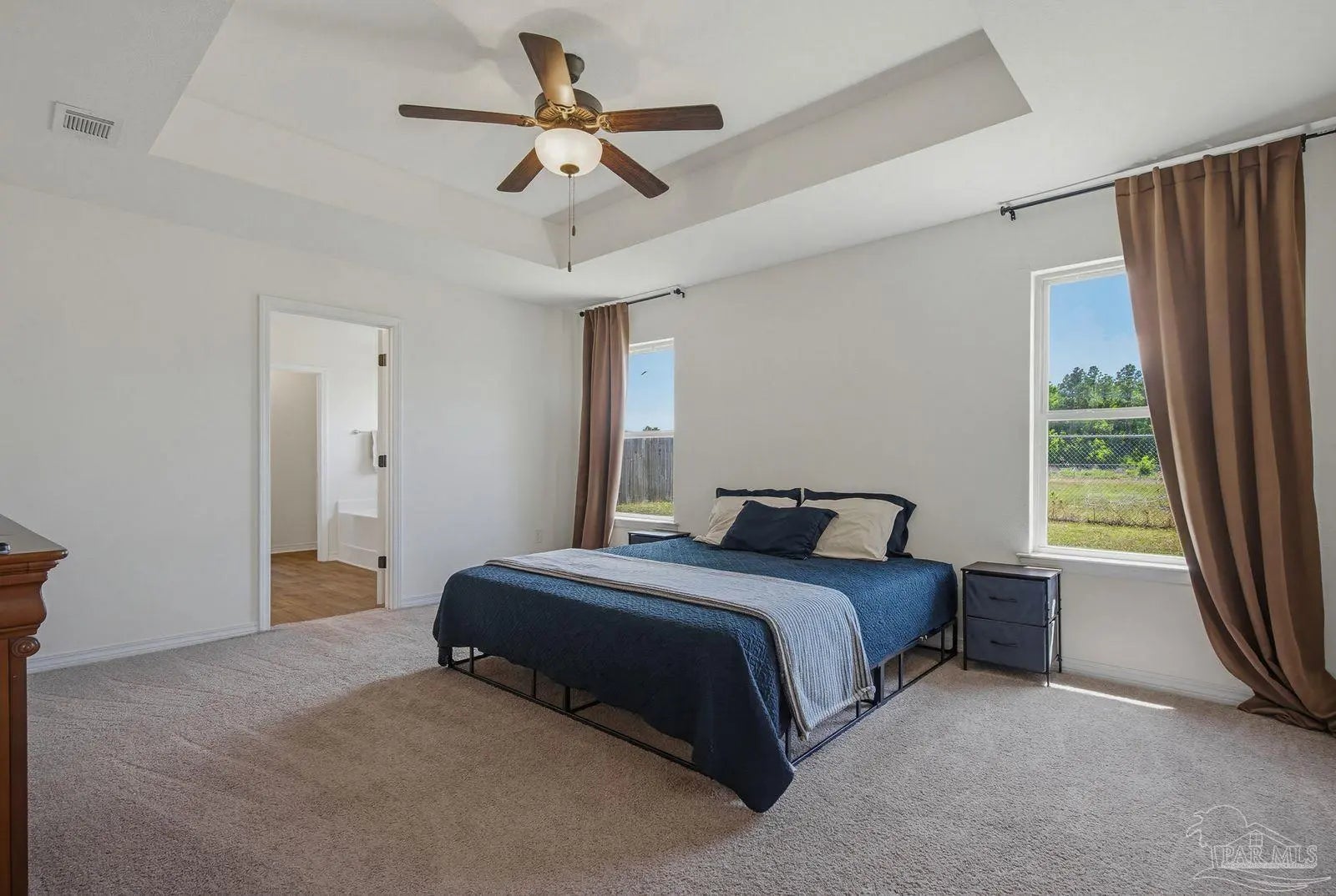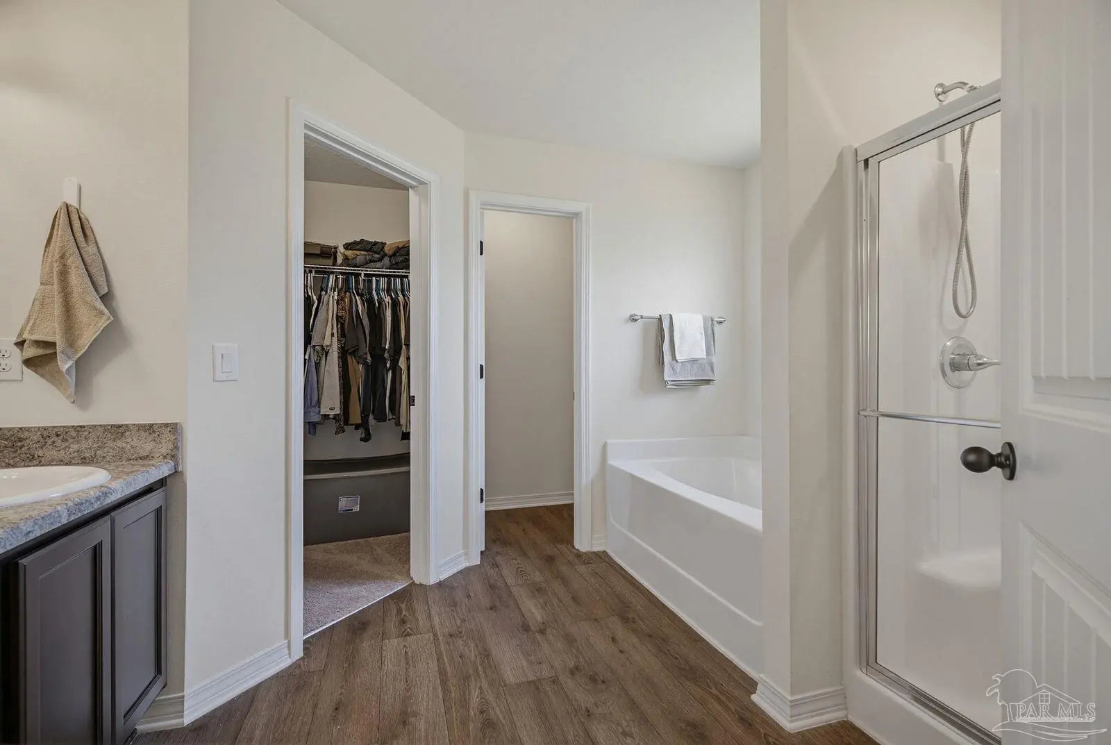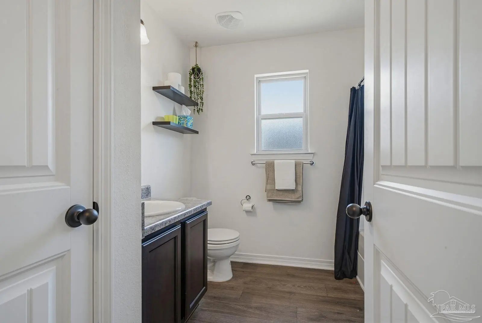 Welcome to this well-maintained 3 br, 2 bath home located in a charming community with a beautifully landscaped, winding entrance, underground utilities, sidewalks, and planned recreational parks. This home features great curb appeal with a courtyard entry and a popular open floor plan perfect for everyday living and entertaining. The foyer opens to a spacious family room with high ceilings and a ceiling fan. The kitchen overlooks the living area and includes granite countertops, a farmhouse-style sink, recessed lighting, premium wood cabinets with crown molding, a walk-through pantry, and Whirlpool stainless steel appliances. Luxury vinyl flooring throughout with carpet in the bedrooms. A versatile bonus room can be used as a dining room, media space, or playroom. The split floor plan offers privacy, with a primary suite that includes a tray ceiling, double vanities, a garden tub, separate shower, and a large walk-in closet. Additional bedrooms are generously sized with a shared hall bath. Enjoy outdoor living on the covered back porch, accessible through double French doors. The home also includes a courtyard-entry double garage with attic access and a spacious laundry room. Located in the desirable Pace School System district, this home offers comfort, style, and convenience in a welcoming neighborhood.