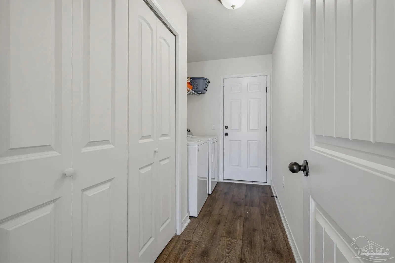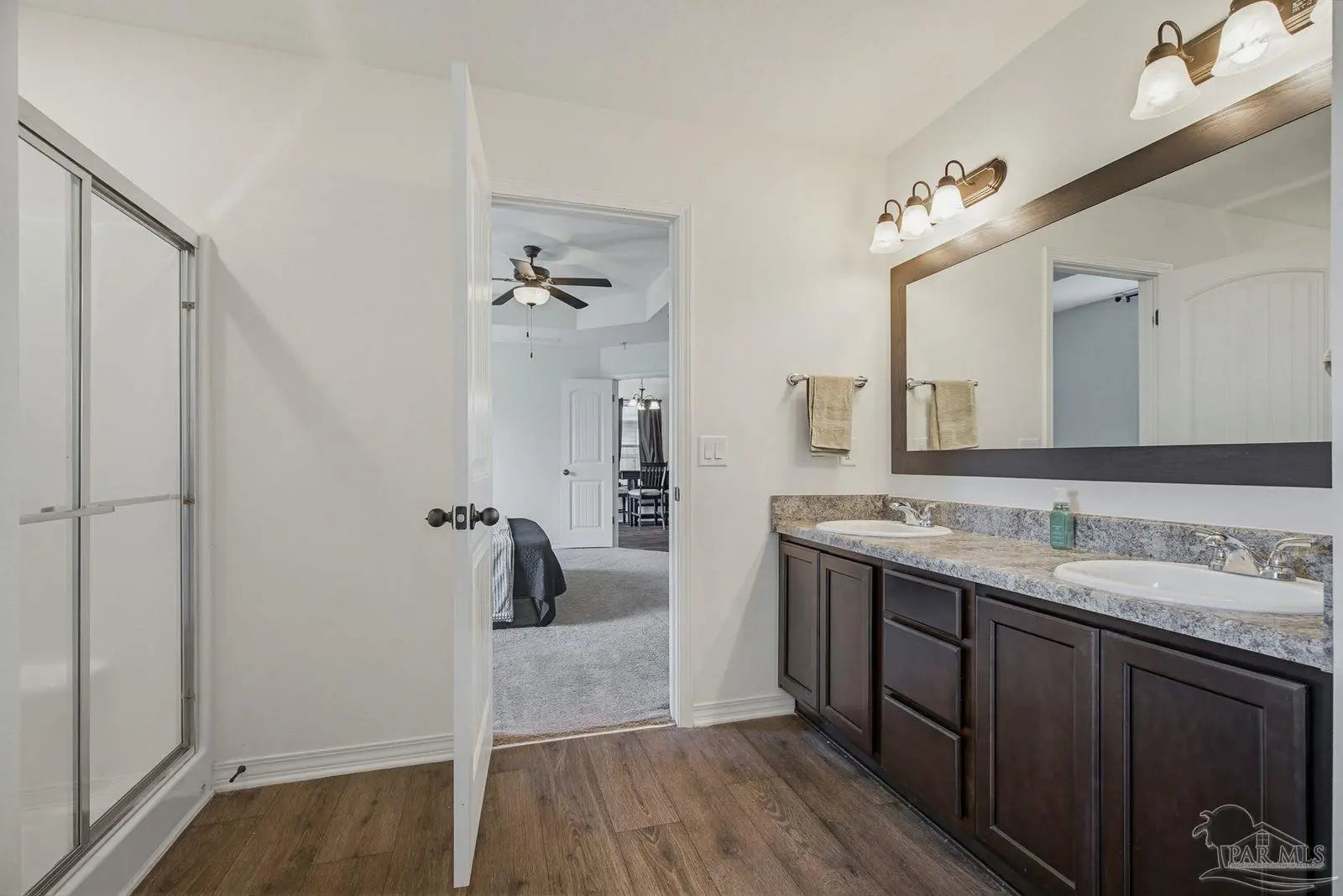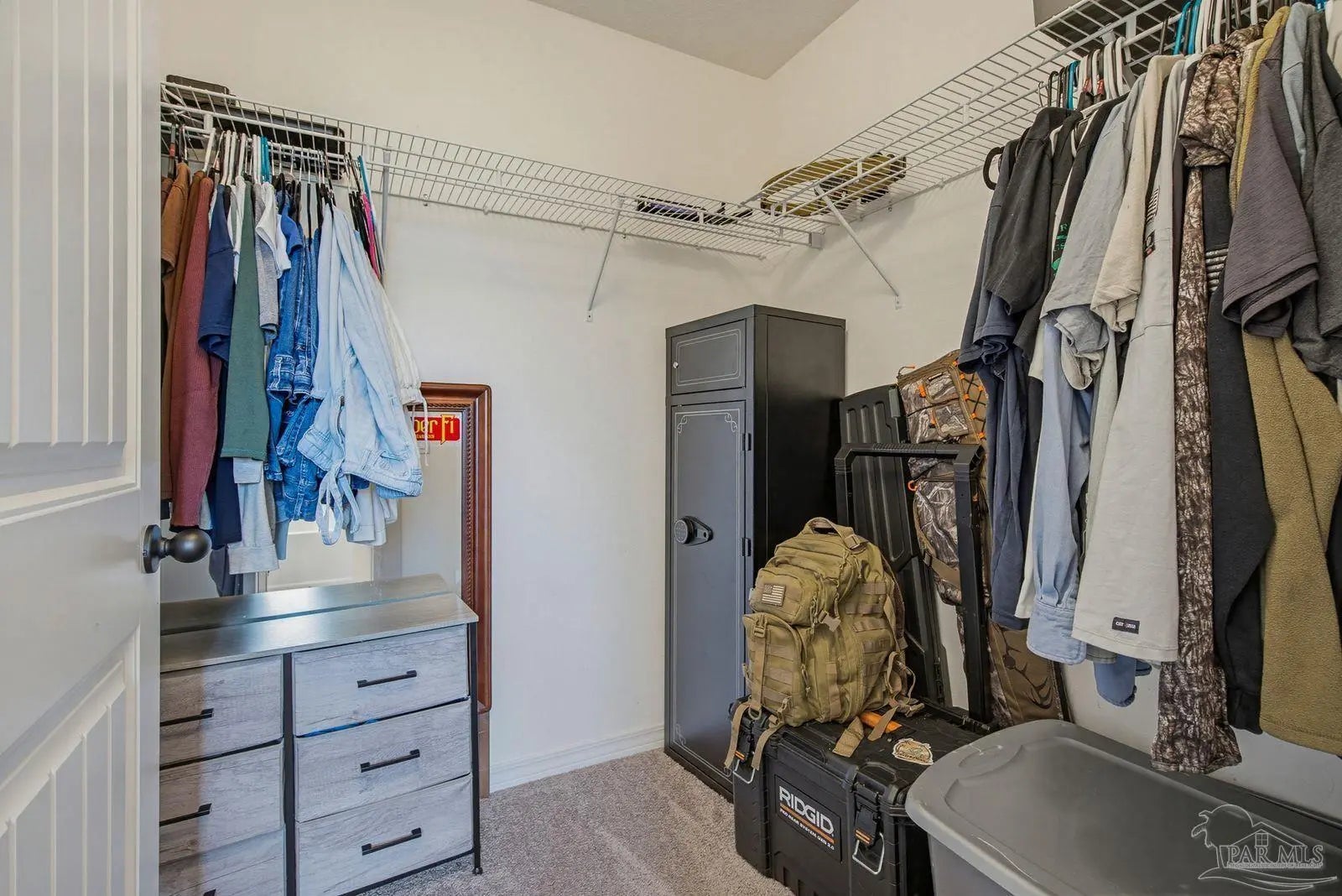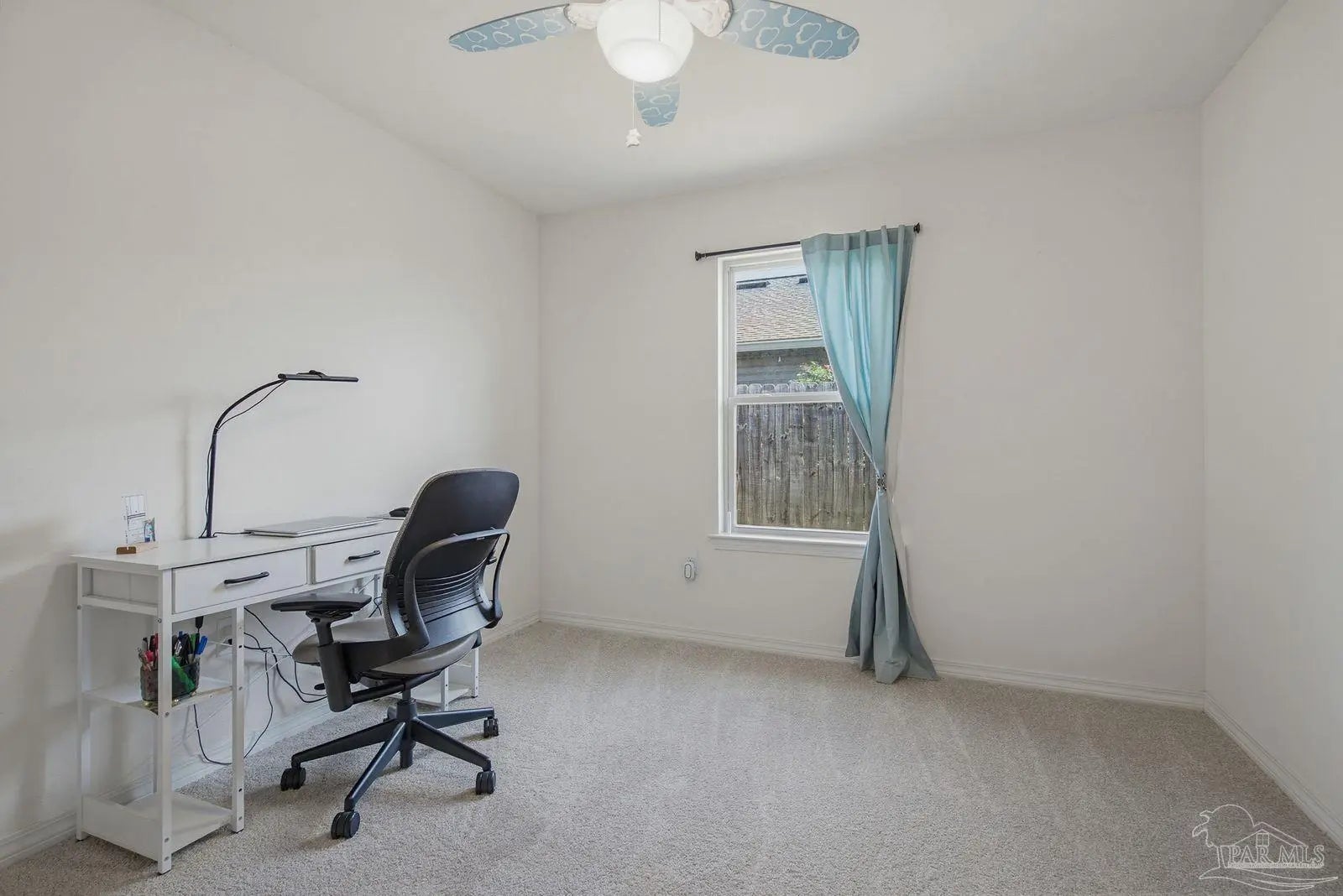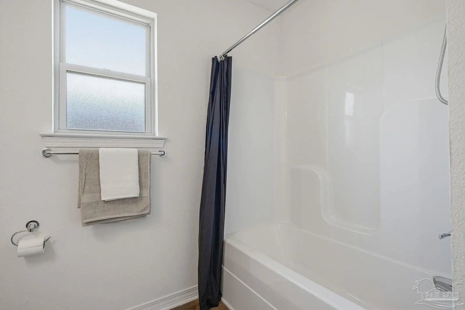 Welcome to this well-maintained 3 br, 2 bath home located in a charming community with a beautifully landscaped, winding entrance, underground utilities, sidewalks, and planned recreational parks. This home features great curb appeal with a courtyard entry and a popular open floor plan perfect for everyday living and entertaining. The foyer opens to a spacious family room with high ceilings and a ceiling fan. The kitchen overlooks the living area and includes granite countertops, a farmhouse-style sink, recessed lighting, premium wood cabinets with crown molding, a walk-through pantry, and Whirlpool stainless steel appliances. Luxury vinyl flooring throughout with carpet in the bedrooms. A versatile bonus room can be used as a dining room, media space, or playroom. The split floor plan offers privacy, with a primary suite that includes a tray ceiling, double vanities, a garden tub, separate shower, and a large walk-in closet. Additional bedrooms are generously sized with a shared hall bath. Enjoy outdoor living on the covered back porch, accessible through double French doors. The home also includes a courtyard-entry double garage with attic access and a spacious laundry room. Located in the desirable Pace School System district, this home offers comfort, style, and convenience in a welcoming neighborhood.