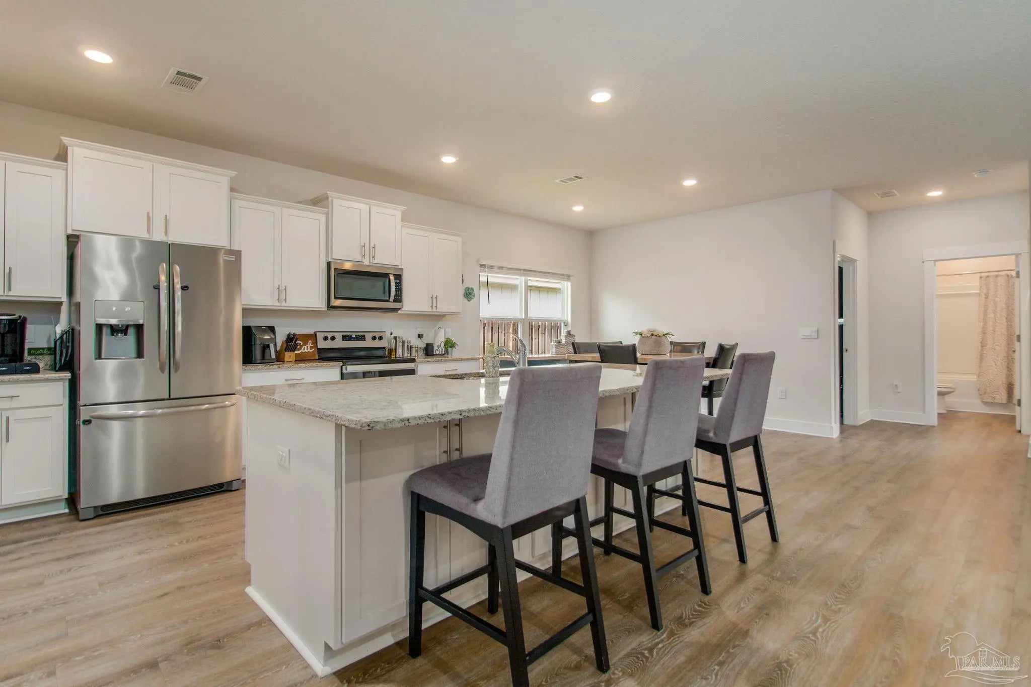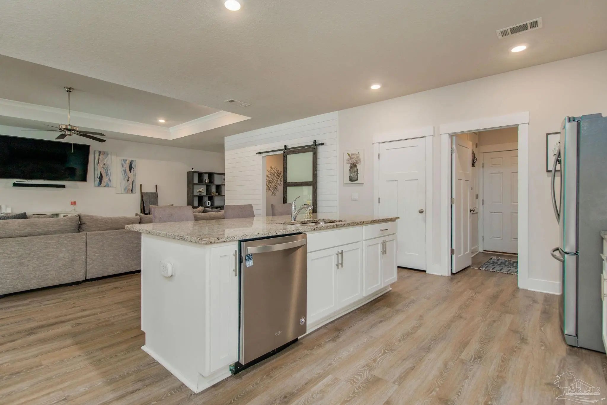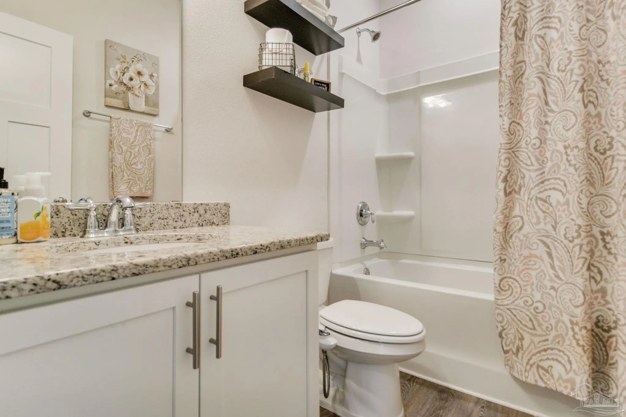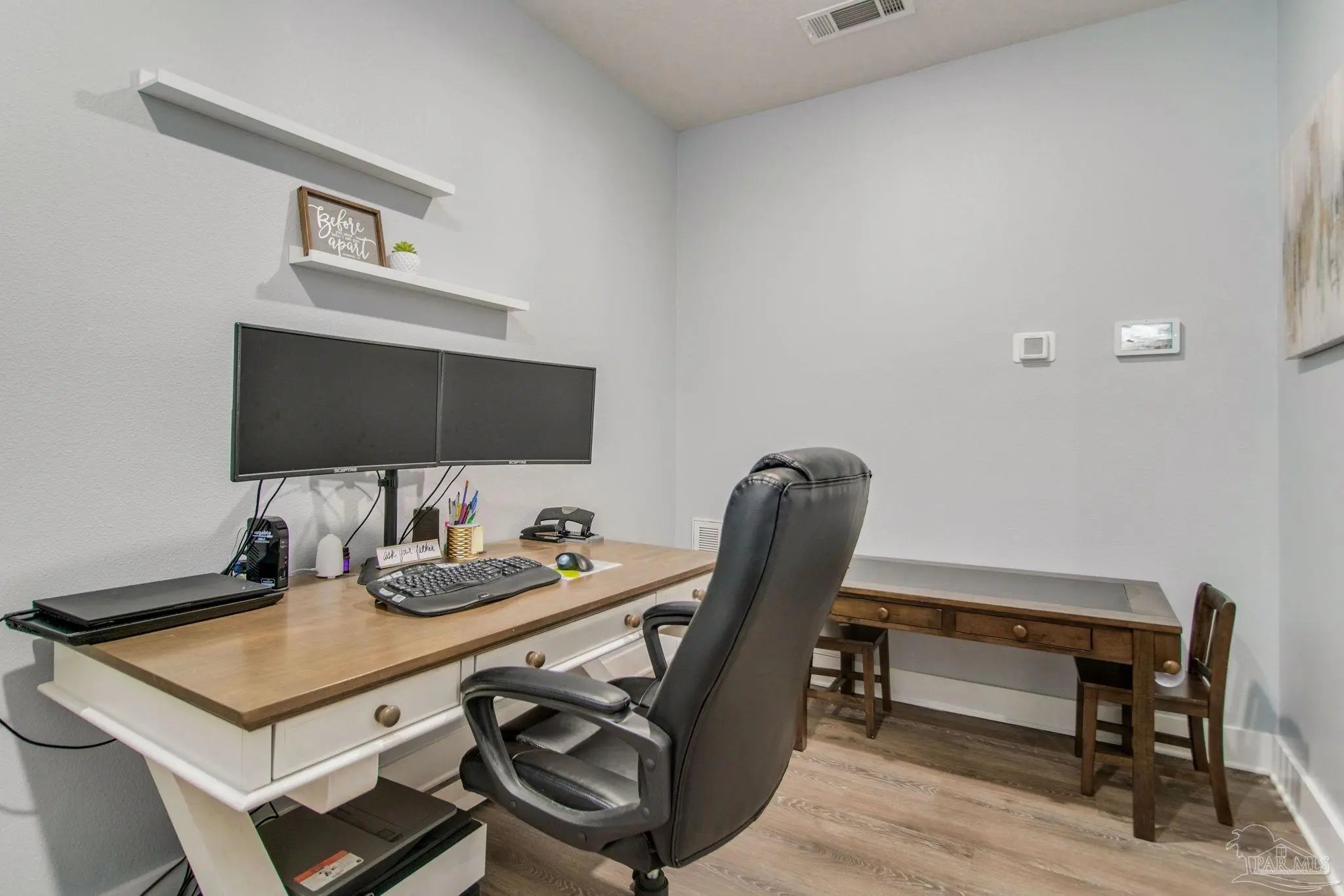 This delightful 4-bedroom, 3-bathroom POOL home offers a spacious 2,304 square feet of living space in Gulf Breeze, perfect for families or those who love to entertain. As you enter the home, you'll be greeted by an open floor plan that seamlessly blends comfort with style. The luxury vinyl plank flooring and shiplap walls add a touch of coastal flair, while the enclosed office with a sliding barn door provides a quiet space for work or study. The kitchen is a culinary enthusiast's dream, boasting granite countertops, crisp white cabinets, and gleaming stainless steel appliances. Whether you're whipping up a quick breakfast in the cozy nook or preparing a gourmet meal at the island, this kitchen has you covered. The primary bedroom is a true retreat, featuring an ensuite bath with a double vanity, walk-in closet with custom shelving, stand-up shower, and a garden tub that's practically begging for a bubble bath and a glass of wine. Outside, the inground saltwater pool is perfect for those hot Florida days. The fenced-in yard provides privacy and peace of mind, while the exterior Hardie board siding offers durability and low maintenance. And for all you car enthusiasts (or just those with a lot of stuff), there's a spacious 3-car garage. There is also a sprinkler system and well to make yard maintenance a breeze!! Located just a short distance from local attractions, you'll find the Lighthouse Private Christian Academy, Soundside Public Beach, and the Gulf Breeze Zoo nearby. Imagine spending your weekends alternating between beach days and animal adventures! This home isn't just about looks – it's practical too. With a termite bond in place, you can rest easy knowing your investment is protected. And let's not forget the charming front porch – the perfect spot for sipping sweet tea and waving to neighbors. So, if you're looking for a home that combines style, comfort, and a dash of coastal charm, look no further!! This is it! BE SURE TO CHECK OUT THE VIDE