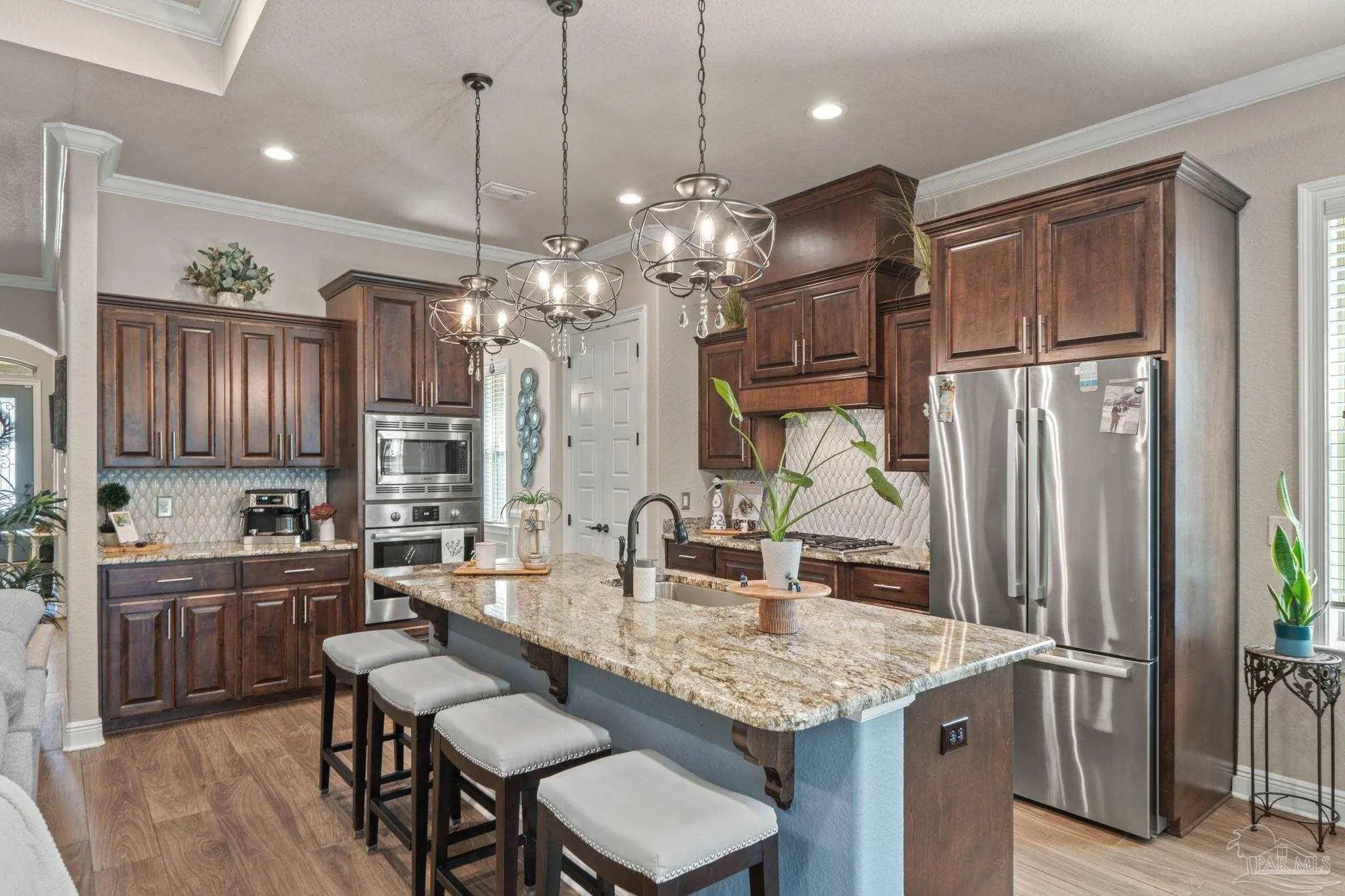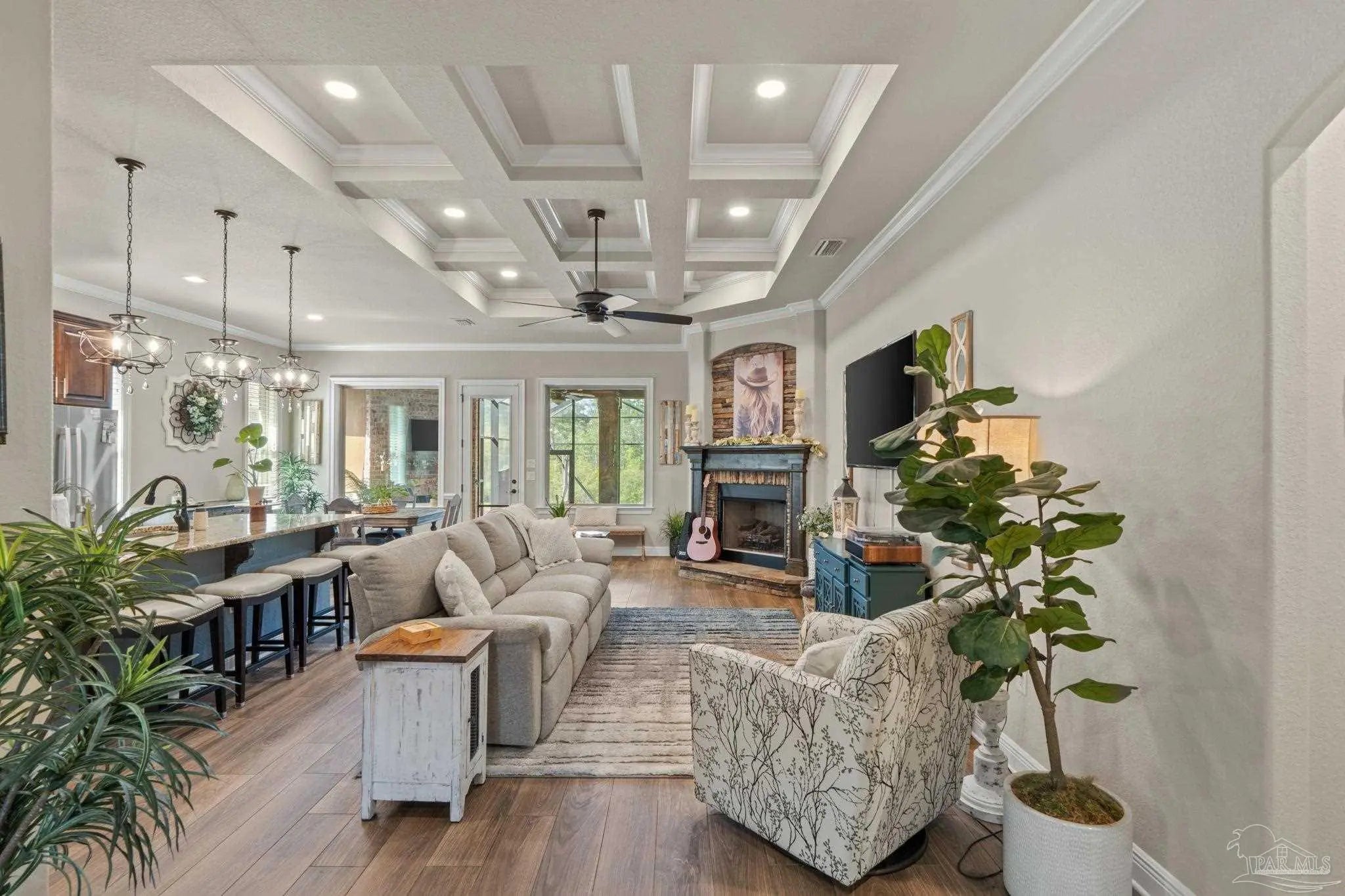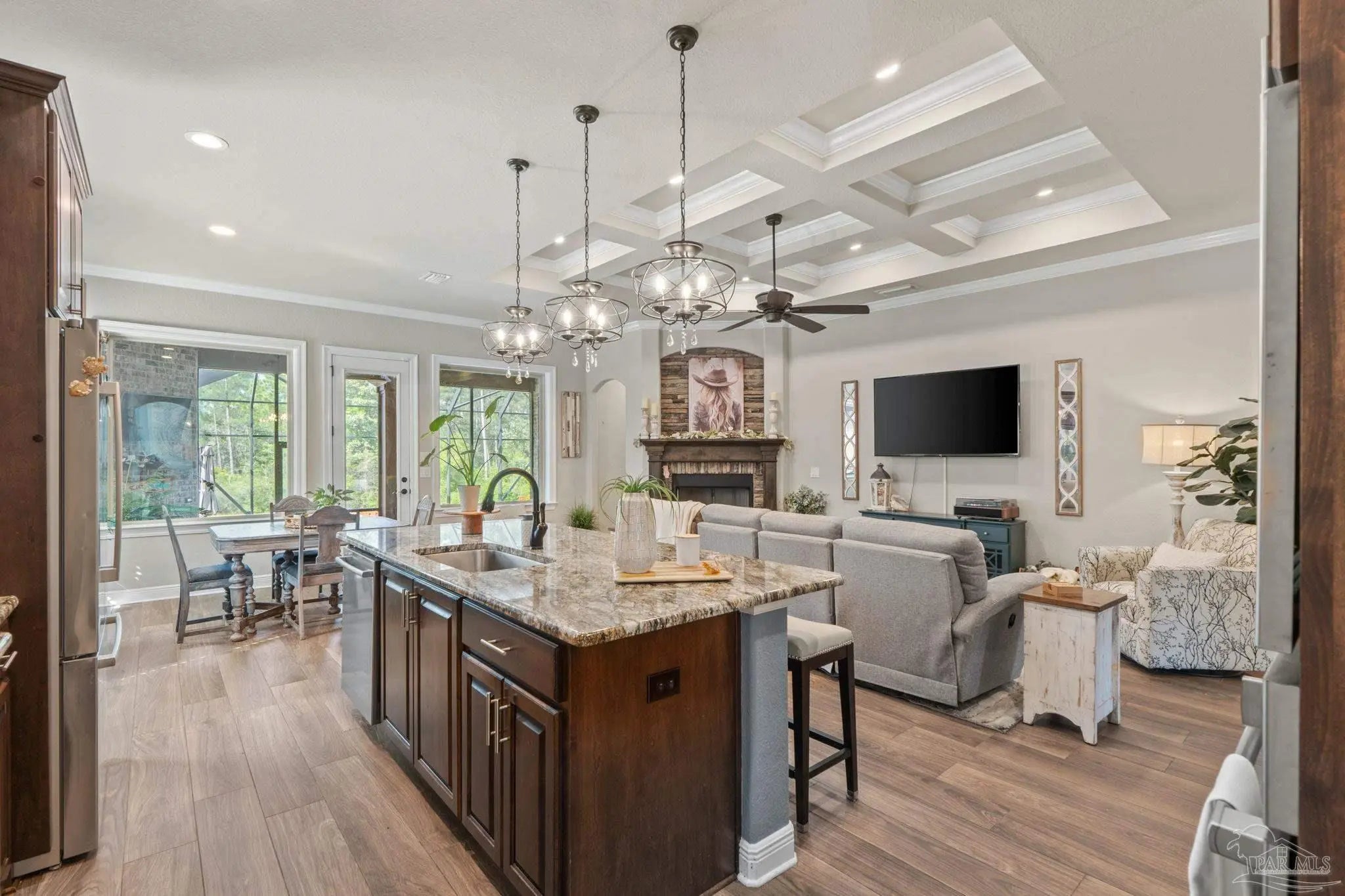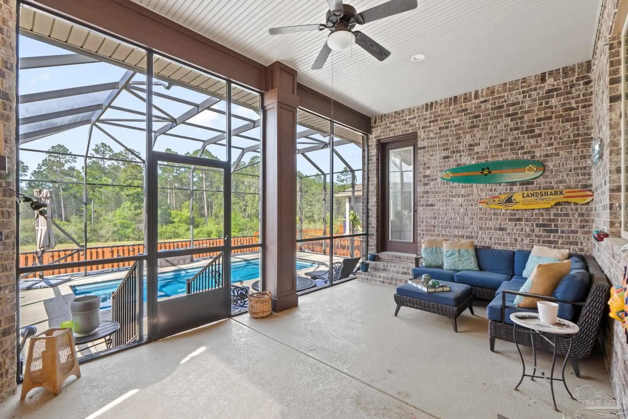 Gorgeous Custom Brick and Stone Pool Home in the Gated Huntington Creek Subdivision. This 3 bedroom, 2.5 bathroom home has an open floor plan with all the custom upgrades you can imagine. 10' Ceilings and 8' doors throughout with all windows and doors cased out. Boxed ceilings with custom woodwork detail and crown molding throughout. Oversized Master bedroom with trey ceiling and double crown molding, that leads into the main bathroom with double vanity, granite countertops, soaking tub with tile, and zero entry separate shower. Master closet off of the bathroom provides access to the laundry room and 1/2 bath. Chef's kitchen with Island and seating, Bosch gas cooktop, microwave and wall oven, custom espresso cabinets and a separate pantry. Kitchen overlooks the open floorplan living room with gas fireplace and breakfast nook as you walk out onto the large outdoor living room area with 2nd gas fireplace on the screened lanai before you enter the pool area that has a screened enclosure. The large fiberglass pool is easy to maintain saltwater and comes with a gas heater. Extra concrete pad out back perfect for corn hole or any entertainment, or future shed etc.. Garage has plenty of storage and epoxy floors. Yard is low maintenance and this property could be yours.