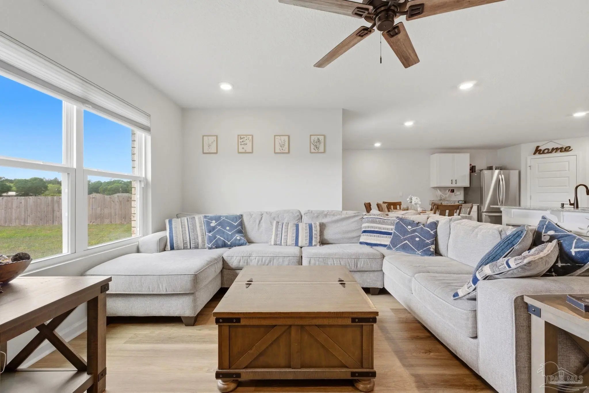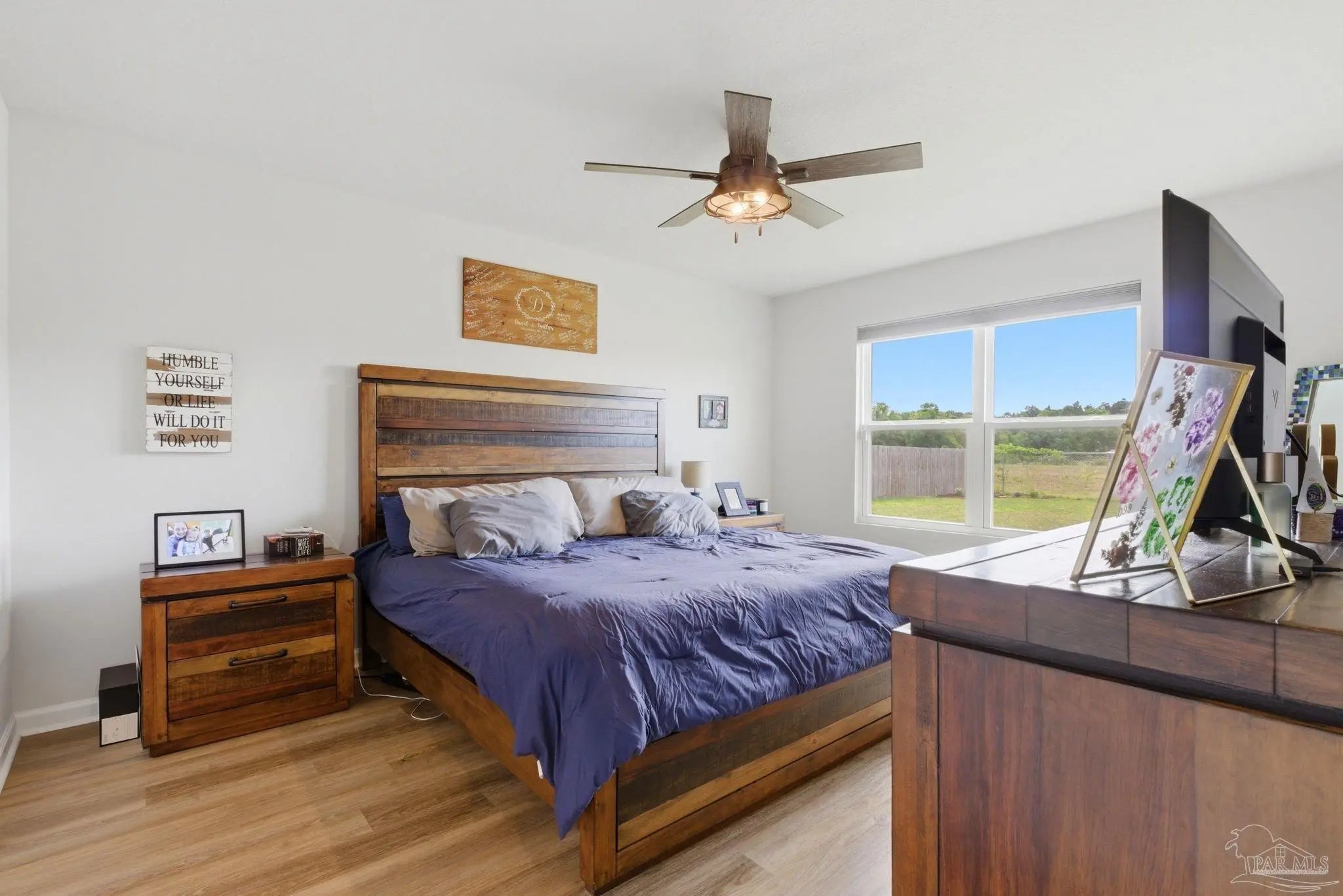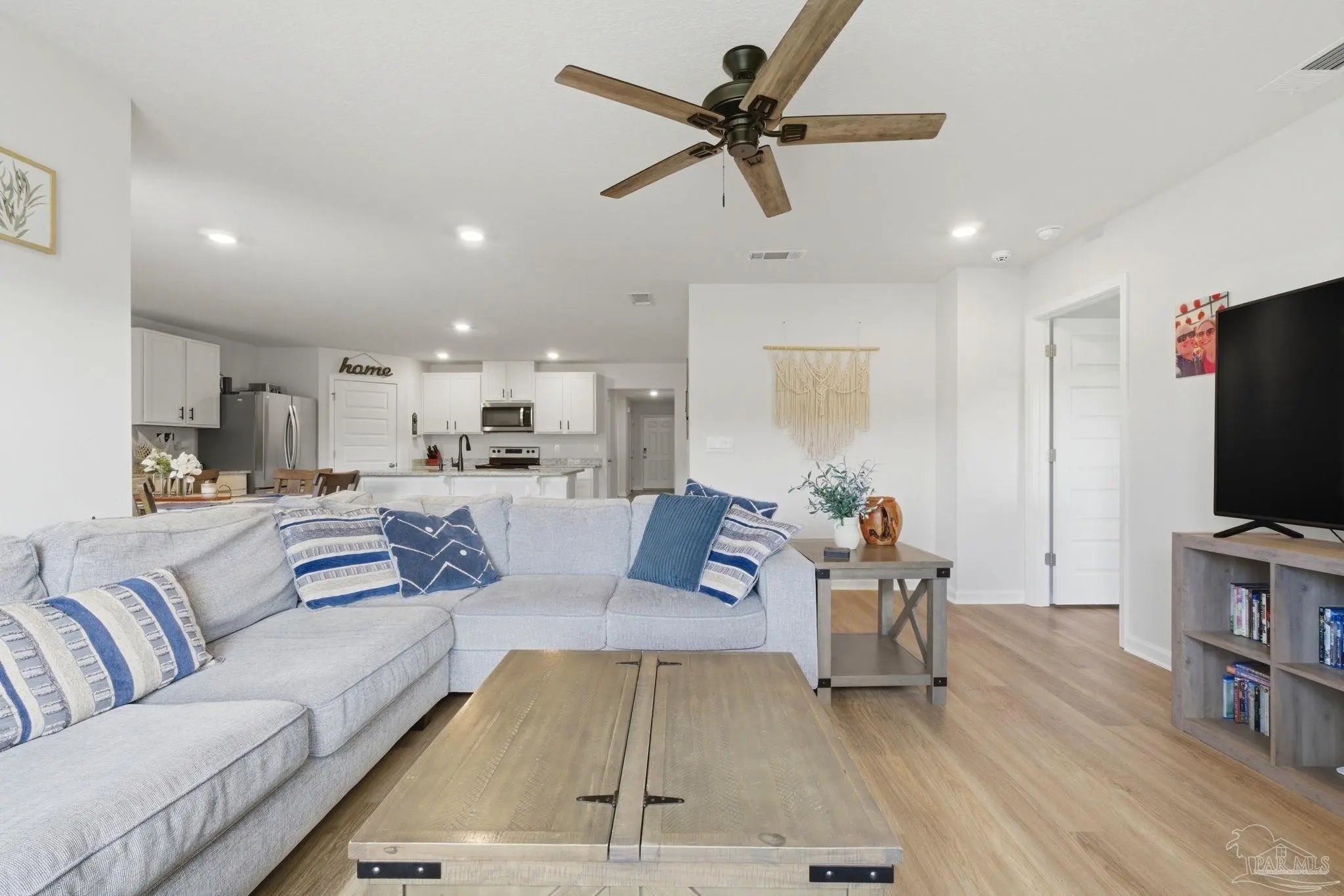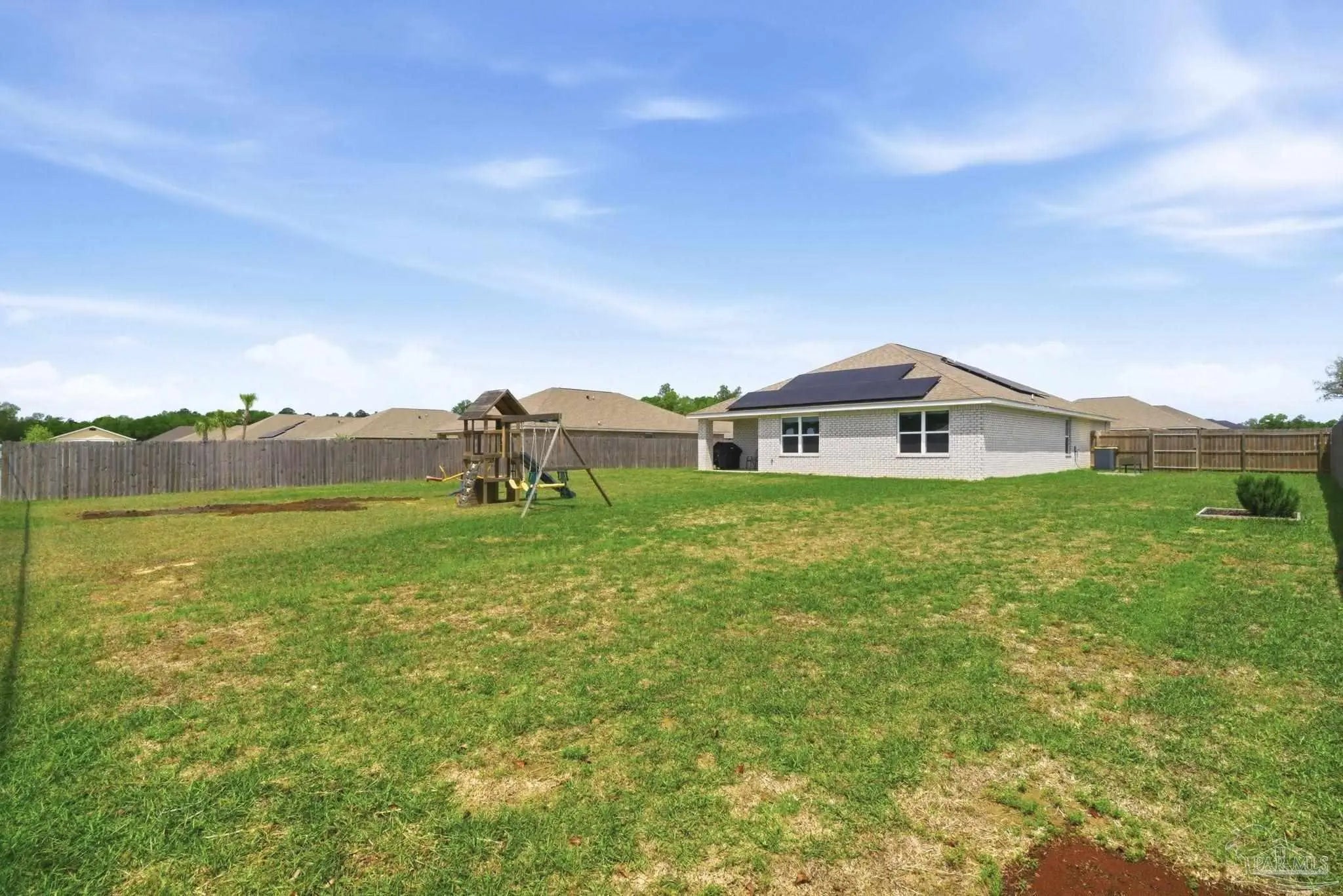 Move-in ready Cali floor plan located in Plantation Woods! Built in 2023, this 4-bedroom, 2-bath home offers 1,830 sq ft of open living space on a spacious 0.29-acre lot. The popular split floor plan features a large living area that flows seamlessly into the kitchen and dining space, complete with a center island, ample cabinetry, and modern finishes—perfect for entertaining or everyday living. The private primary suite includes a walk-in closet, double vanity, and walk-in shower, while three additional bedrooms provide flexibility for family, guests, or a home office. Enjoy outdoor living with a covered back patio overlooking the generous backyard. Additional features include a Smart Home Technology package with keyless entry and energy-efficient solar panels, offering added convenience and potential savings on utility costs. Located in the desirable Plantation Woods community with easy access to local shopping, dining, and schoo