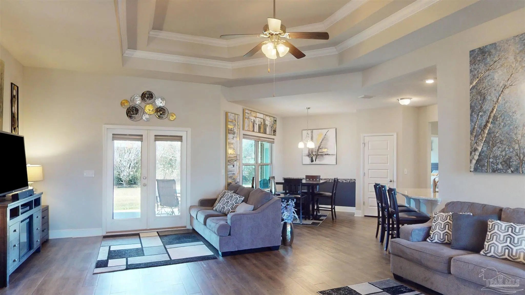 Beautiful GOLD FORTIFIED brick 3BR/2BA craftsman-style home with den/office in the gated Stonegate Estates community. This split floor plan offers an open great room with double tray ceilings, crown molding, and LVP flooring. The kitchen features granite countertops, stainless steel appliances, designer cabinetry, and a breakfast bar, flowing into a bright dining area. The primary suite includes a sitting area, tray ceiling, patio access, and an en-suite bath with dual vanities, garden tub, separate shower, and expansive walk-in closet. Two additional bedrooms share a full guest bath. Enjoy the covered back patio overlooking a spacious backyard equipped with sprinkler system, plus a double garage for parking and storage. New transferrable HVAC with two-year warranty. Stonegate Estates offers resort-style amenities including a clubhouse, fitness center, pool with waterfall, tennis and basketball courts, and ponds. Conveniently located between Foley and the beach with quick access to Hwy 59, Foley Beach Express, shopping, dining, and the Gulf Coast beaches. Buyer to verify all information during due diligence.
