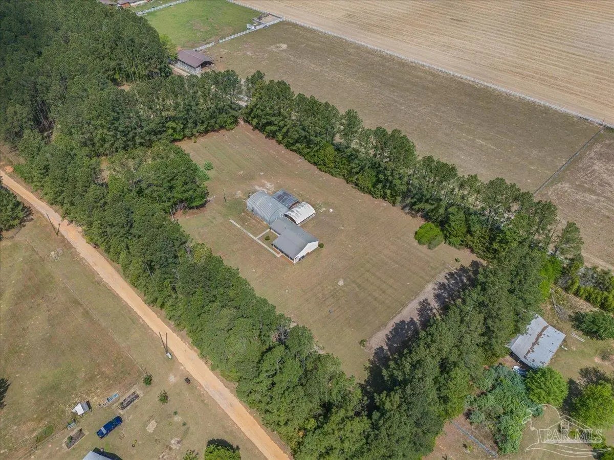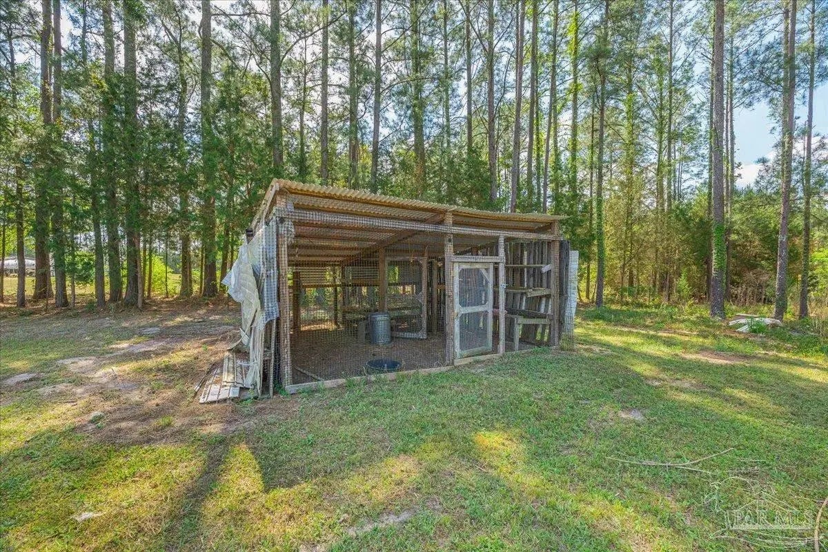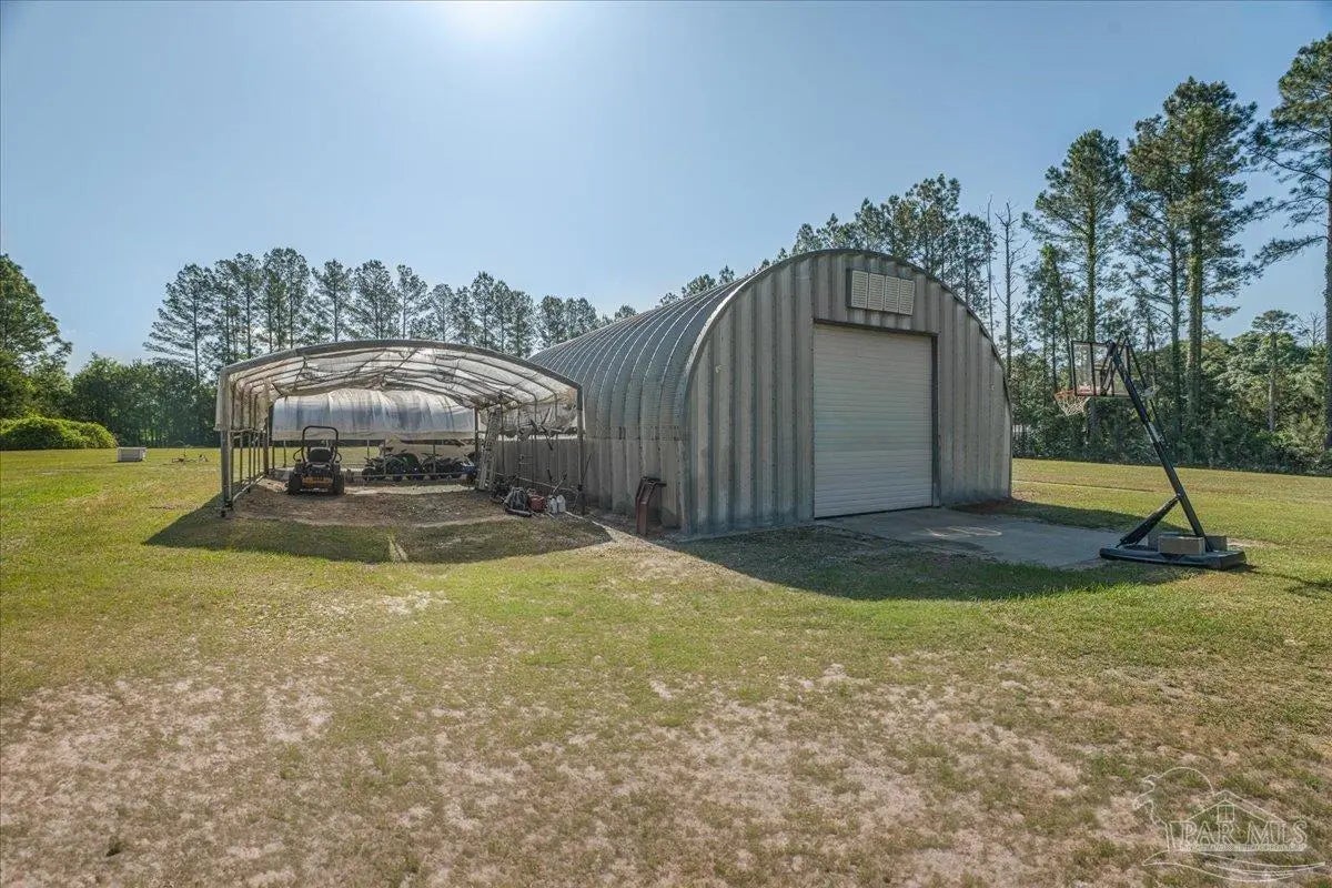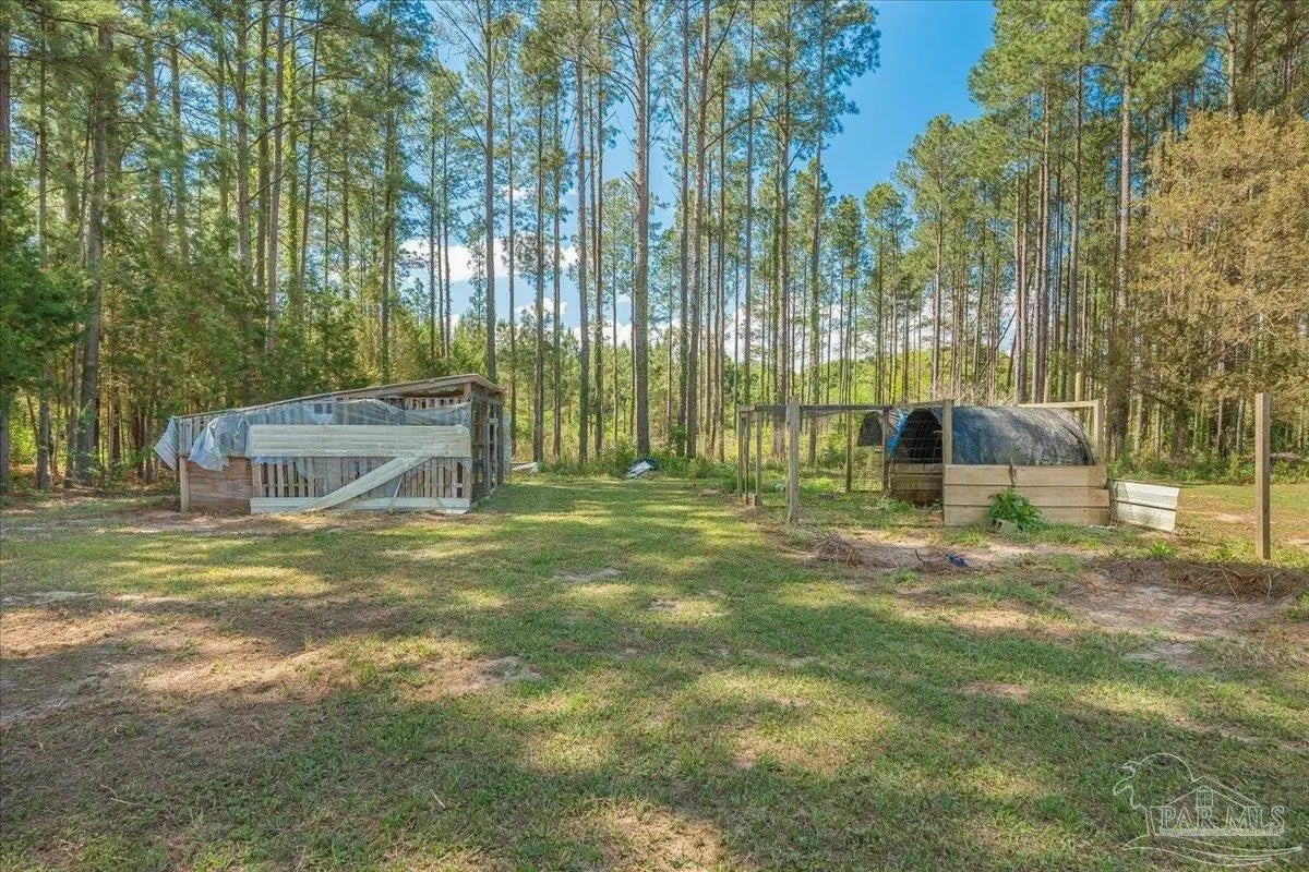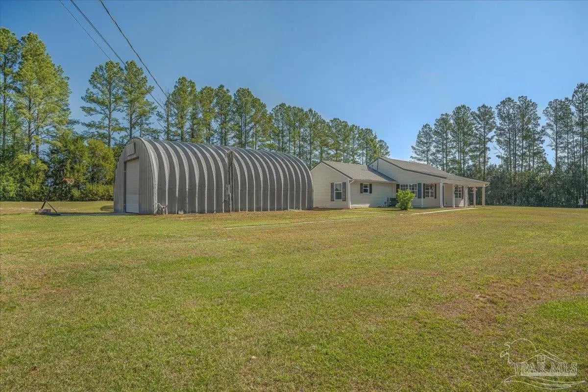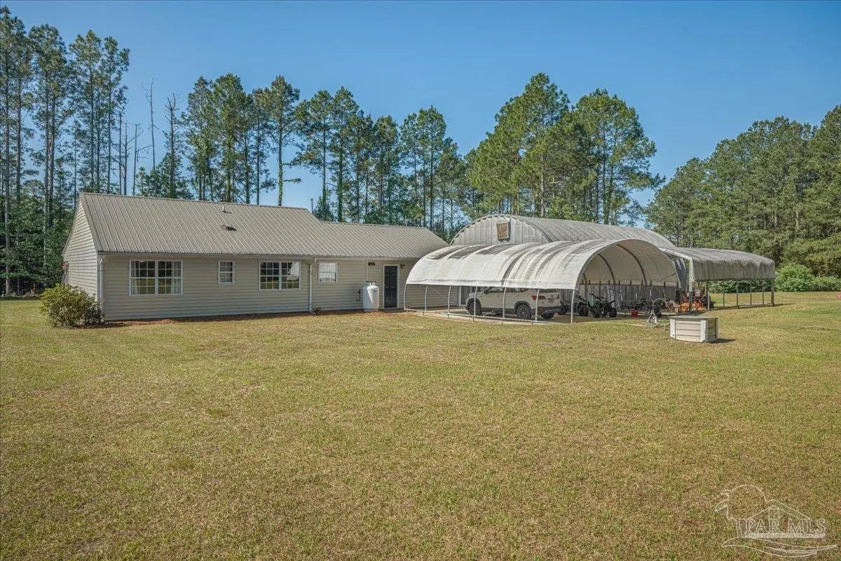 Discover the perfect blend of privacy, productivity, and rural charm with this exceptional mini farm opportunity set on nearly 9 acres. This unique property features established rows of producing blueberries, muscadine grapes, as well as mature peach and orange trees—ideal for those seeking a self-sustaining lifestyle or hobby farm.Designed with functionality in mind, the property includes a ready-to-use chicken pen and a hog pen located on the front acreage. The land is comprised of two parcels totaling 8.94 acres: the main homesite sits on 4.02 partially fenced/gated acres, while the additional 4.92-acre parcel near Hwy 87 offers partial fencing and a secondary access point, perfect for added convenience or future expansion. Surrounded by mature cedar trees, the home enjoys a private, serene setting with the potential to enhance seclusion even further. A 40' x 30' dome barn provides versatile space and includes a bonus mother-in-law suite with a full bathroom, loft storage, and durable construction designed for higher wind resistance. Additional features include two 20' x 20' dome carports—one positioned at the rear with a military-grade polyethylene cover, and another along the side of the barn for extra parking or equipment storage. The home itself is well-appointed with a metal roof and a spacious front porch—perfect for enjoying peaceful mornings. Inside, you'll find a welcoming layout with a large living room that flows into the dining area. The split-bedroom floor plan offers a front-facing guest bedroom and a generously sized primary suite at the rear, complete with a private bath. A third bedroom is located off the mudroom, providing additional space and flexibility. The open kitchen and dining area features stainless steel appliances and a gas stove, ideal for everyday living and entertaining. A mudroom and dedicated laundry room add to the home's practicality. Served by well water and thoughtfully laid out for country living, endless possibilities.